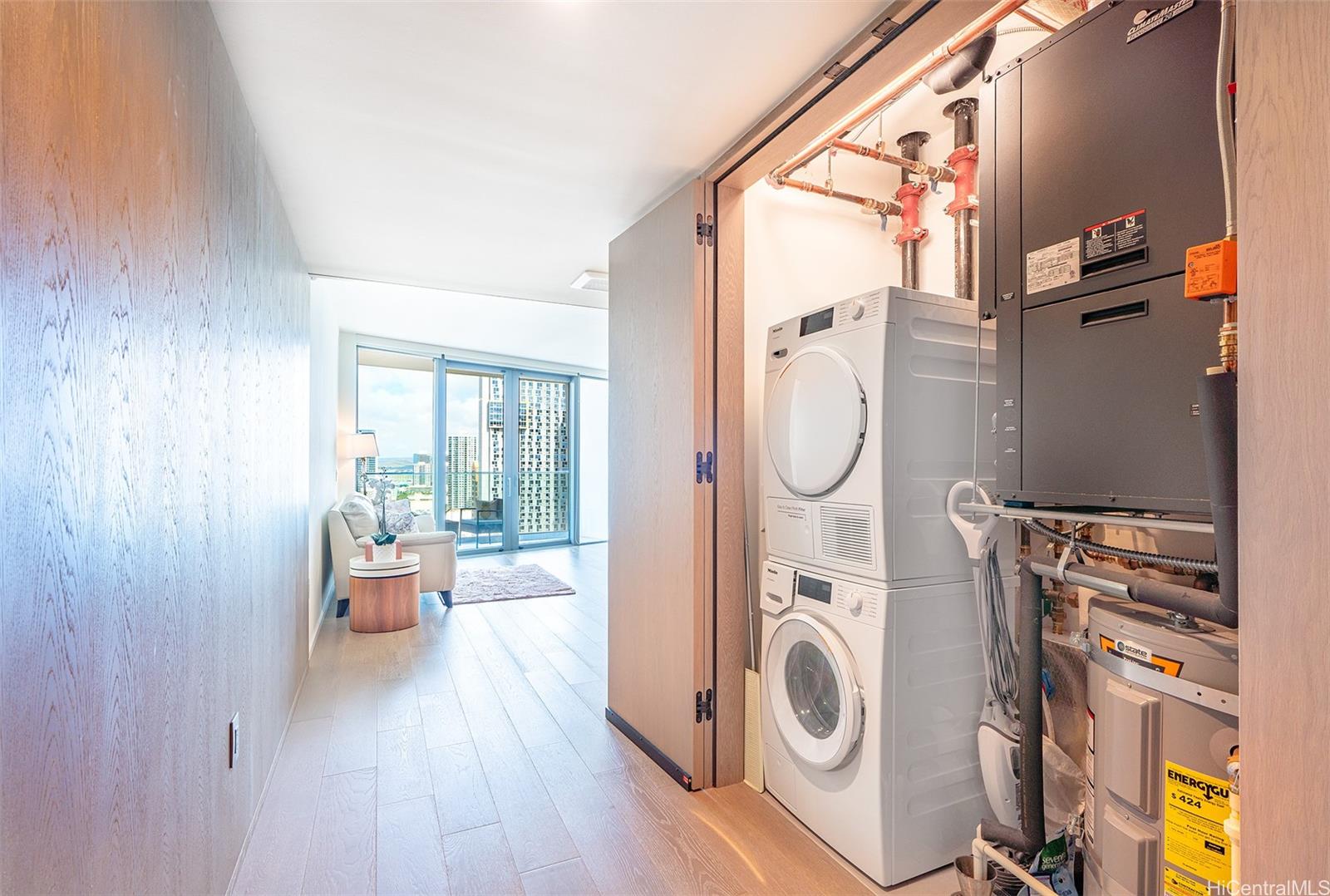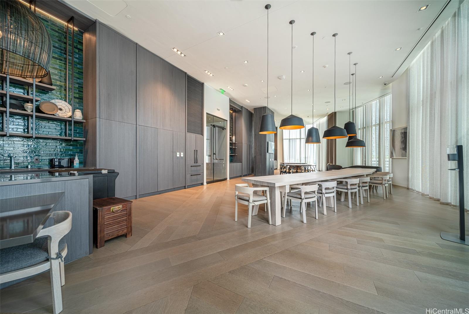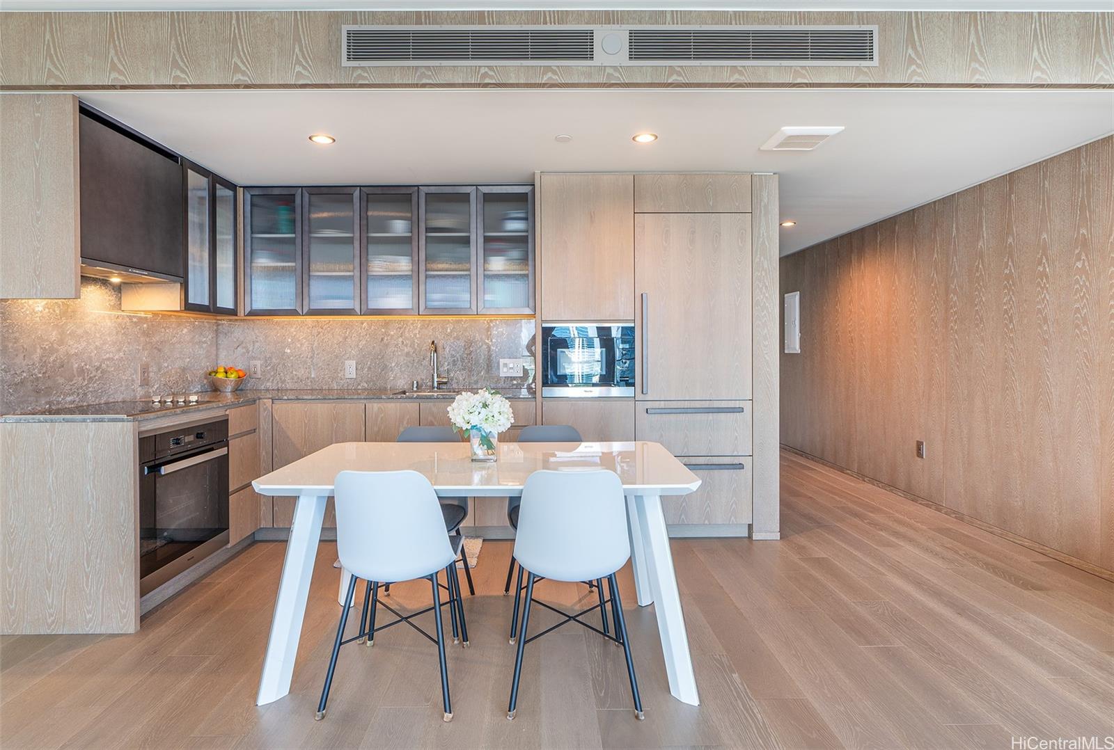 [0] => Experience modern Island living at Ko’ula, where contemporary design meets world-class amenities in the vibrant Ward Village community. Located mere moments away from Ala Moana Beach Park, South Shore Market, Whole Foods, and endless dining and entertainment options, this is urban living at its finest. This beautifully designed unit features engineered wood flooring, custom wood cabinetry, natural stone countertops, and premium Miele appliances. The bathroom includes a double vanity, tub/shower combo, and walk-in closet, while central AC ensures year-round comfort. A full-size parking stall near the elevator and ample guest parking add extra convenience. Ko’ula offers resort-style amenities, including a lap pool, dual whirlpool spas, sauna, indoor and outdoor fitness center, multiple BBQ pavilions, playground, private dining rooms, and 24/7 security and concierge service.