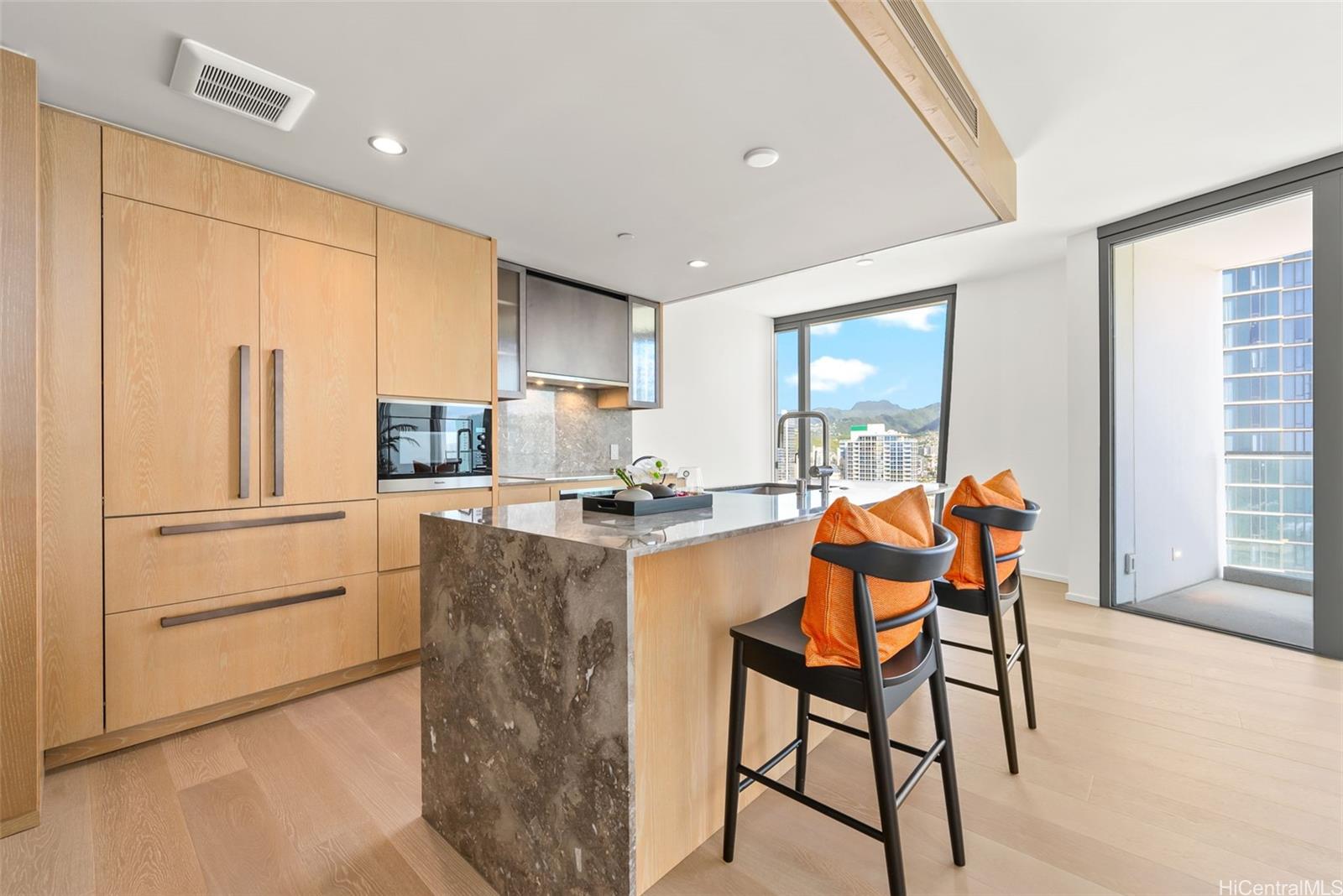 A highly sought-after high-floor northeast-facing unit at Koula, NEVER BEEN OCCUPIED, perfectly positioned to capture refreshing natural breezes and postcard views of Diamond Head, the ocean, and the mountains- offering a full panoramic range. Featuring 2 bedrooms, 2 bathrooms, 2 lanais and 2 side-by-side parking stalls, this residence reflects the visionary design of Jeanne Gang, paired with sophisticated interiors by Yabu Purshelberg, creating an unmatched blend of luxury and elegance. The open-concept living space is adorned with floor-to-ceiling windows, allowing the natural light to illuminate the space and highlight the stunning scenery. The modern kitchen is equipped with premium Miele stainless steel appliances. Enjoy over an acre of outdoor amenities including a 25-yard lap pool, two whirlpools, a sunset lounge and bar, barbecue cabanas, a fitness pavilion, a great lawn and a children's play area. Indoor amenities including private dining rooms, catering kitchens, a state-of-the-art fitness center with treatment room, guest suites & more. Located in the heart of Ward Village community, just steps away from shops, trendy restaurants, Whole Foods, and Ala Moana Beach Park. Listing by: Compass (808) 825-4277