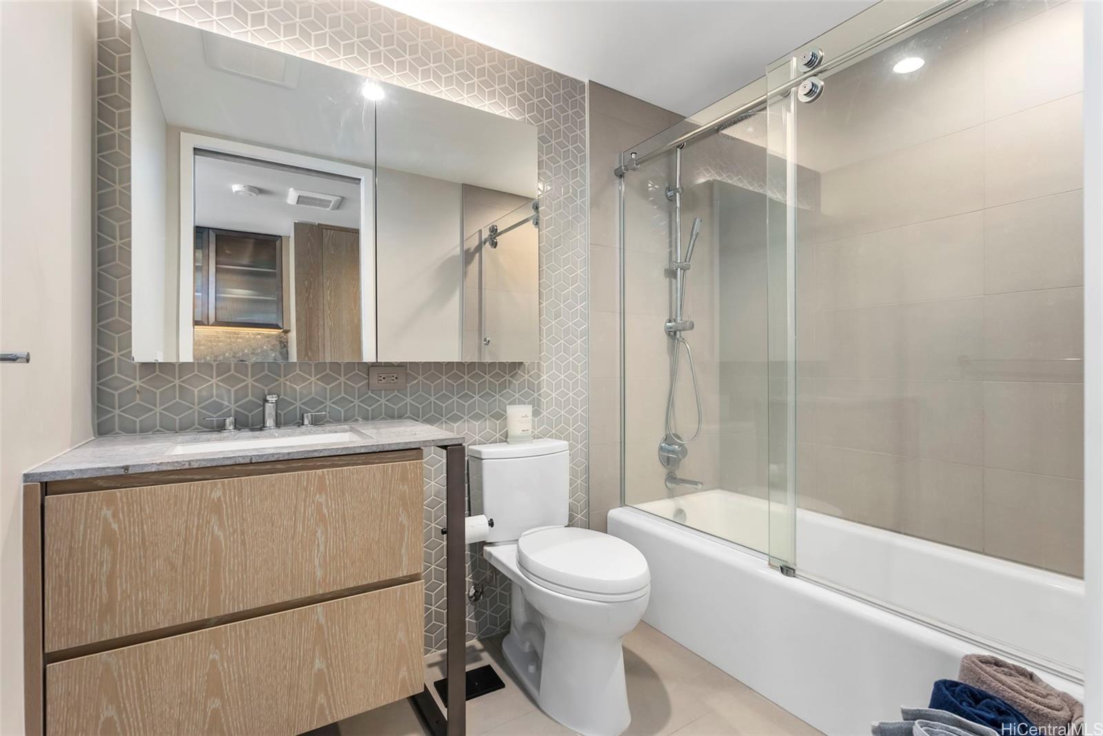 Experience luxury and convenience with this modern studio unit at Ko’ula featuring natural stone countertops, Miele appliances, custom cabinetry, beautiful hardwood floors, 9 foot+ ceilings, floor to ceiling windows, a Juliet balcony, and Miele washer & dryer in unit! Located on the cooler side of the building with natural light, custom pull down blinds, and a convenient full sized parking stall located on the same floor as unit (no elevators needed to get to unit)! Ko’ula’s resort style amenities include an expansive lap pool, 2 jacuzzis, sauna rooms, bbq pavilions, indoor/outdoor entertainment rooms with full kitchens, indoor/outdoor fitness areas, multiple guest suites for visiting family and friends, grand lanai with lounge seating and billiards table, playground, 24-hr security and more! Building is VA approved and is FULLY insured! The Ward Village ecosystem provides ultimate convenience including Ward Theater, Victoria Ward Park, Kaka'ako farmers market, award winning restaurants, bars, shops, and close to the beach. Must be willing to take on current lease which ends mid-July 2026. Current rent is $2,850/month. 1 photo has been virtually staged(enhanced). Listing by: REMAX Hawaii (808) 738-3600