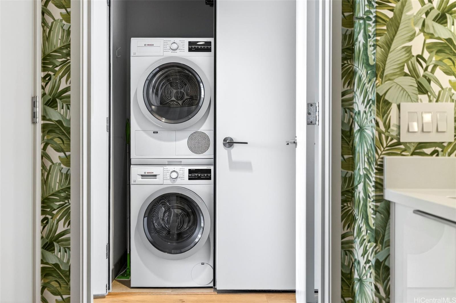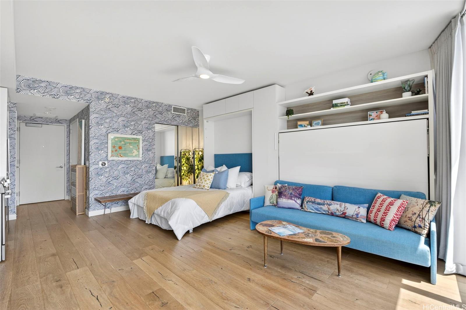 Experience the ultimate flexible living space at Ae'o in a studio that lives larger than its compact footprint suggests. At the heart of this thoughtfully designed unit are two convertible wall beds that quietly transform the space, effortlessly creating functional zones to maximize comfort and cleverly providing abundant storage. This adaptable space features stunning ocean views, Bosch appliances and laundry, a TOTO washlet, and your very own private electric vehicle (EV) charger for exclusive on-demand fast charging. Ae'o residents enjoy top-tier amenities, including guest suites, a fitness center, wet steam room / dry sauna, dog park, multiple pools, cabanas and grills, and private gathering spaces. In addition to convenient access to Whole Foods, in Ward Village you're just minutes away from O'ahu's best dining, shopping destinations including Ala Moana Center and Ala Moana Beach Park. Welcome home! Listing by: BHGRE Refined (808) 348-1555
