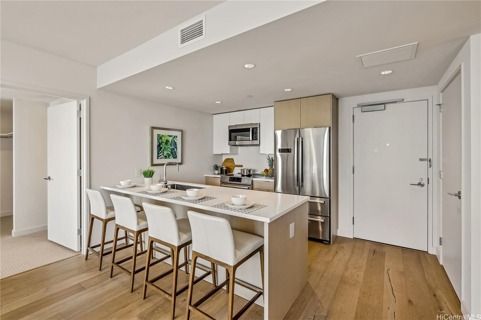 string(1130) "This immaculate, modern residence boasts floor-to-ceiling windows that offer breathtaking panoramic ocean and city views from every room. Bright and airy unit features elegant quartz countertops, Bosch appliances, motorized shades, a wall-mounted TV, and a walk-in closet in the primary bedroom. Both bathrooms are equipped with soaking tubs, double sinks, and TOTO Washlets. The residence includes super-convenient spacious tandem parking stalls located next to the elevators on the Mezzanine level, and a storage locker for additional space. Enjoy direct access to Whole Foods Market from Ae'o, enhancing your convenience and lifestyle. Resort-style amenities, including a Rooftop Sky Terrace, two pools, Jacuzzi, a fully equipped gym, a sauna, steam room, BBQ cabanas, private party rooms, theater, guest suites, a karaoke room, playground, dog park, and more. Its prime location provides easy access to renowned restaurants, shops, movie theaters, Ala Moana Beach Park, Kewalo Boat Harbor, and Ala Moana Shopping Center. Embrace the vibrant Kakaako lifestyle and enjoy the ultimate in modern living at this stunning residence."