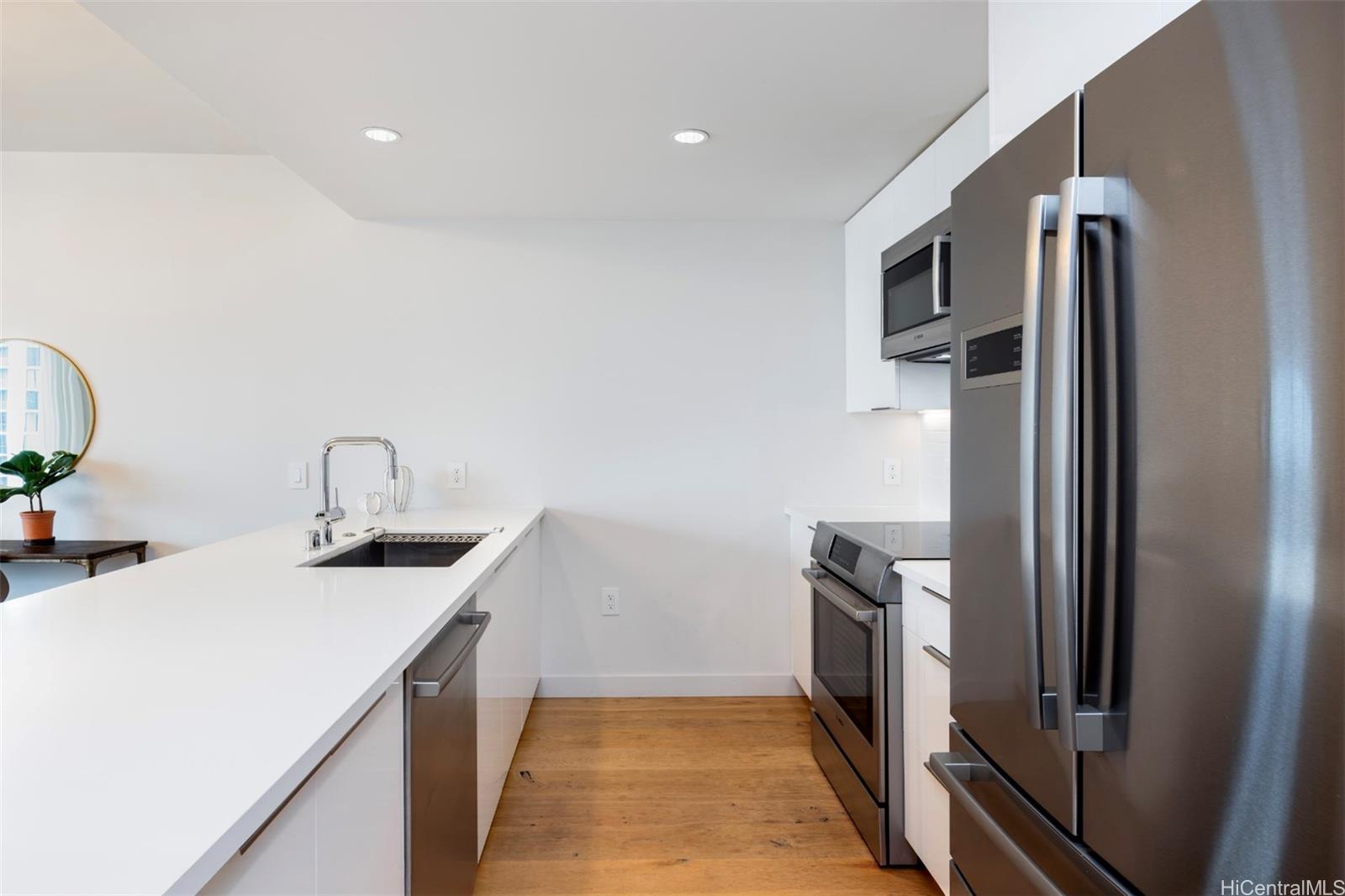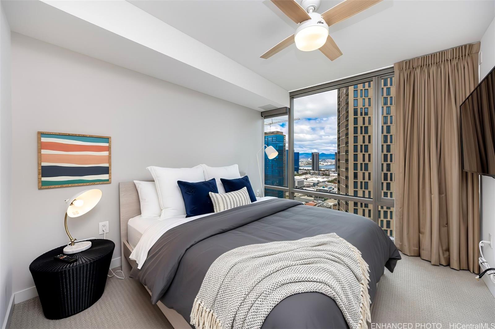 Discover Ae'o at Ward Village, one of Honolulu's newer luxury residences in an award-winning master planned community. This high-floor 1 bedroom, 1 bathroom floor plan offers a bright, open-concept primary living area with partial Pacific Ocean and Koolau Mountain views. The bedroom space also enjoys partial Pacific Ocean and Mountain views and includes a walk-in closet. A designer bathroom features a modern design with a double vanity and a soaking tub. Ae'o features a full-suite of resort-style amenities including multiple swimming pools, barbecue areas, exercise gym, kid's play area, recreation spaces, theater room, and an iconic ocean view sky terrace on the top level. Its superb location puts you alongside a flagship Whole Foods, blocks from sandy beaches at Ala Moana Beach Park, nearby shops, casual and fine-dining, entertainment, and much more. Enjoy Hawaii's "Work, Play, Live" lifestyle at Ae'o. Listing includes enhanced, virtually staged and zoomed-in photos. Listing by: Sachi HI Pacific Century Prop. (808) 596-8801