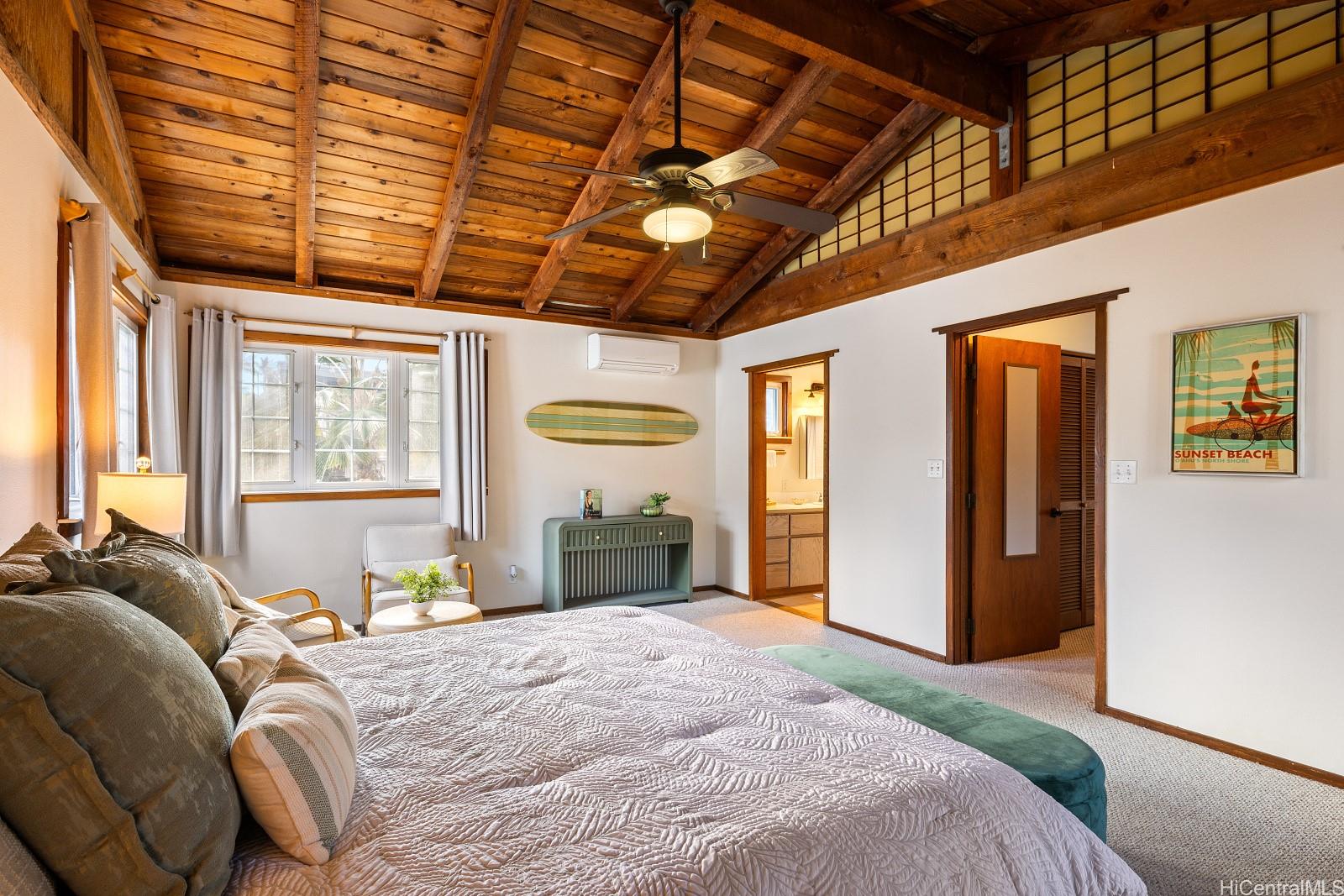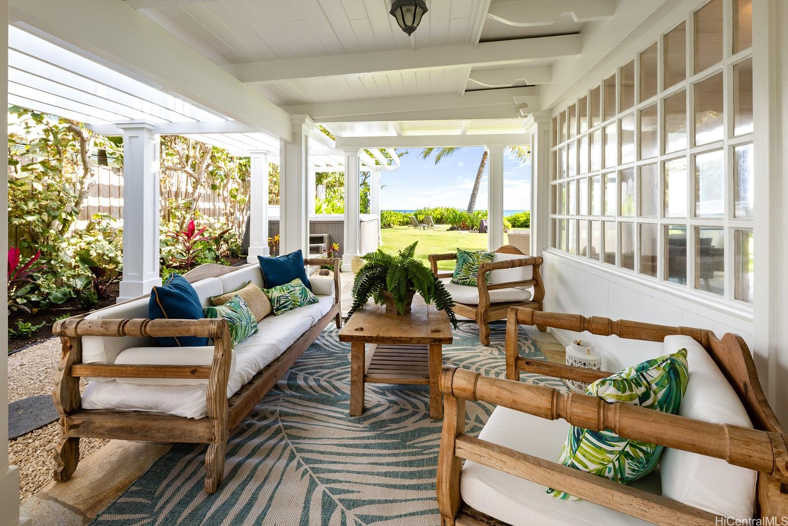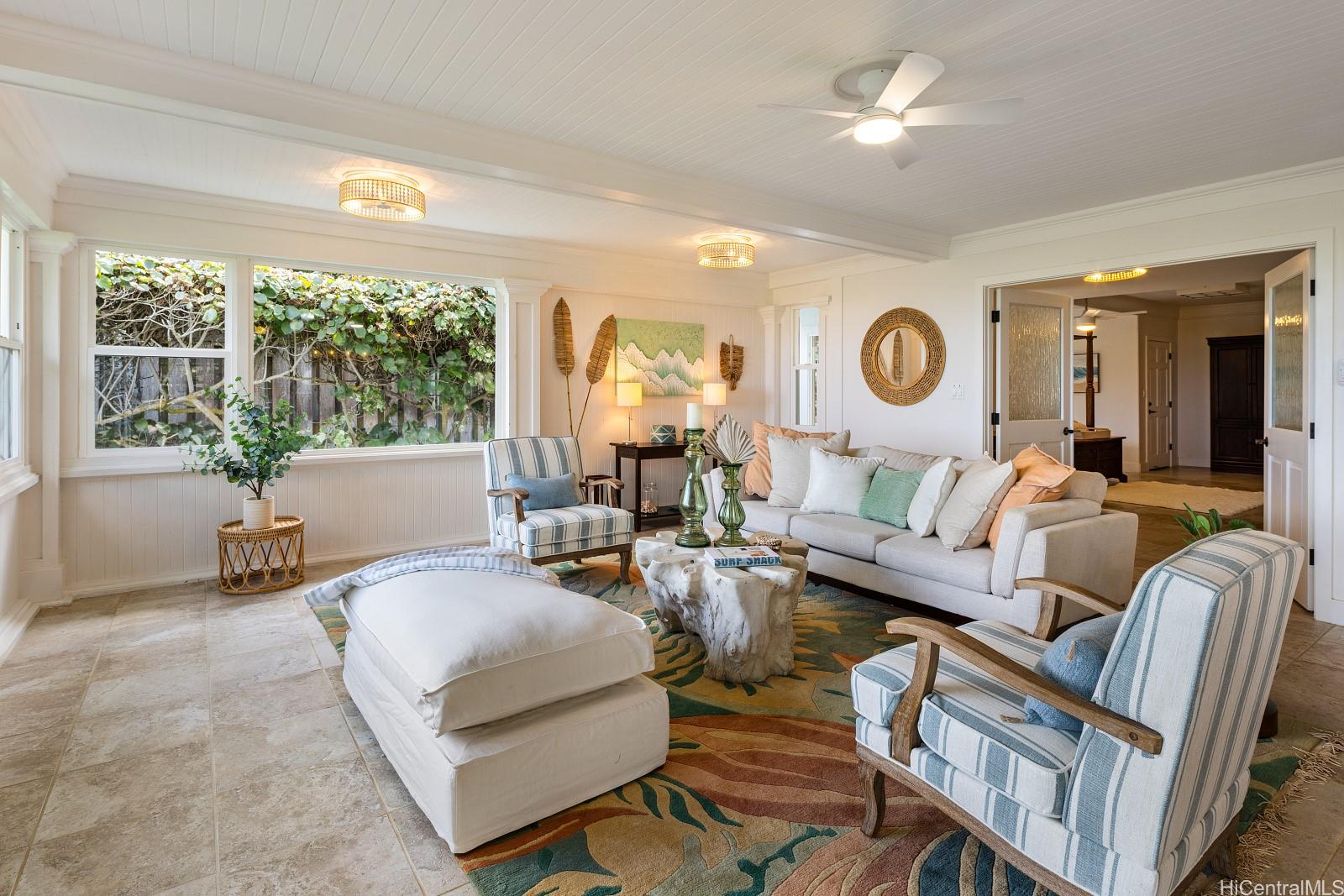 The property offers ten bedrooms and nine bathrooms, including six en suites for comfort and privacy. With two full kitchens, the residence is ideal for large gatherings, retreats, or multi-generational living. The spacious layout is designed for connection and comfort rather than formality—its high ceilings, open interiors, and casual flow make it the quintessential Hawaiian beach house. The natural foliage provides just enough seclusion to ensure complete privacy while still offering unobstructed access to the ocean—a rare combination along any beachfront stretch.