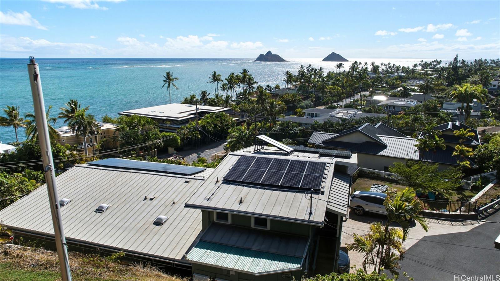 Exceptional Lanikai opportunity. Positioned just above the Lanikai entry, this elevated home enjoys sweeping ocean and Mokulua Islands views while remaining an easy stroll to the beach. The setting is private and lush, with terraced lava rock walls, tropical landscaping, and a flat back lawn perfect for entertaining or relaxing. FEMA flood zone X. This classic two-story Hawaiian beach home has been beautifully refreshed with a new kitchen, new flooring, new fixtures including two Toto bidet toilets, and split A/C in every room. Energy efficiency and comfort are built in with 32 owned solar panels, 3 Tesla Powerwall batteries, EV charger, new hot water heater, and new electrical panel. Additional highlights include new Lutron lighting throughout, a new second-floor deck with ocean views, upgraded windows, new plumbing, a Wi-Fi sprinkler system, and a security alarm. Actual square footage differs from tax records. Inquire about the pending opportunity to acquire adjacent City of Honolulu roadway parcels that could significantly expand the land area. Showings by appointment only Listing by: Coldwell Banker Realty (808) 596-0456
