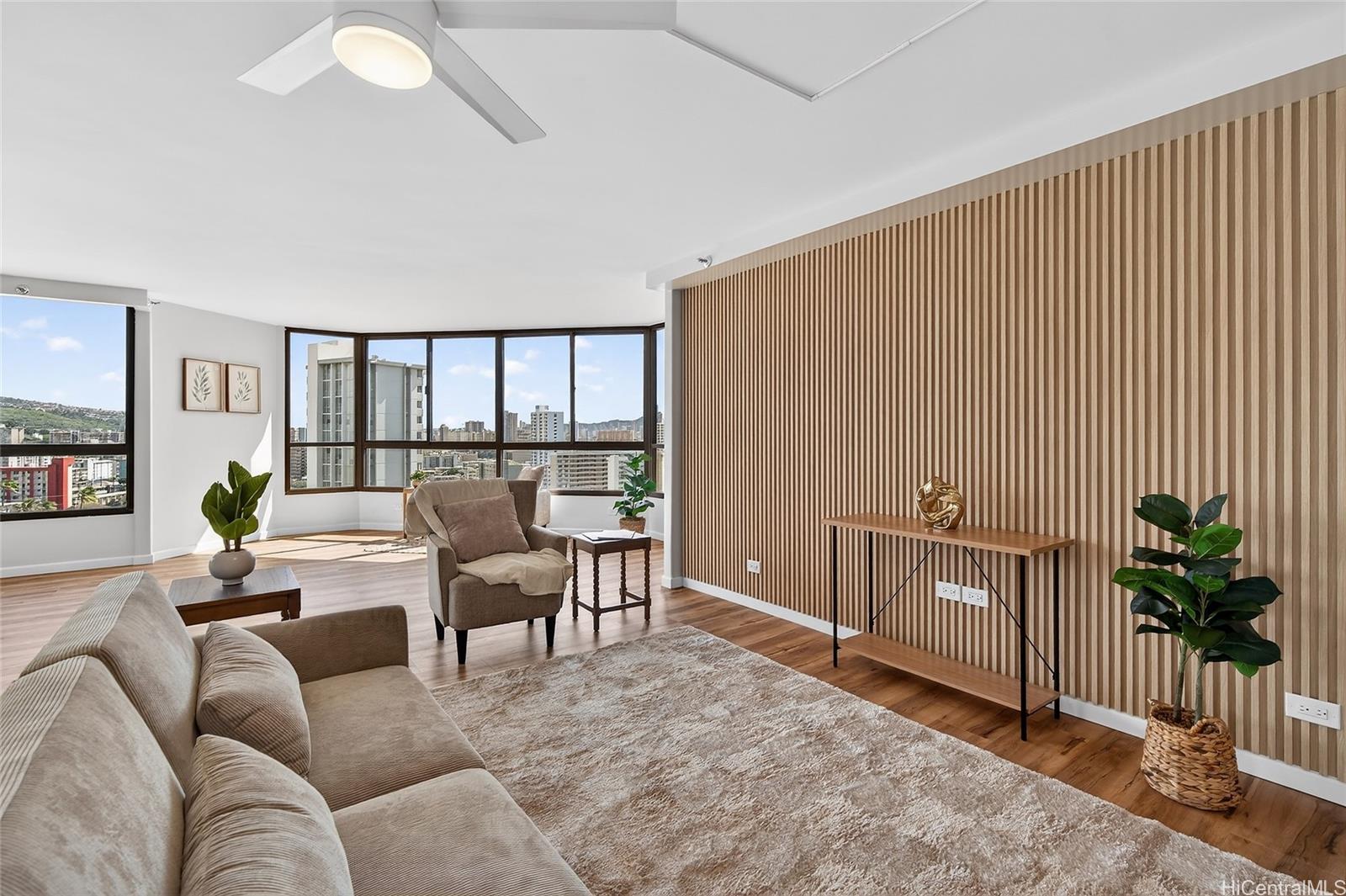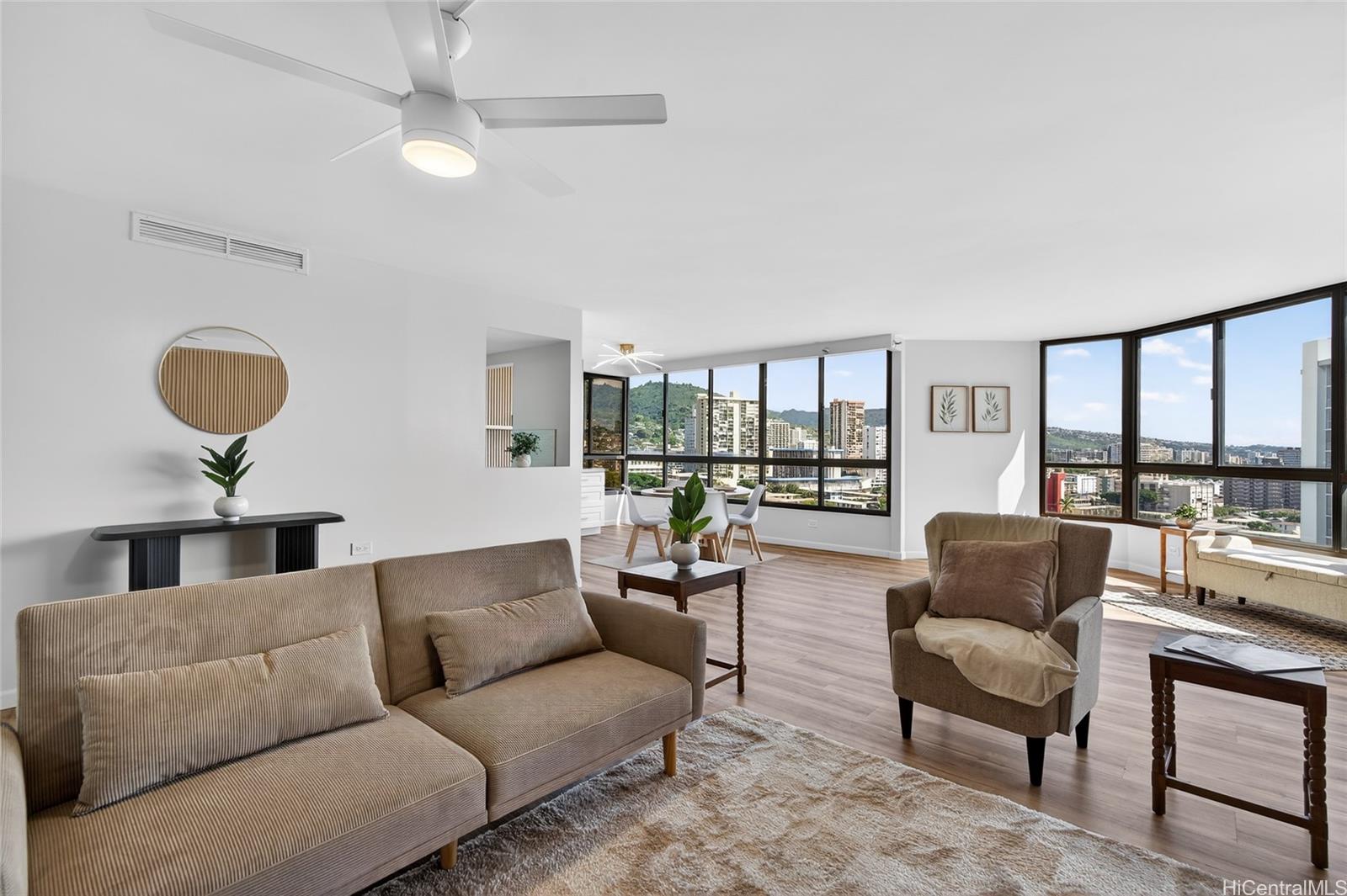 Beautiful, newly renovated, and remodeled high-floor residence with stunning 180-degree views and an exceptional floor plan. This bright and spacious unit features modern finishes throughout and is designed to maximize light, view, and comfort. Enjoy two (2) covered parking stalls plus extra storage, a rare and valuable combination. The building offers resort-style amenities including a swimming pool, jacuzzi, sauna, fully equipped fitness center, putting green, and more - perfect for both relaxation and active living. Centrally located with easy access to Downtown Honolulu, Kaka'ako, Waikiki, shopping, dining, beaches, and freeway access. A fantastic opportunity to own a move-in ready, high-floor unit in one of Honolulu's most convenient locations. Listing by: Coldwell Banker Realty (808) 738-3904