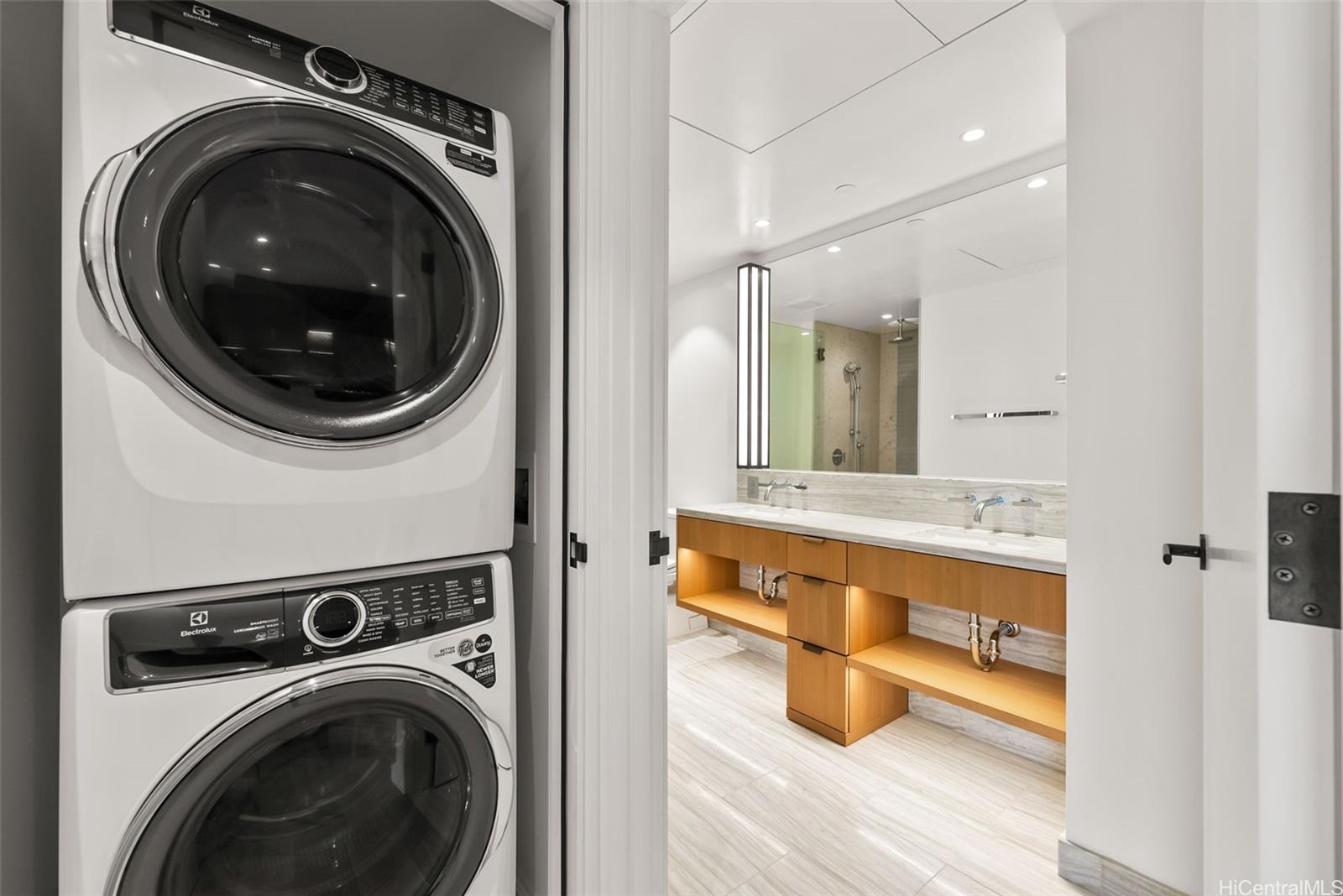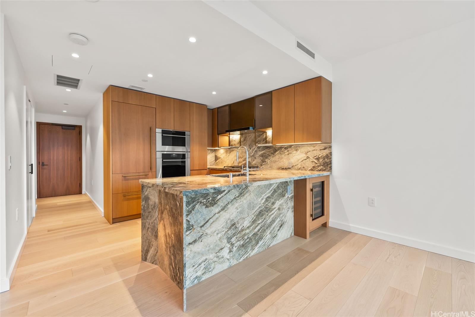 Luxury one bedroom residence at Victoria Place, the newest front row building in Ward Village. This beautifully designed home showcases ocean, harbor, park and sunset views. High end finishes include: Studio Becker cabinets, Wolf and Subzero appliances, gas stove, wine fridge and Electrolux washer/dryer. Wood flooring throughout with natural stone counter and tiles. Upgrades include motorized shades and a custom closet system. Enjoy resort-style amenities including three swimming pools, Lauhala Pool House for private gatherings, spa with hot tub, cold plunge, steam and sauna rooms, private dining, chef's kitchen, wine cave, theater, meeting rooms, barbecue pavilions, and guest suites. Experience the best of Kaka‘ako living. Listing by: Fortune Hawaii Realty LLC (808) 652-2882