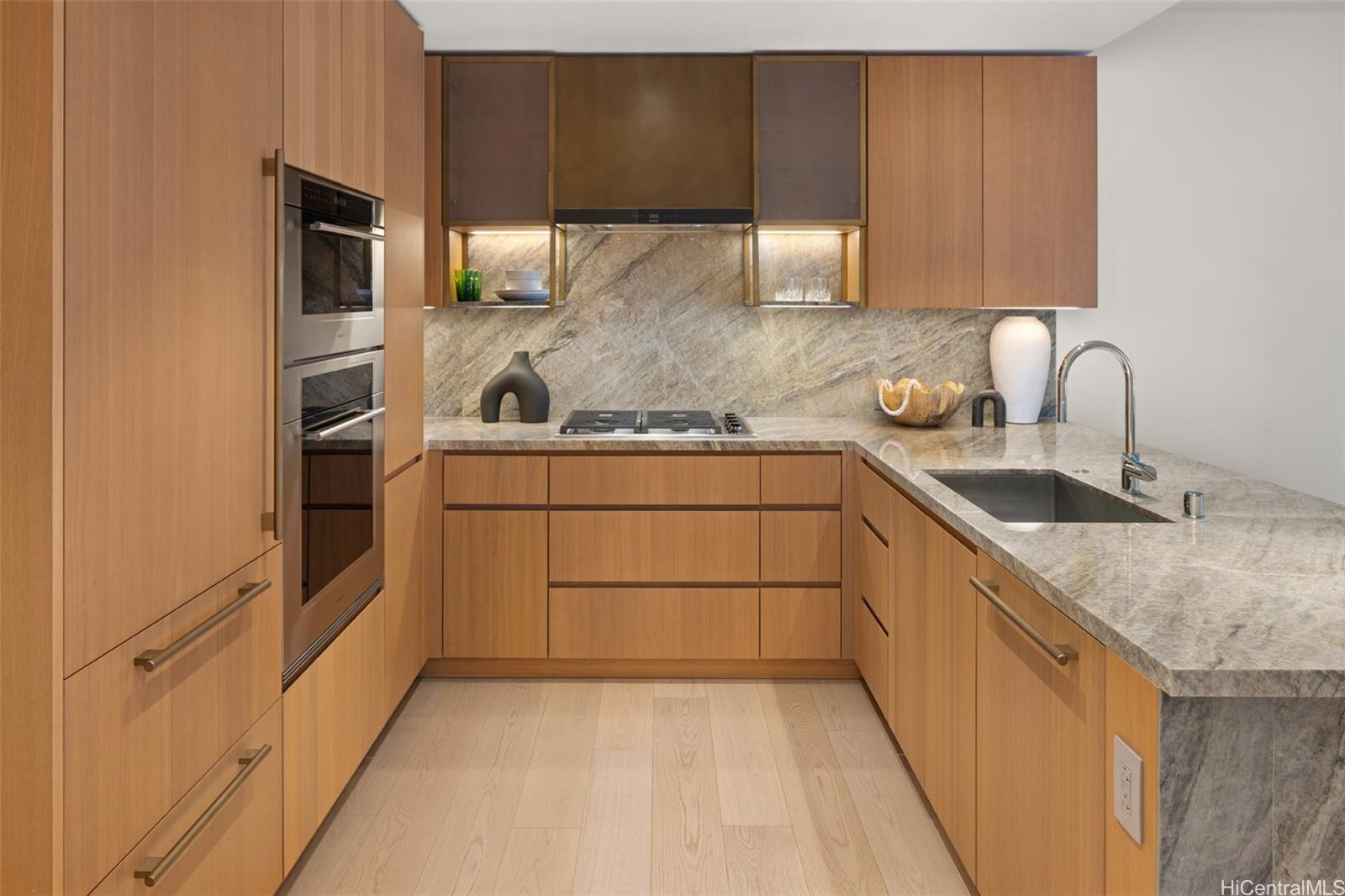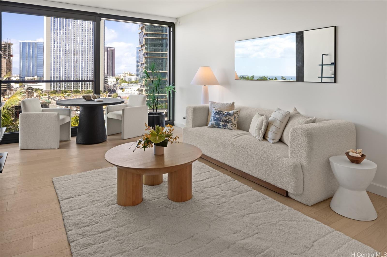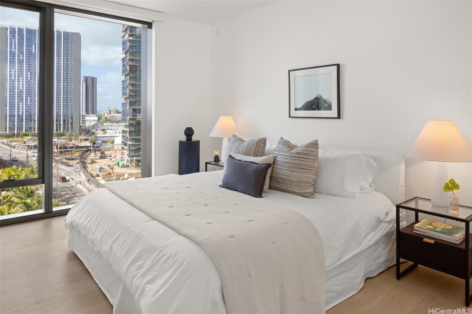New Turn-Key Listing at Victoria Place, Ward Village. Beautiful, fully-furnished 1-bedroom, 1-bath residence with one reserved parking stall, overlooking the lush amenity deck. Located in Victoria Place, the newest luxury building developed by Howard Hughes Corporation within the Ward Village master-planned community. The residence features custom cabinetry by Studio Becker, a Sub-Zero refrigerator, and Wolf gas range, oven, and microwave. This 350-unit front-row development was designed by Solomon Cordwell Buenz and offers resort-style amenities, including lap and lounge pools with ocean views, a wine cave, spa, hot and cold plunge pools, fitness center, movie theater, and 24/7 concierge and valet services. Listing by: Hawaii Life (808) 221-8889