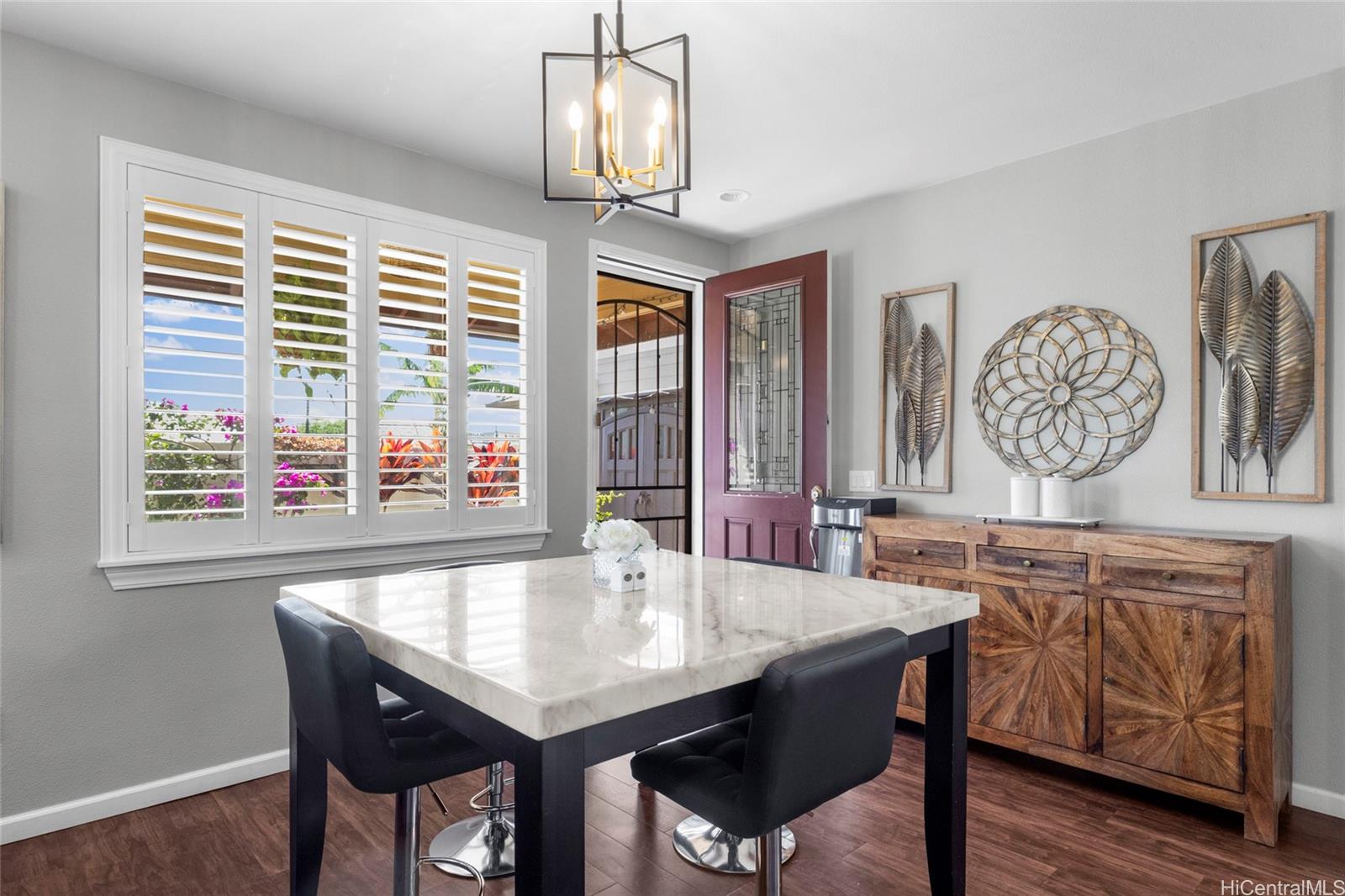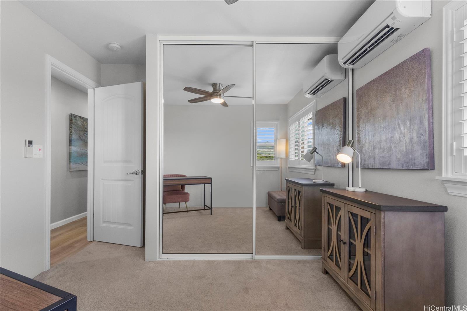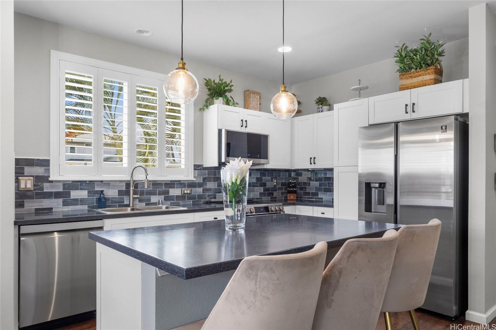 string(676) "Beautifully maintained 3-bedroom, 2.5-bath home in the desirable Kukuna at Mehana community. Situated in a quiet cul-de-sac near schools, shopping, and dining in Kapolei. Features include split A/C units in every room, vinyl plank flooring downstairs, and new carpet upstairs.  The open-concept kitchen offers stainless steel appliances, while the beautifully upgraded bathrooms add a modern touch. Plantation shutters throughout the home enhance style and energy efficiency. The 22 owned solar panels with two Tesla batteries help reduce utility costs. Enjoy a vinyl-fenced backyard ideal for pets and entertaining, with convenient guest parking located adjacent to the home."