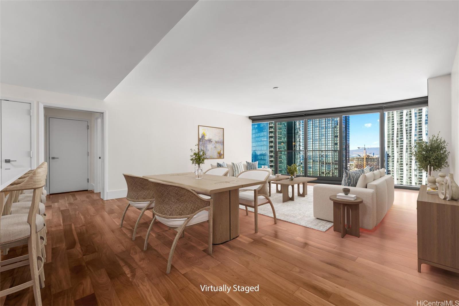 [0] => Exceptional 2-bedroom, 2-bath residence in Ward Village, a master-planned community attracting both local and global residents with its blend of urban convenience and modern refinement. This larger 2 bedroom condo offers an open-concept floor plan, ideal for entertaining, and features high ceilings throughout. The chef’s kitchen is equipped with Miele appliances, including a gas range and wine refrigerator, and a breakfast bar with upgraded pendant lighting. Additional features include a separate laundry room with built-in shelves, upgraded wood floors in the bedrooms, motorized shades throughout and an air-conditioned storage room (on the 5th floor). Enjoy stunning views of the ocean by day and twinkling city lights by night from almost every room. Residents have access to world-class amenities, including a glass-bottom pool, whirlpool, tennis court, golf simulator, BBQ cabanas, a chef's kitchen and dining room, gym, theatre, guest suites and other amenities that rival white-glove condos in other global luxury markets. Conveniently located within minutes to Whole Foods, beaches, the marina, Urgent Care and hospitals, shopping and dining.