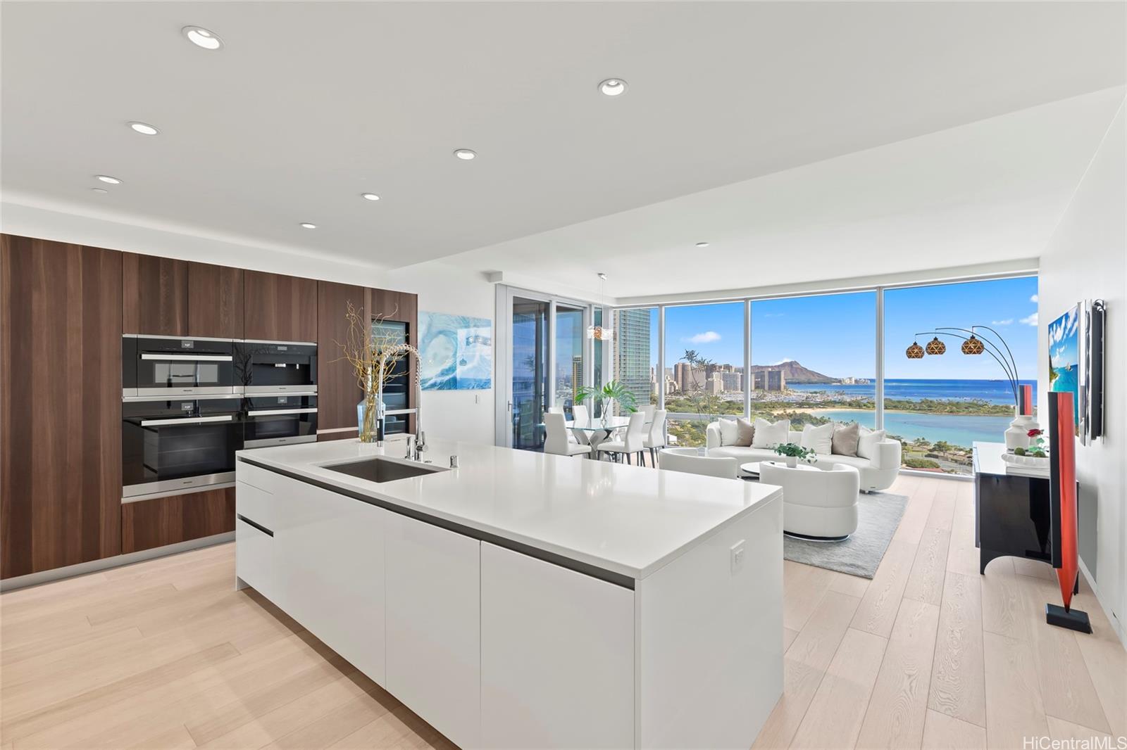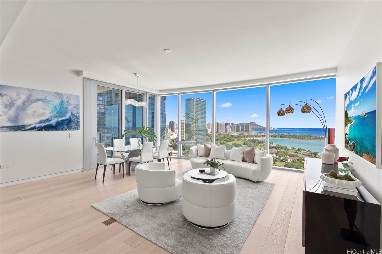 Discover unparalleled luxury at Waiea, the flagship tower of Ward Village. This coveted east-facing 3-bedroom, 2.5-bath residence offers stunning four-directional views of Diamond Head, the Pacific Ocean, Marina, lush mountains, and the vibrant Honolulu skyline.