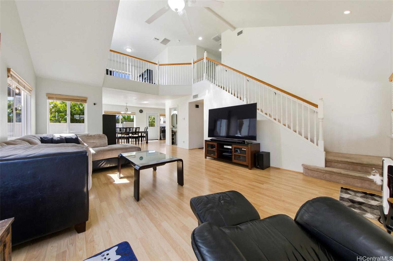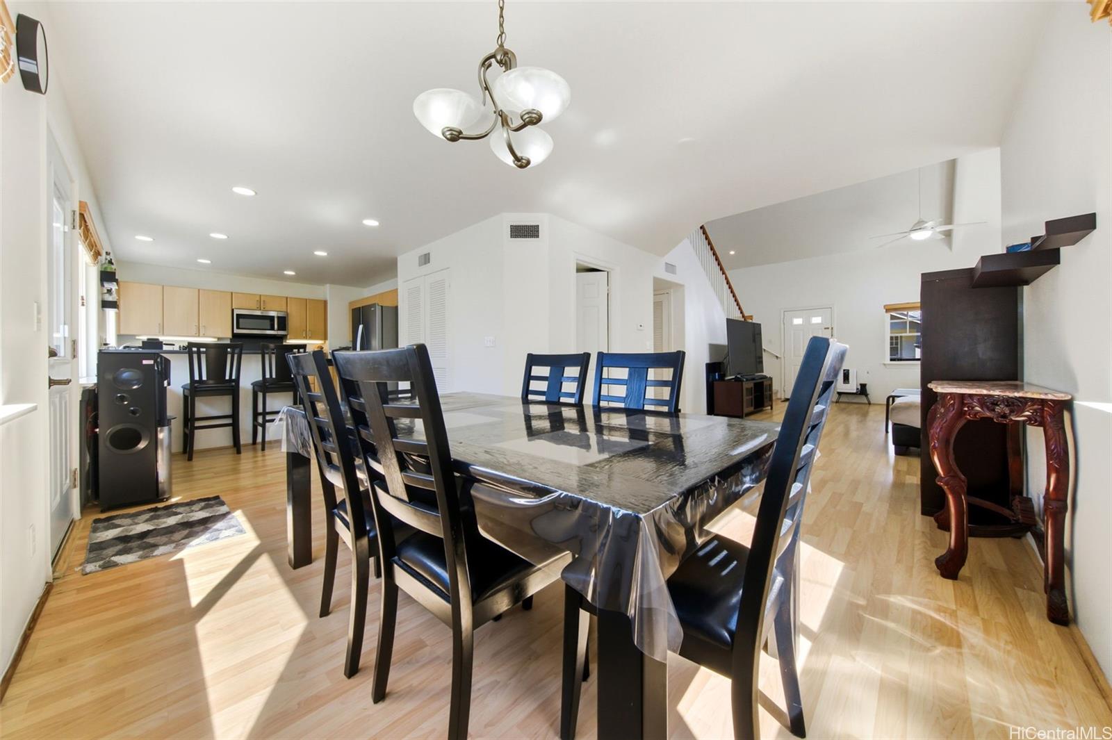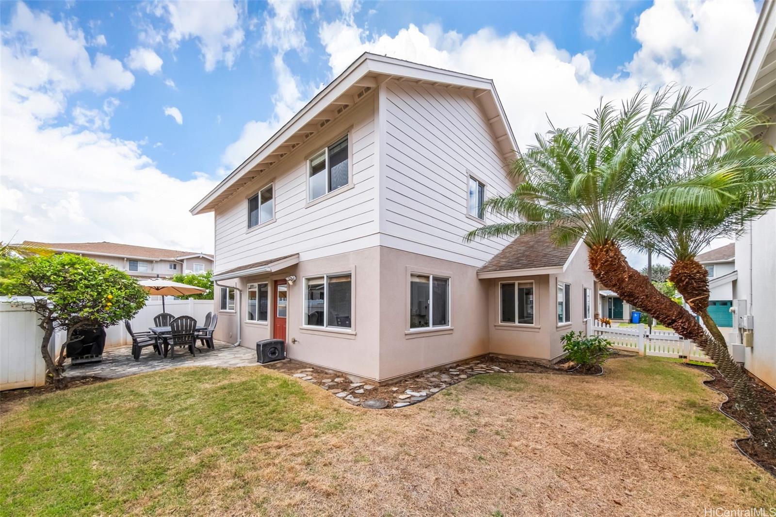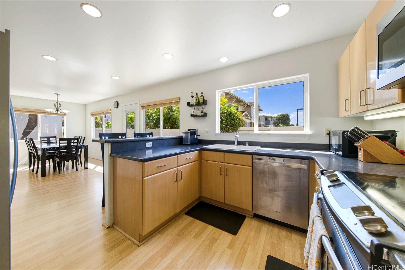 Rarely available single-family home in Kalamaku’u in Kalama Valley, Hawaii Kai. Great floor plan with living room, dining area, kitchen and half bath downstairs. Vaulted ceilings in living room. Three bedrooms and two full baths upstairs. Primary bedroom suite with walk-in closet, bathtub and shower and golf course views. Two car garage with driveway parking. Lots of natural light throughout. Central AC. Upstairs 4th bedroom option offers open multi-purpose living space currently used as home office with golf course views. Corner lot with fully fenced in yard with grass and mature citrus and pomegranate trees. Stone tiled lanai for outdoor living. Community park with playground nearby. Visitor parking available. Maintenance fee includes water, sewer, common area maintenance and Association master insurance policy. Needs a little TLC but ready for new owners. Listing by: Affinity Realty (808) 391-9874