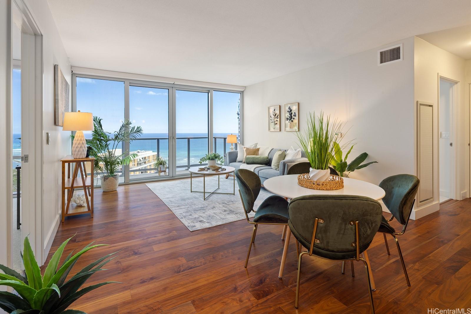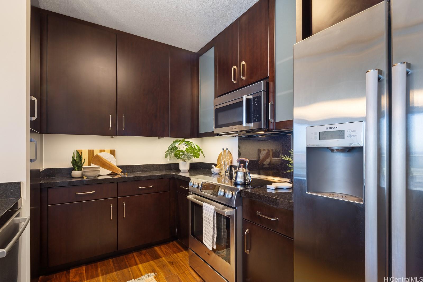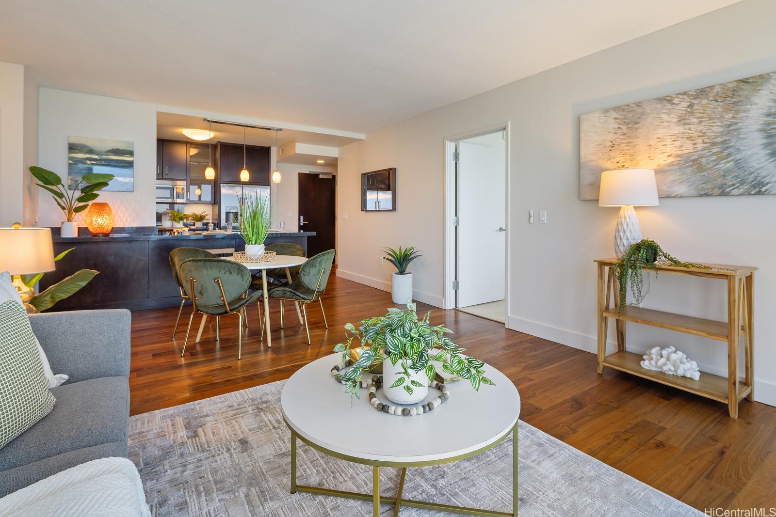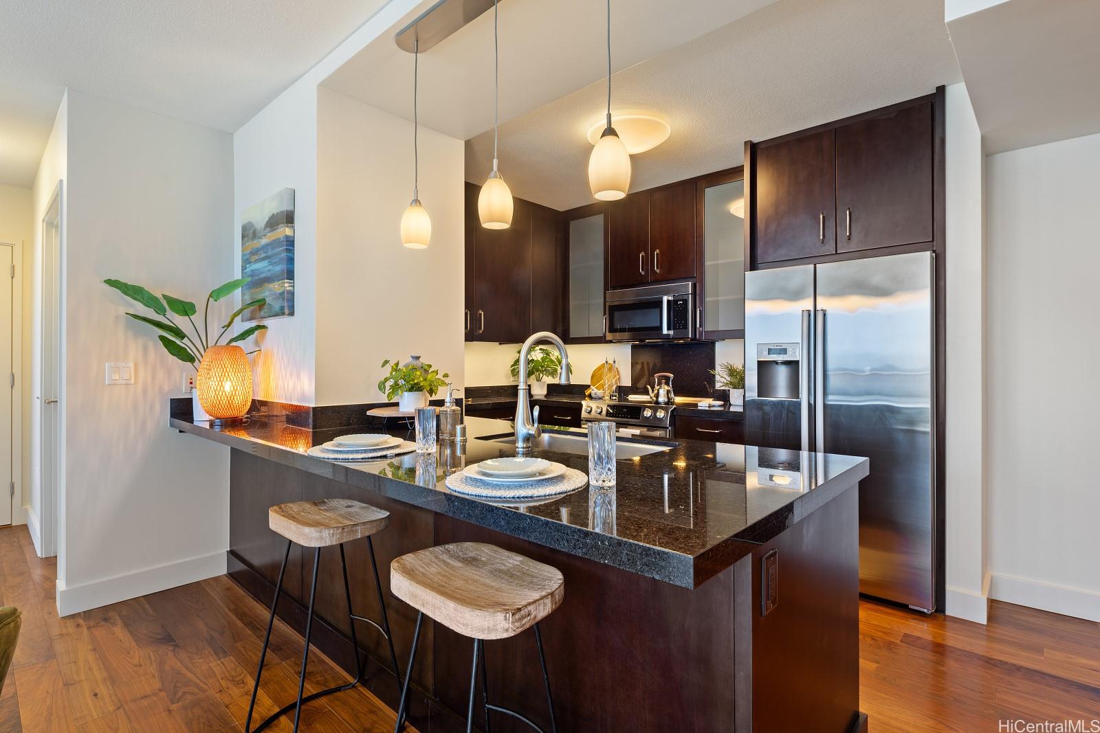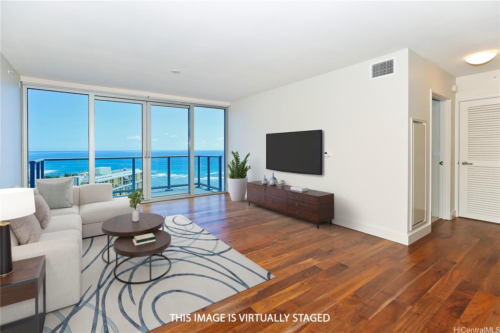 New amazing price for this Rarely available 2-bedroom, 2-bath residence with a lanai in Waihonua. Spanning over 1,000 sq. ft, this home effortlessly combines modern design, comfort, and style. Step inside to rich hardwood floors, elegant custom cabinetry, floor to ceiling windows, and automatic shades for your convenience. The kitchen features Bosch stainless steel appliances, granite countertops, and sleek porcelain tile. Waihonua residents enjoy an impressive array of resort-style amenities, including an infinity-edge pool with spa cabanas, a fitness center, private theater, and inviting BBQ pavilions. The building also offers a luxurious club room, guest suites for visitors, ample storage, and secure entry for peace of mind. Ideally located in the heart of Honolulu, you are just steps from Ala Moana Shopping Center and Beach Park, with Ward Village, world-class dining, entertainment, and the vibrant beach lifestyle all within easy reach. This exceptional residence offers the perfect blend of convenience, luxury, and island living. Note it is pet friendly too! Listing by: Hawaii Life (800) 667-5028