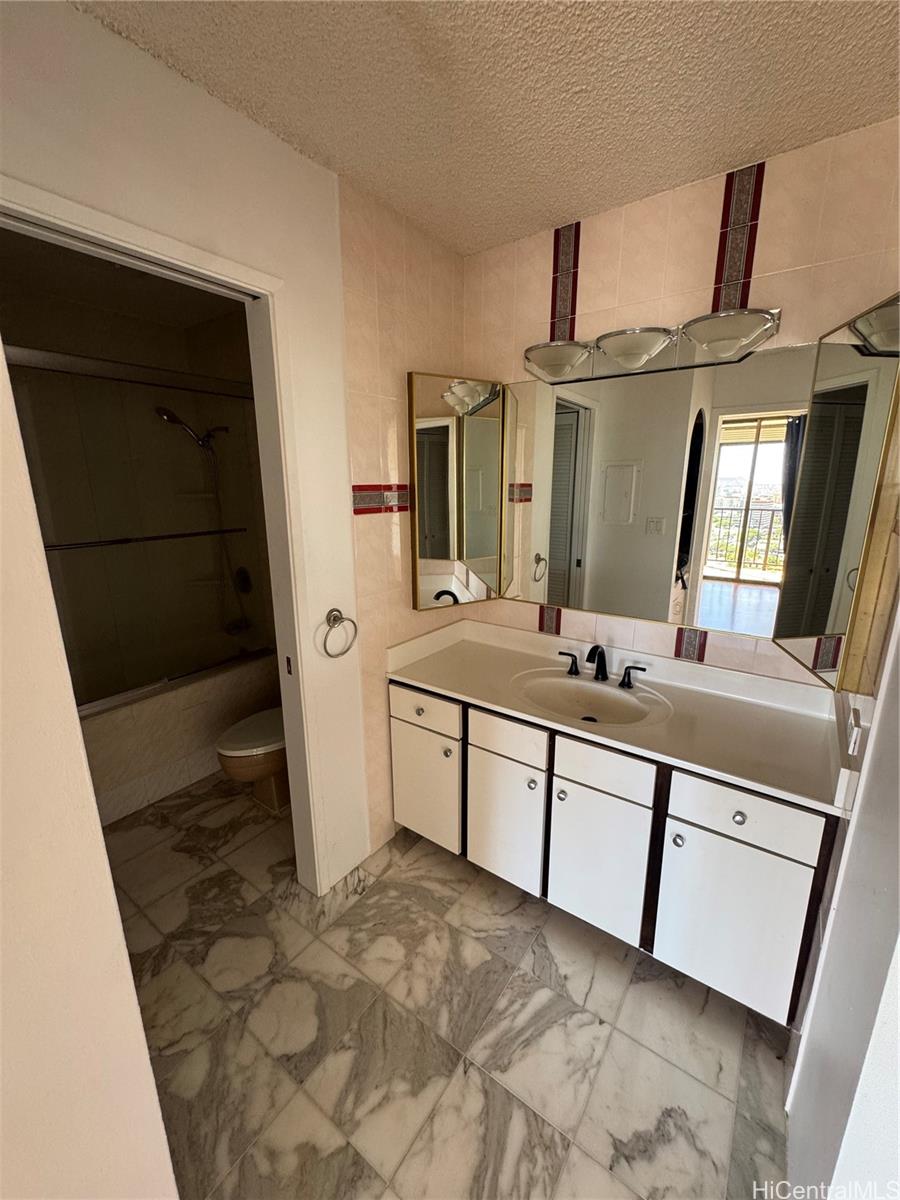 Large One bedroom with a separate den /office area with this part of lanai eclosed so 767 sq ft. interior. Also a nice big lanai 162 sq ft with ocean and mountain virws.This is a secured building and secured covered garage parking #229. Close to shopping, freeways, bus stop, schools. Remodeled laminate floors ,stainless steel appliances in the kitchen granite counters you can use for eating your breakfast and dinner is on. New Washer and Dryer . and Fridge. Bright with cool breezes . Great ammenites Pool. sauna .Whirlpool, resident Mananger.