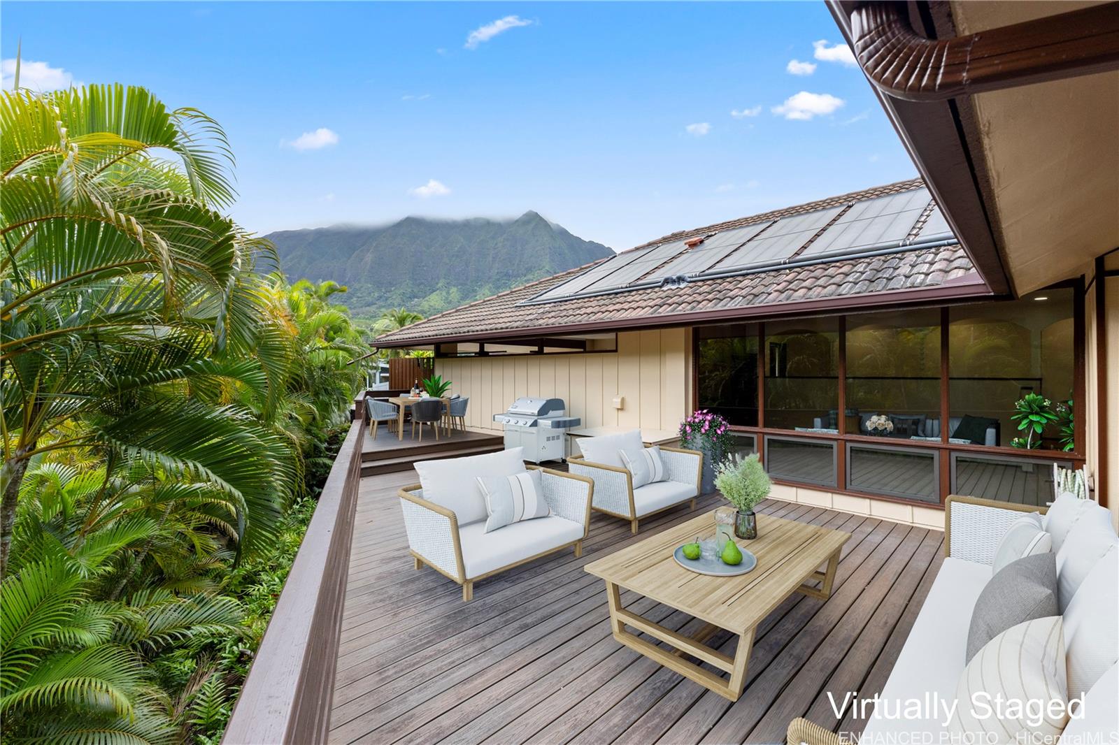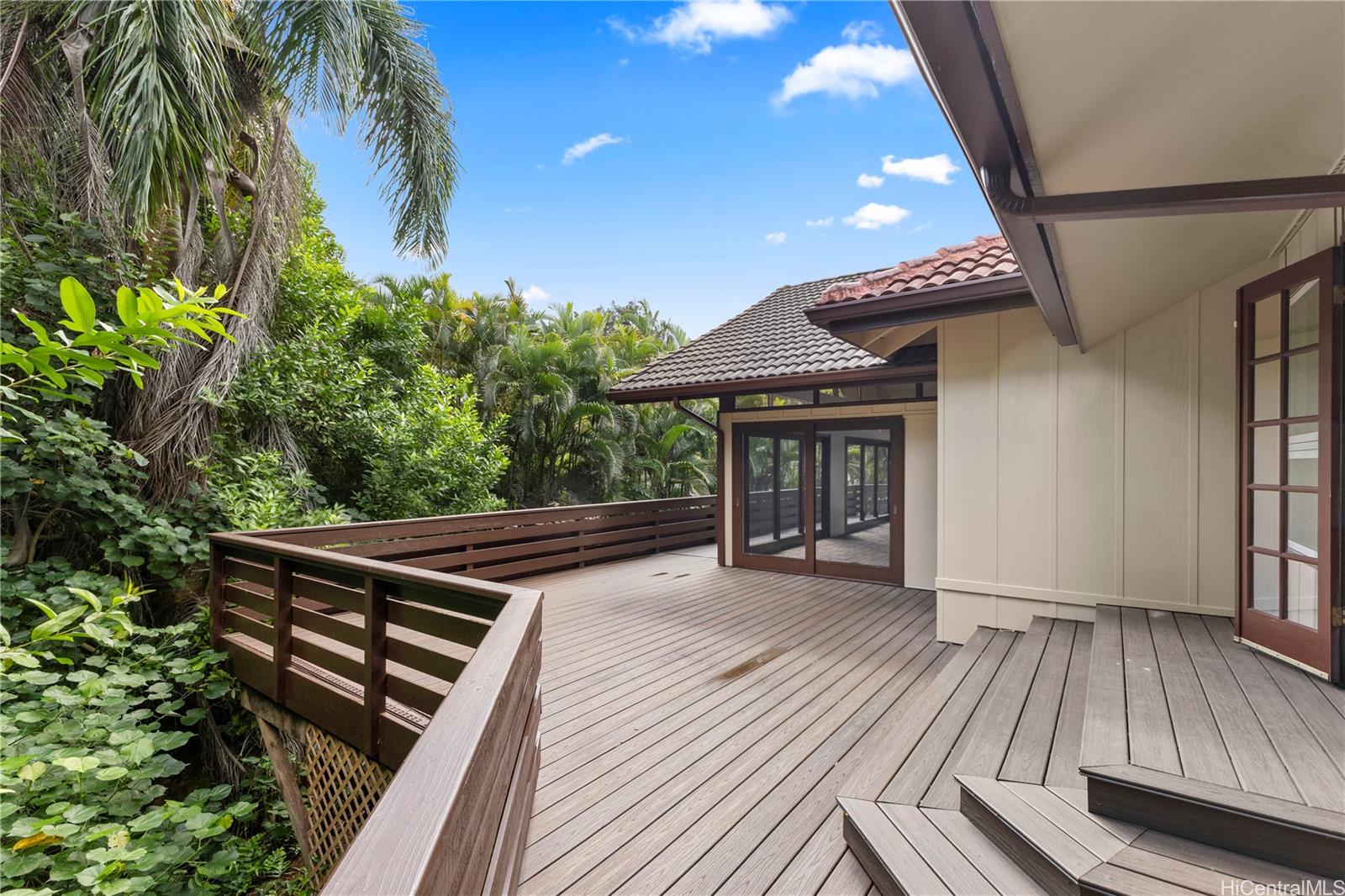 [0] => Discover a rare opportunity in the quiet Maunawili community, tucked against the majestic Ko'olau mountain range. This 3-bedroom, 2-bath home, with a bonus den, sits on an oversized 12,090 sq. ft. lot at the end of a cul-de-sac and features one of its most unique highlights—an indoor heated swimming pool in a screened-in lanai. Large windows and sliding doors open to an expansive wraparound deck overlooking lush tropical foliage, creating a peaceful, treehouse-like setting. The fenced outdoor space includes a small grassy area and mature plantings, while the elevated deck offers a private perch among the trees.