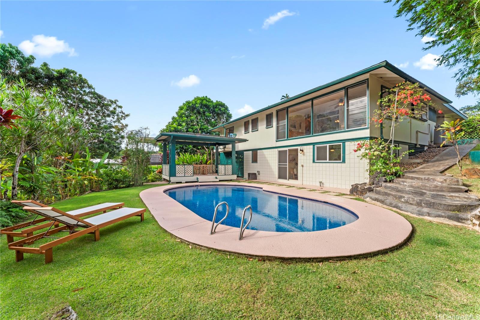 Open House Sunday, Oct 5, 12–3 PM. Imagine waking up every morning to breathtaking Ko'olau Mountain views in your own Maunawili Estates retreat. This beautifully maintained 4BR home is move-in ready with fresh paint, oak cabinets, and wood floors. Downstairs, a private guest suite with separate entry offers endless rental possibilities, opening directly to your pool deck and gazebo, perfect for relaxing by the saltwater pool. Your 10,000+ sq ft lot provides privacy, lush tropical landscaping, and an orchard of fruit trees: mango, lychee, bananas, citrus, and jaboticaba, alongside fragrant ginger, gardenia, and pikake. The pool has been updated with a new pump and pool deck. Enjoy a quite and close-knit community and new upgrades with 32 fully owned solar panels, EV charger, rebuilt pool house, carport with long driveway for up to 5 cars, new appliances, brand-new breaker panel, and a pre-listing home inspection for peace of mind. With three highway access points, commuting to town or the airport is a breeze. In Maunawili Estates, you’re not just buying a home—you’re claiming a lifestyle of comfort, community, and unparalleled natural beauty. Listing by: eXp Realty (808) 725-2794