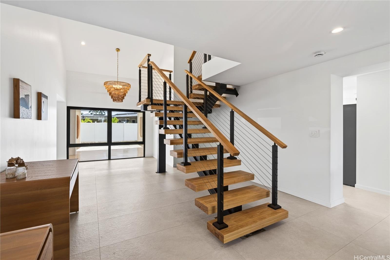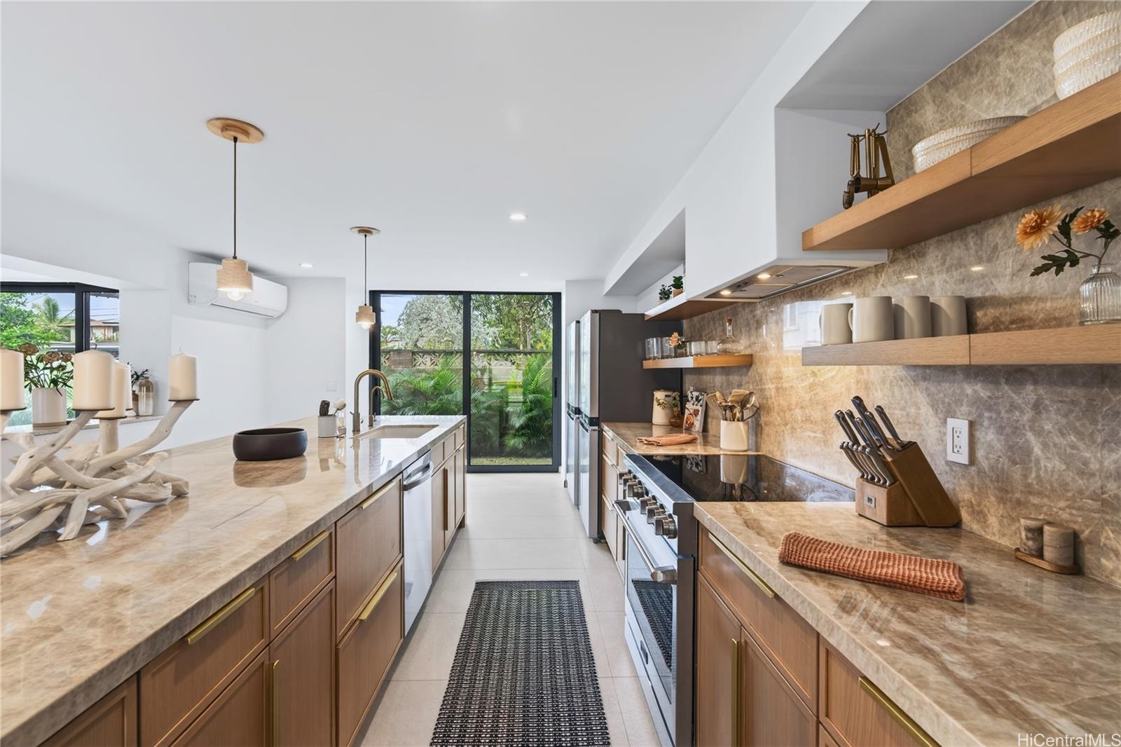 The kitchen is a showpiece, centered around a 14-foot quartzite island, complemented by striking windows, doors, stone flooring, and two architectural staircases. A rare 2,000-square-foot rooftop deck delivers flexibility for entertaining or relaxing under the stars. Additional highlights include an au-pair suite with kitchenette, a stunning porte-cochère, and an unbeatable location close to the heart of Kailua."