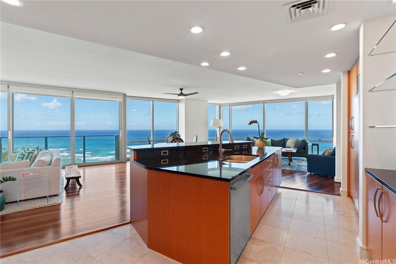Gorgeous Sweeping Views from Diamond Head to the Ewa planes. Most desirable 'D' floor plan with 3 parking stalls, a large storage room, very spacious living areas, laundry room, and a wide open kitchen with unobstructed ocean views. Large soaking tub, granite counters, Wolf & SubZero appliances, a duo-zoned wine cooler and gas range. Large primary closet with an organized closet system. Also included are stunning solid Brazilian Cherry hardwood flooring. Hokua is an amazing place to call home. Amenities galore, heated pool, world class gym, BBQ cabanas, tennis and so much more. Listing by: Carvill Sotheby's Intl. Realty (808) 306-7005