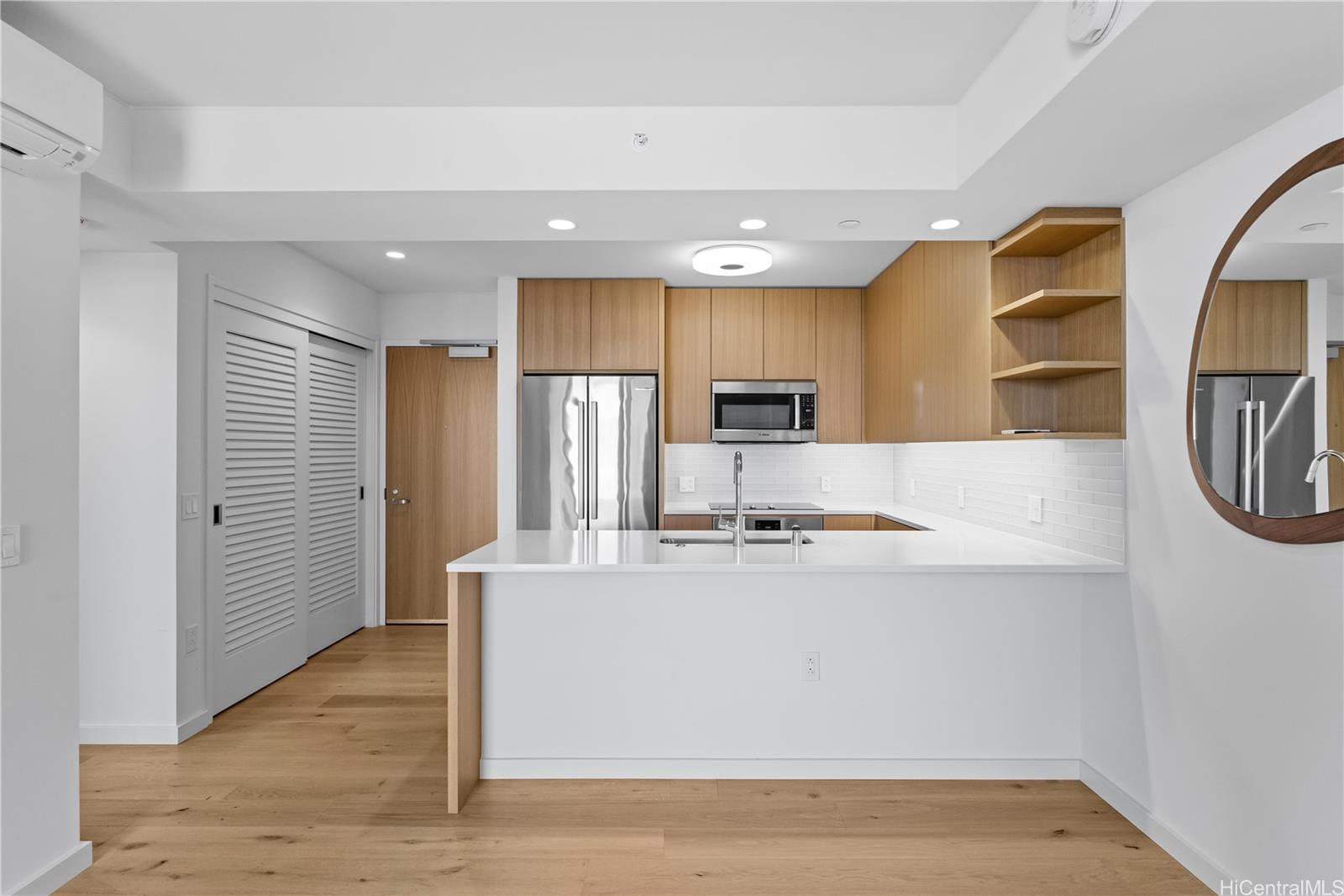 Welcome to Sky Ala Moana West! Experience elevated island living in this stunning high-floor 1-bedroom, 1-bath residence with one parking stall. Enjoy sweeping ocean and Diamond Head views from your private lanai. Perfectly situated just steps from Ala Moana Shopping Center, premier dining, grocery stores, and the beach park, this contemporary home offers unmatched convenience and comfort. Resort-style amenities abound unwind in two spas and saunas, relax by the poolside cabanas, host gatherings in private dining rooms and BBQ pavilions, or stay active in the large fitness center, outdoor workout area, and dog park. Families will love the playground and lush open spaces designed for modern island life. Live, play, and thrive in the heart of Honolulu at Sky Ala Moana West. Listing by: Hawaii 5-0 Properties, Inc. (808) 222-0589