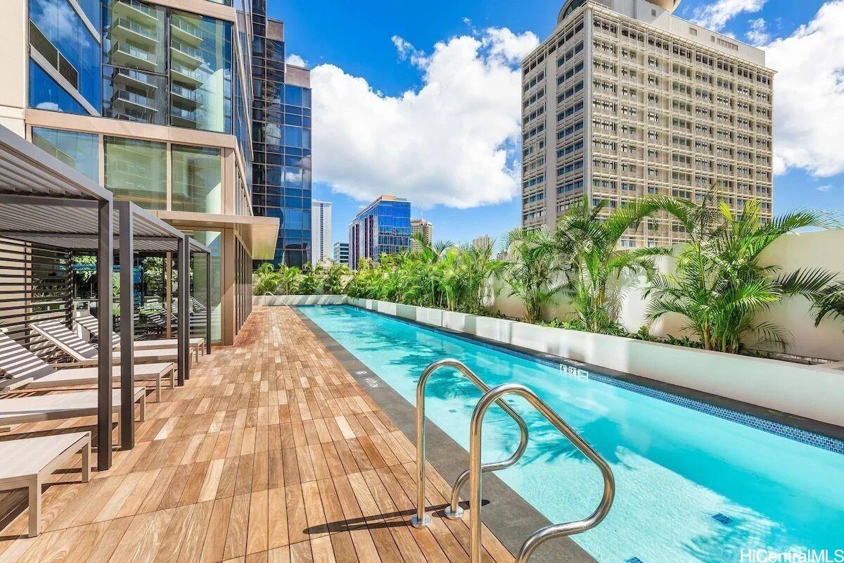 Sky Ala Moana is one of Honolulu's new two tower developments, and it's the first of its kind in Hawaii with one tower having a world renowned Renaissance Marriott Hotel and the other tower the Sky Ala Moana Residences. The synergy this provides is unparalleled with the opportunity to enjoy resort like amenities while having the comfort of your two bedroom, two bathroom condo. This high floor unit features 2 custom walk-in closets, large entry storage closet, Silestone quartz countertops, Bosch appliances, full size wash/dryer, split AC in each room, ceiling fans, floor to ceiling glass in all rooms, 96 square foot open air lanai which allows for breathtaking views of the city, ocean, mountains and sunsets. The convenience of two side by side, gated parking stalls plus storage. The 8th floor amenity deck is one of the largest in Honolulu. This oasis in the sky consists of two heated salt water pools. One being a 25 meter lap pool and the other is one of Honolulu's largest residential pools. Enjoy the full service Renaissance Marriott pool bar, spa's dry&wet sauna, furo, cold plunge, indoor/outdoor gym, 4 hot tubs, BBQ cabanas, party rooms and kids play areas. & Amazing Location! Listing by: Corcoran Pacific Properties (808) 589-2040