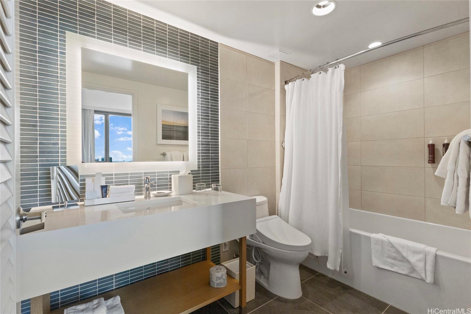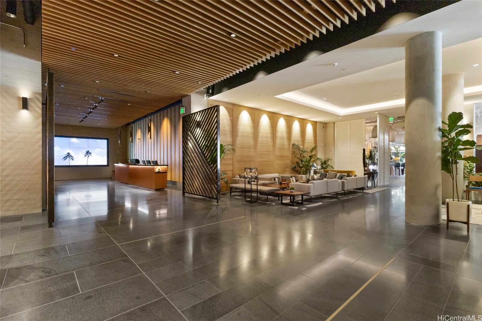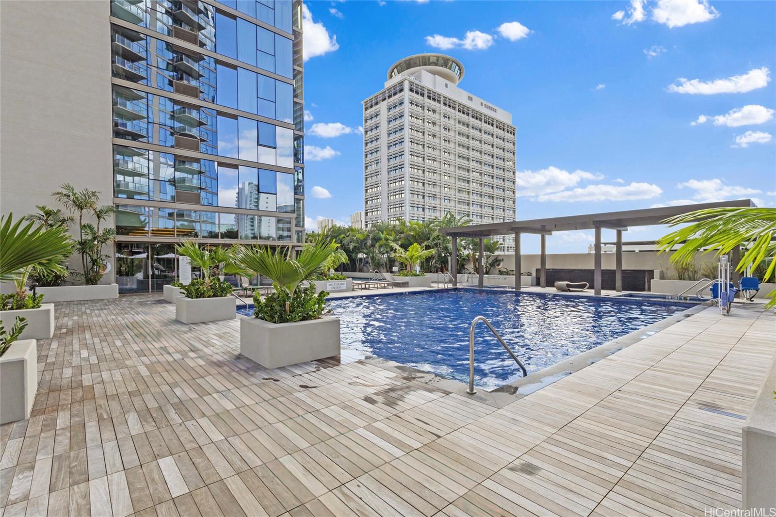 The building provides a full-service hotel experience with lobby check-in, valet, an on-site café and restaurant, plus an expansive amenity deck featuring multiple pools, a hot tub, cabanas, a state-of-the-art gym, and a full-service bar. Located directly across from Ala Moana Center and moments from dining, shopping, Don Quijote, Walmart, and an indoor golf facility, this is a refined alternative to the bustle of Waikiki. A stylish, flexible, and highly desirable residence in one of Honolulu’s most exciting new luxury offerings."