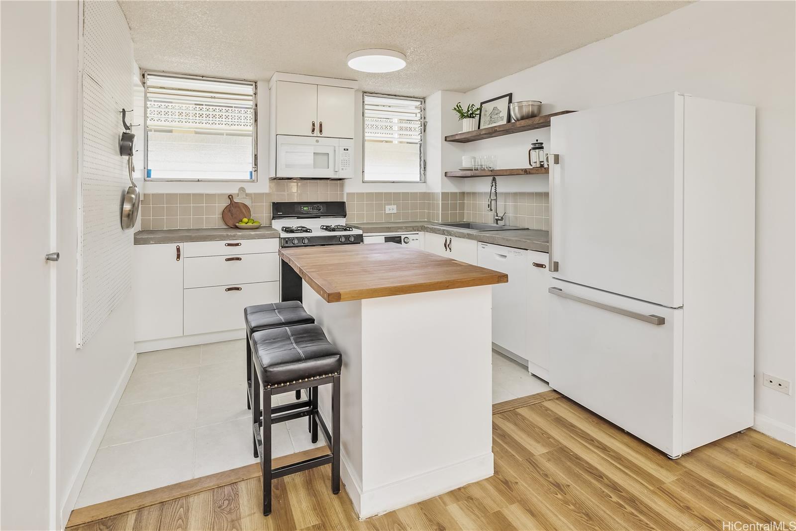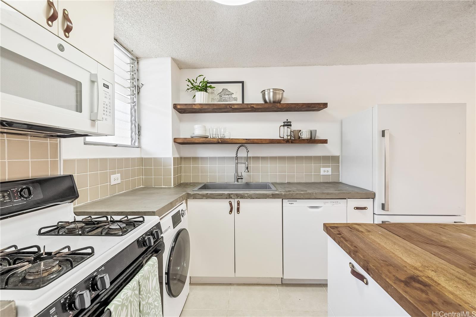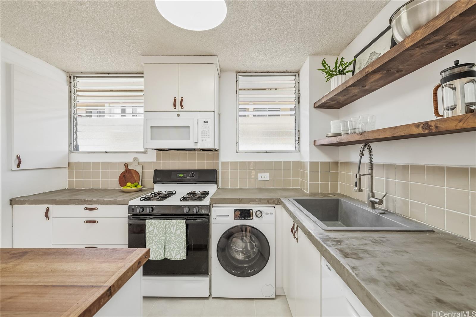 This newly remodeled, two-bedroom condominium is a stunning blend of modern style and unbeatable convenience, nestled in the absolute heart of Honolulu. Step inside and be greeted by an abundance of natural light that highlights the sleek, contemporary finishes. The chef in you will adore the updated kitchen, featuring a gas stove, dishwasher, and a stylish kitchen island perfect for meal prep or casual dining. The unit includes an in-unit clothes washer and one reserved parking space.