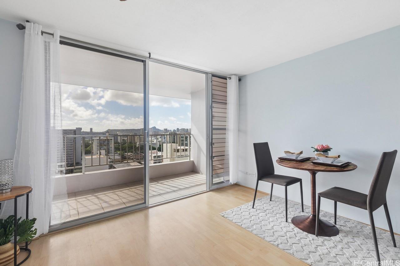string(1186) "Rarely available top-floor studio with sweeping views! Enjoy iconic views of Diamond Head, lush mountain vistas, and even glimpses and pockets of the ocean as you walk from the elevator to your unit. This spacious studio features laminate and ceramic tile flooring, a stainless-steel refrigerator, microwave oven, ample amount of kitchen cabinets and drawers, and added shelving for extra storage, bathroom has extra storage behind the mirrors, window AC. The generously sized covered lanai is perfect for relaxing, dining outdoors, or simply taking in the beautiful surroundings. Open up the windows to let the trade winds flow through the unit. The well-maintained building offers secured entry, surveillance cameras, an on-site resident manager, and community laundry. Amenities include a pool, BBQ area, sauna, and fitness room for your daily needs and enjoyment. Comes with one covered, assigned parking stall conveniently located near the elevator. Ideally situated near shopping areas, including Walmart, public and private schools, University of Hawaii at Manoa, Makiki District Park, restaurants, beaches, and bus lines. Experience the comfort and convenience of Makiki Living!"