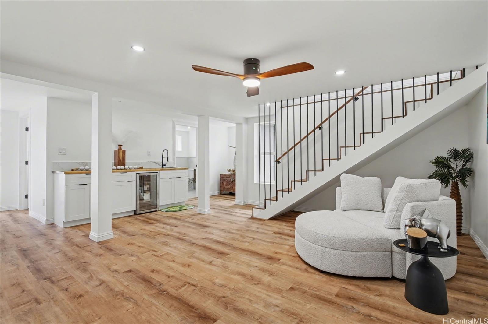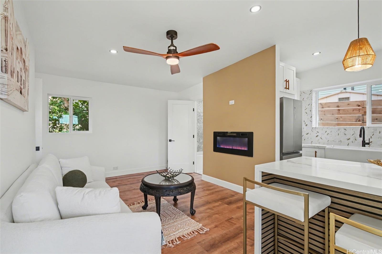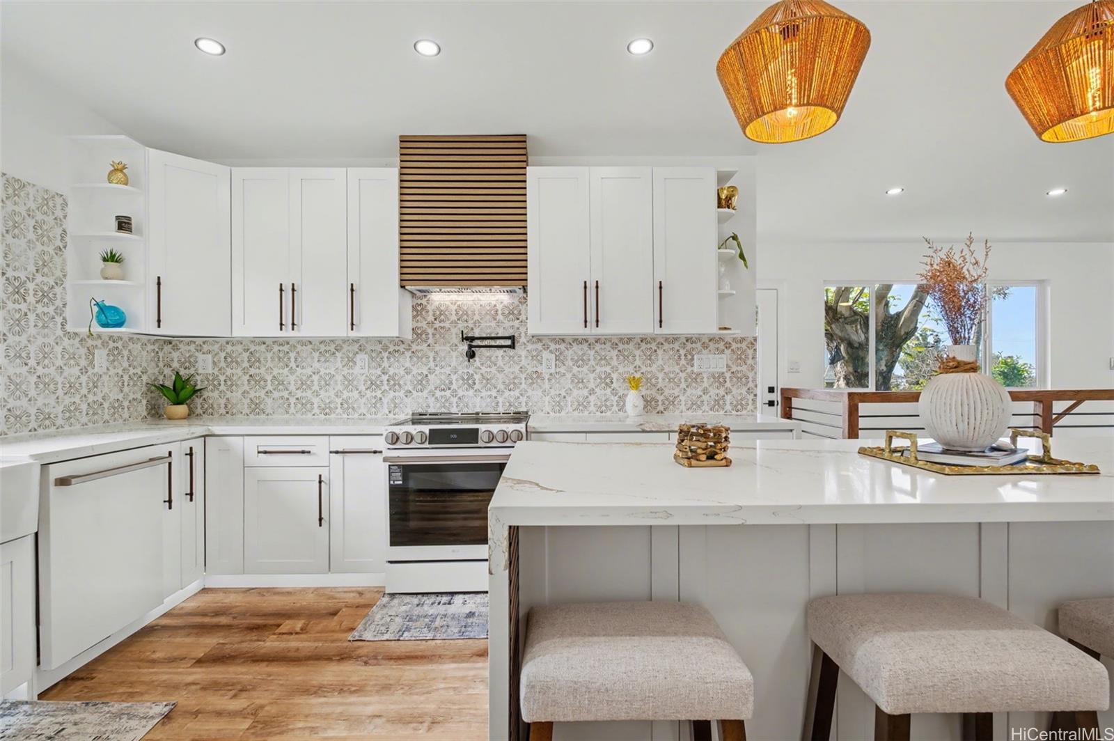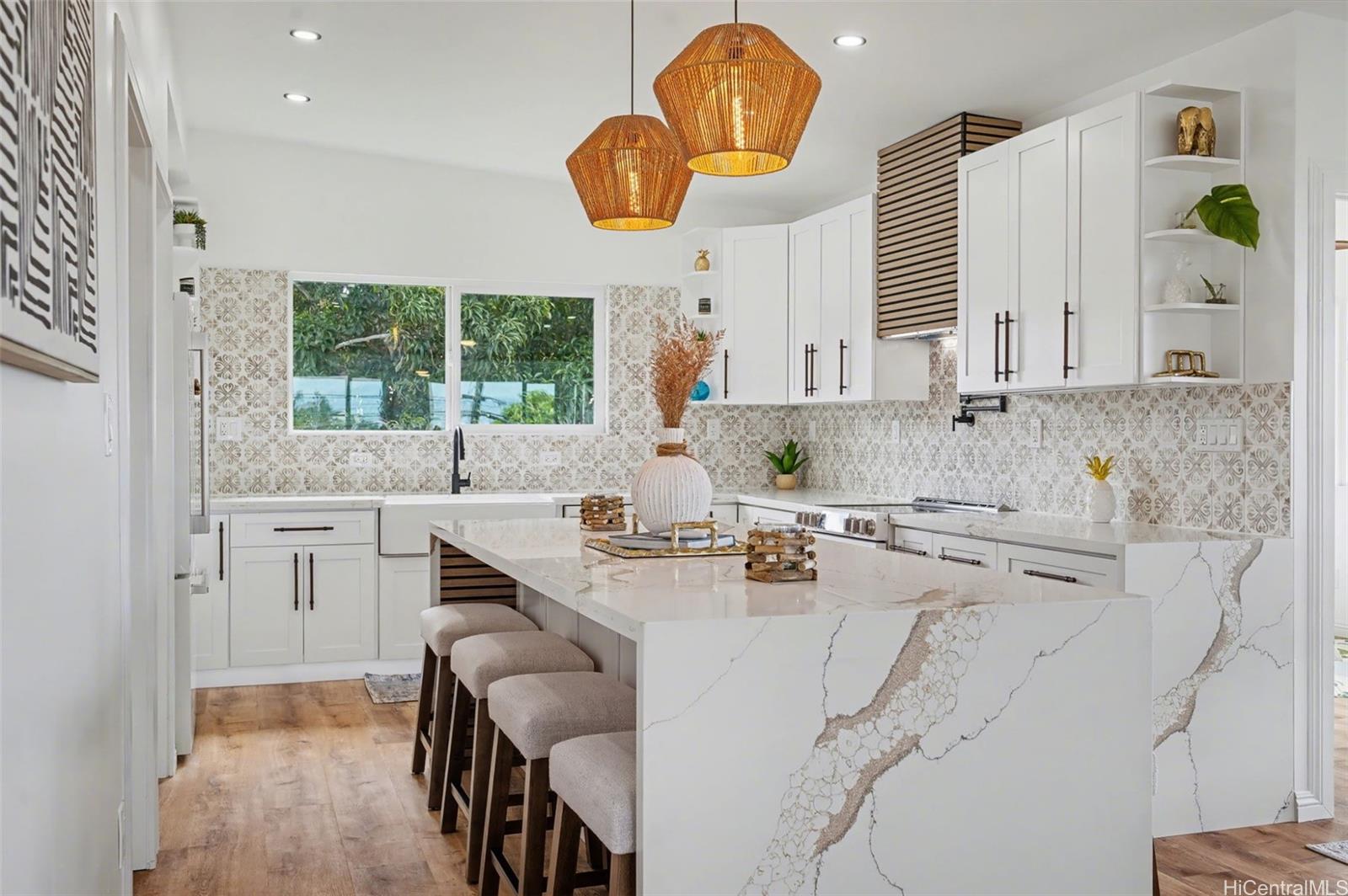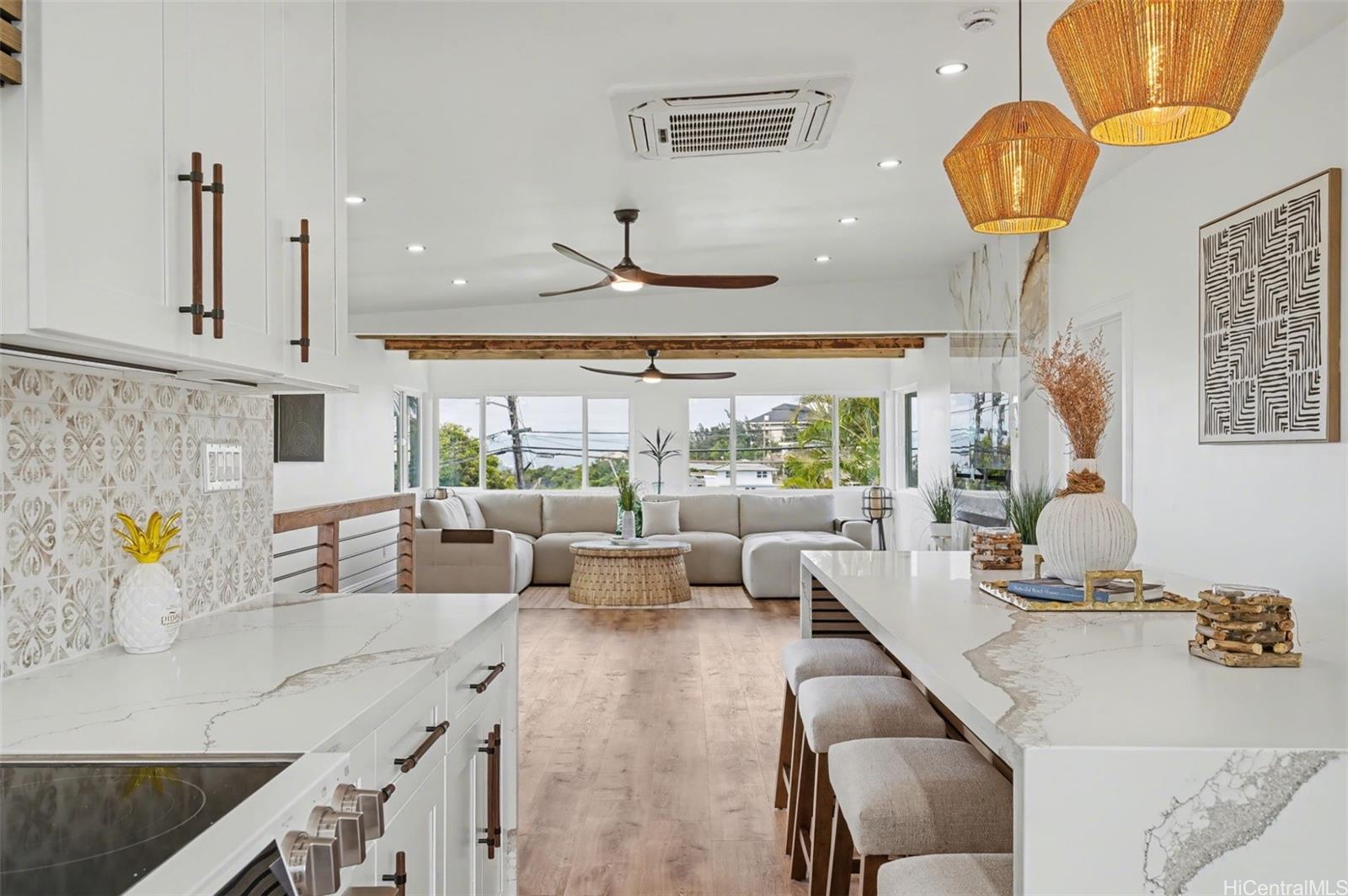 Rare, fully renovated, no expense spared, luxury estate with detached ADU offering ocean and mountain views. The two-level main residence features 6 bedrooms, 3 bathrooms, a refined wet bar, an expansive kitchen with an oversized island, new appliances, and a grand fireplace. 2-car garage with parking for 8+ vehicles. A detached 2-bedroom ADU with full bath, kitchen, and private laundry adds flexibility and value. Hawaiian style finishes interwoven with contemporary luxurious detailing create an ambiance of the modern Ohana. The large outdoor living space is for daily relaxation and to entertain guests while enjoying the trade wind breezes that naturally keep the property cool. Lush, mature greenery with mango, avocado, and mandarin trees provides exceptional privacy while maintaining a serene, shaded, and comfortable garden environment. Turnkey, private, and ideally located close to town. An exceptional opportunity. The bedroom and bathroom count does not match the tax records. Listing by: OahuRE.com (808) 425-7887