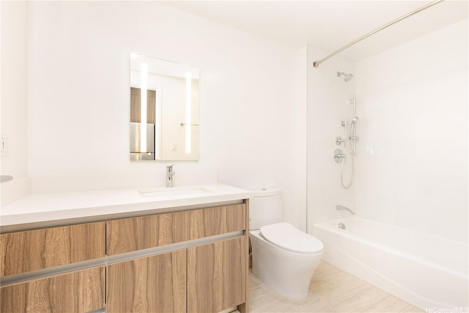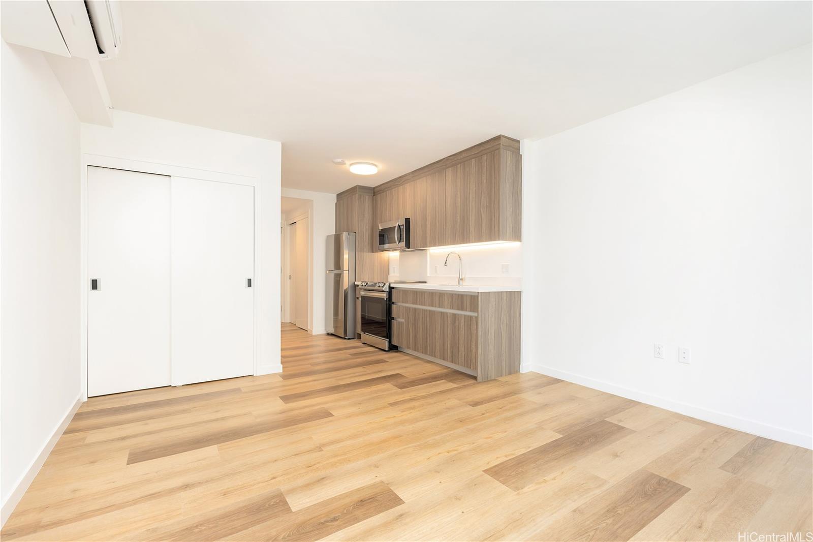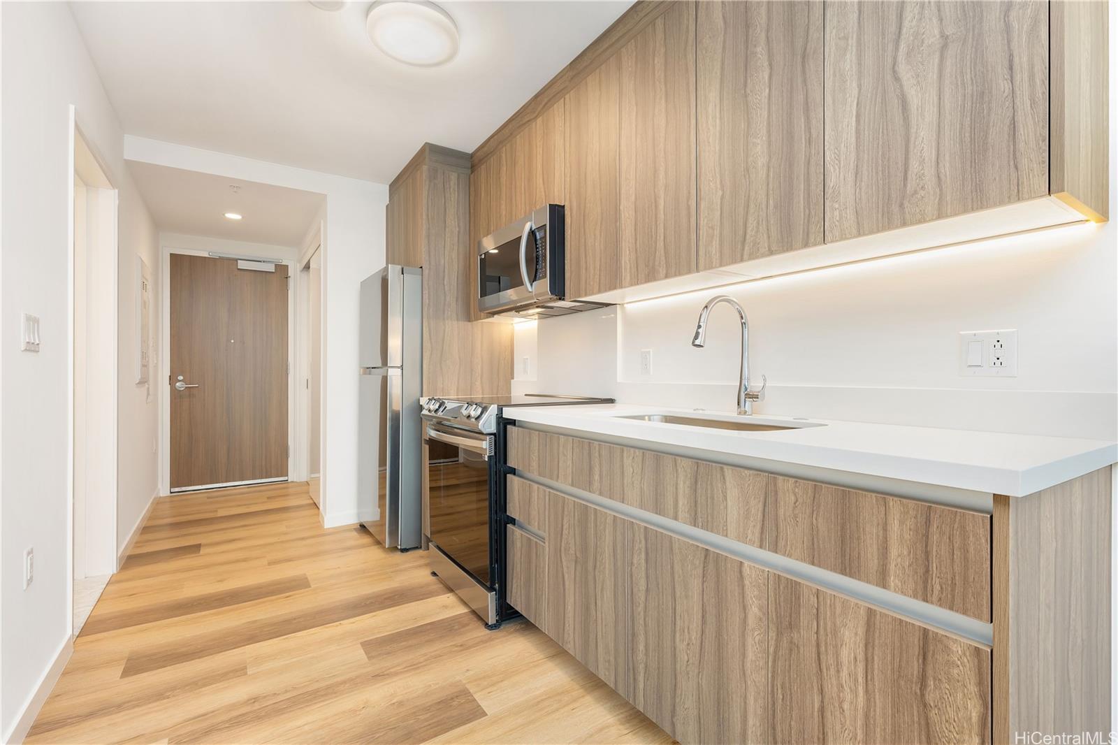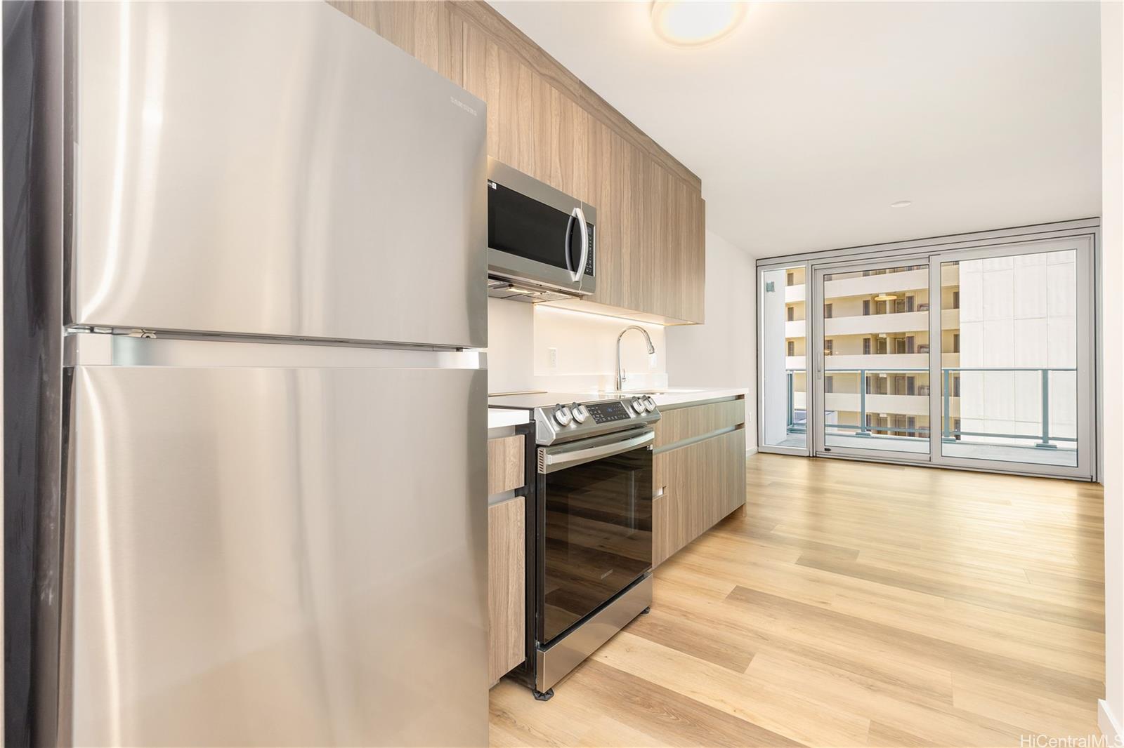 Experience modern living in this newly built studio featuring a spacious 143 sq. ft. lanai and 1 assigned parking stall. With 353 sq. ft. of interior space, you’ll enjoy a total of 496 sq. ft. of indoor-outdoor living. The unit offers luxury vinyl flooring, stainless steel appliances, quartz countertops, split AC, and floor-to-ceiling windows for abundant natural light. Situated in the brand-new Rycroft Tower at The Park on Keeaumoku, you’ll be just minutes from beaches, shopping, dining, Waikiki, and Downtown. Residents have access to exceptional amenities including a pool, spa, sauna, fitness center, co-working spaces, theater room, BBQ stations, and a beautifully landscaped park. Ideal for first-time buyers or investors, this is a fantastic opportunity to own in the heart of Honolulu! Listing by: Refined Real Estate Hawaii LLC (808) 348-1555