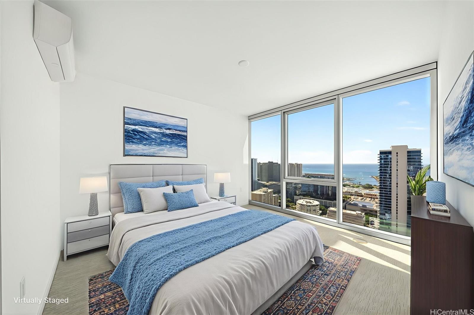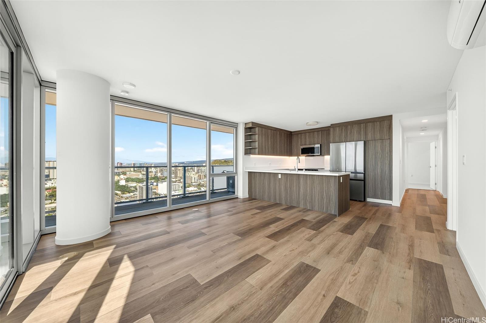 The modern open-concept floor plan is appointed with quartz countertops, luxury vinyl plank flooring in the living areas and kitchen, split AC in every room, and a private lanai—perfect for enjoying ocean and city vistas. The spacious three-bedroom layout offers flexibility for comfortable living, a home office, or guests.