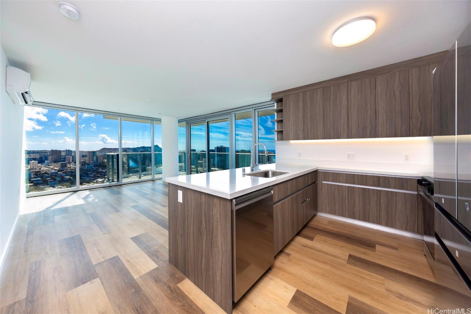 The Park on Keeaumoku is Honolulu's newest high-rise destination, just completed in Q4 2025. This high-floor, front-corner 2-bedroom, 2-bath residence situated on the 43rd floor of the Rycroft tower enjoys stunning Diamond Head, Pacific Ocean, and urban Honolulu views from the main living areas, wrap-around lanai, and both bedrooms. Features include a contemporary kitchen with quartz countertops, stainless appliances, and built-in bar seating, luxury vinyl plank flooring, modern fixtures, plus a primary bedroom with a walk-in closet and double-vanity ensuite bath. Enjoy on-site resort amenities including an infinity-edge pool and hot tub, ample pool seating and cabanas, multiple open and covered barbecue pavilions, an exercise gym, yoga studio, meeting room, movie theater, co-working space, and much more. Exceptional island living meets unforgettable views - welcome home to The Park on Keeaumoku #4319R. Listing includes enhanced, virtually staged photos. Listing by: Sachi HI Pacific Century Prop. (808) 596-8801