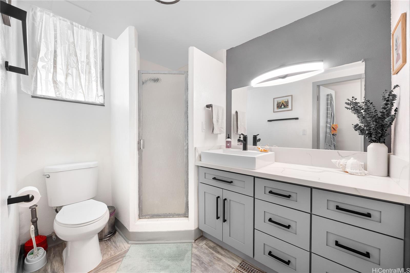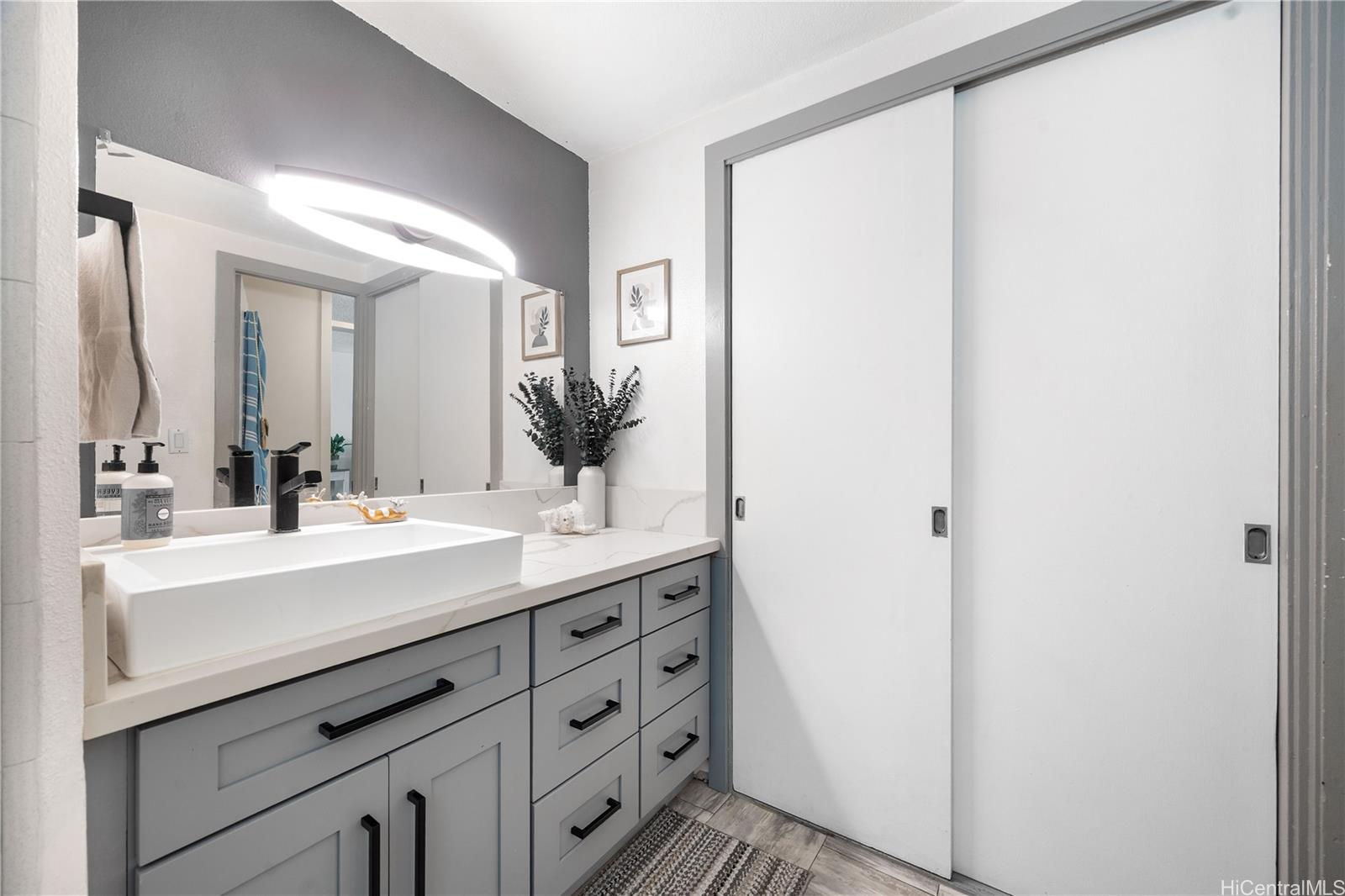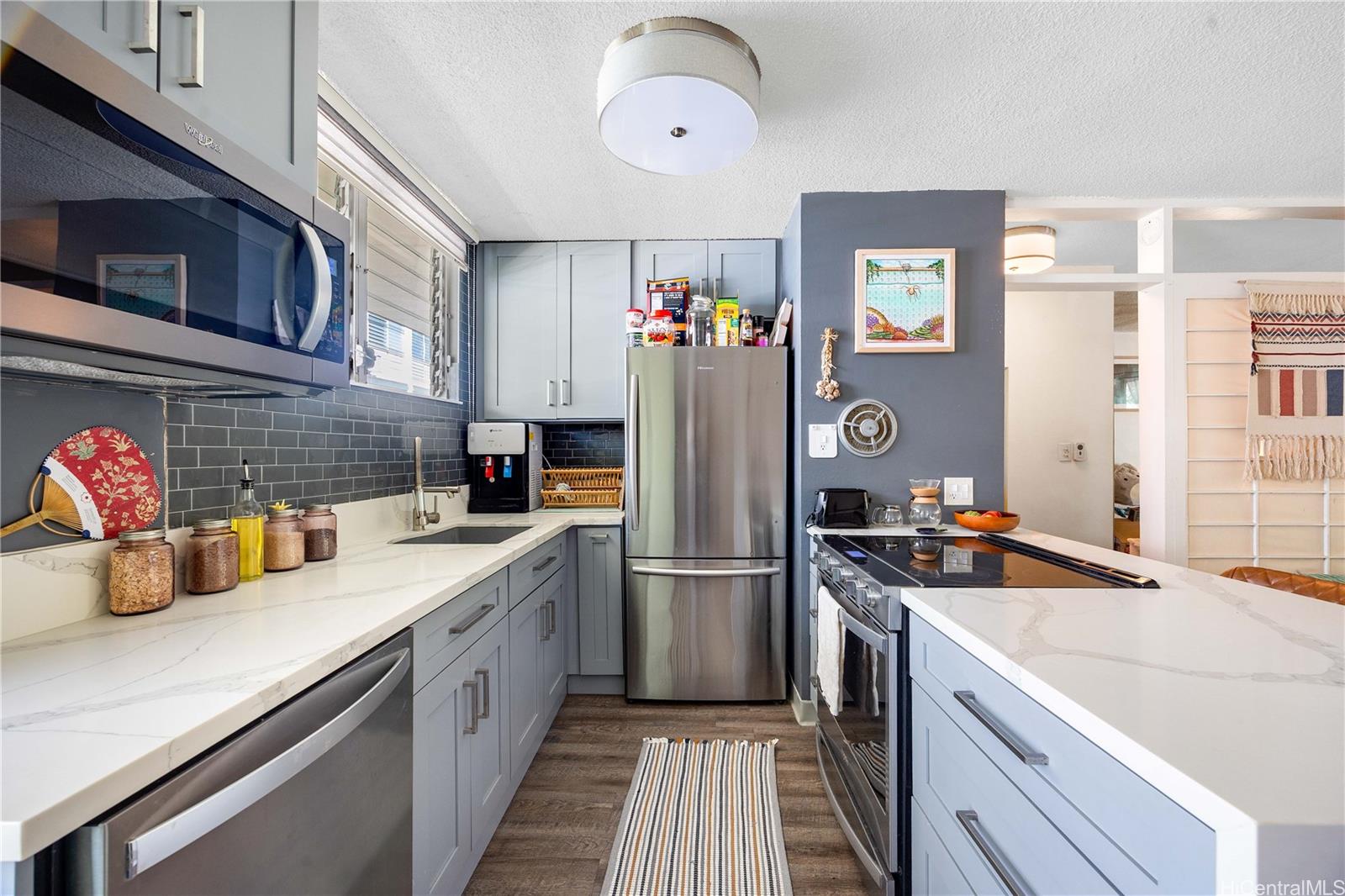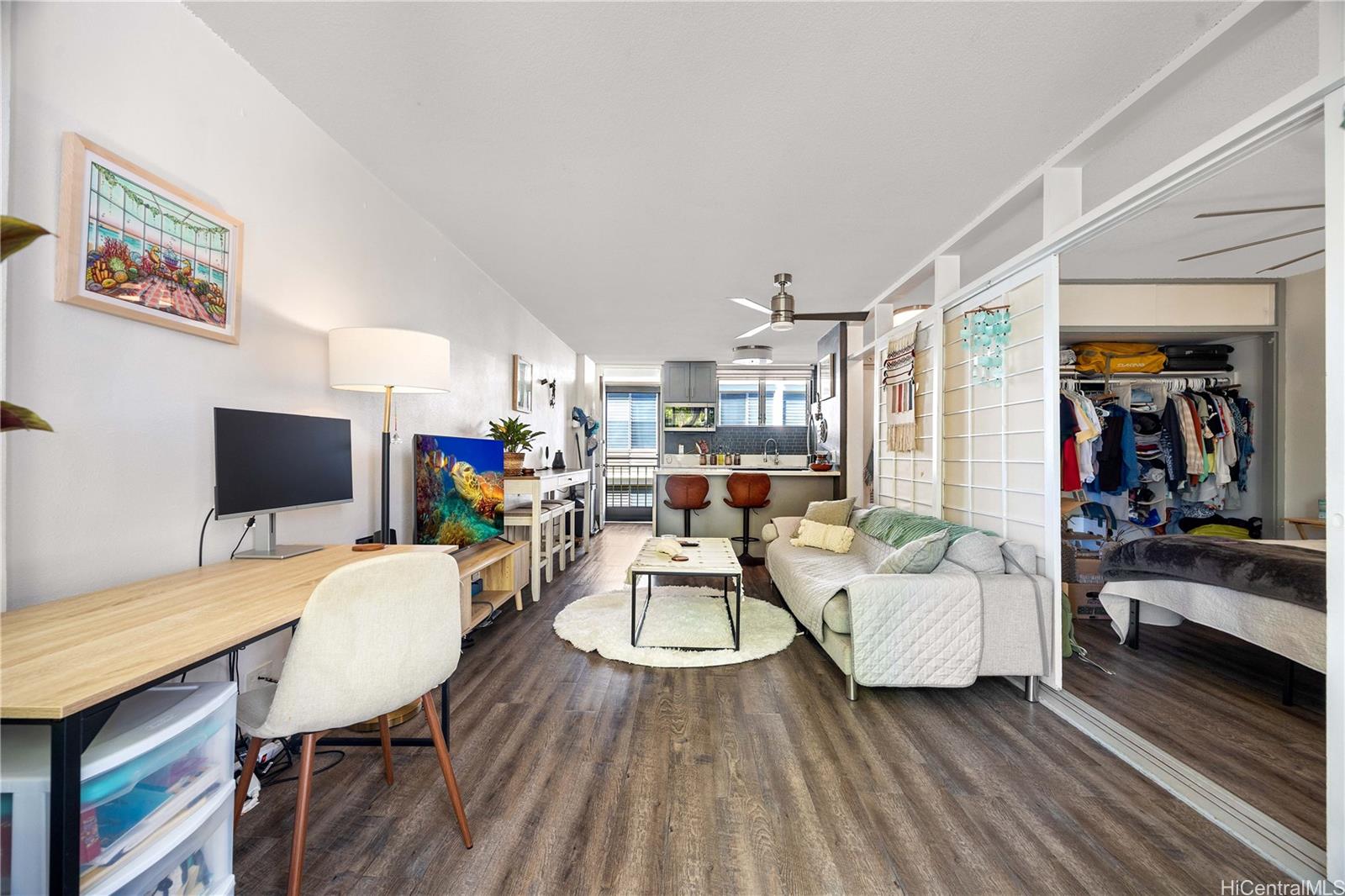 Waikiki’s beaches, and major commuter routes. This 1-bedroom, 1-bath combines smart design with modern finishes. Discover an open, breezy layout enhanced by quality vinyl plank flooring throughout. The living space flows effortlessly into a spacious kitchen featuring stainless steel appliances and sleek quartz countertops.Every inch of the unit has been maximized for both function and style, creating a warm, contemporary space that feels much larger than its footprint.