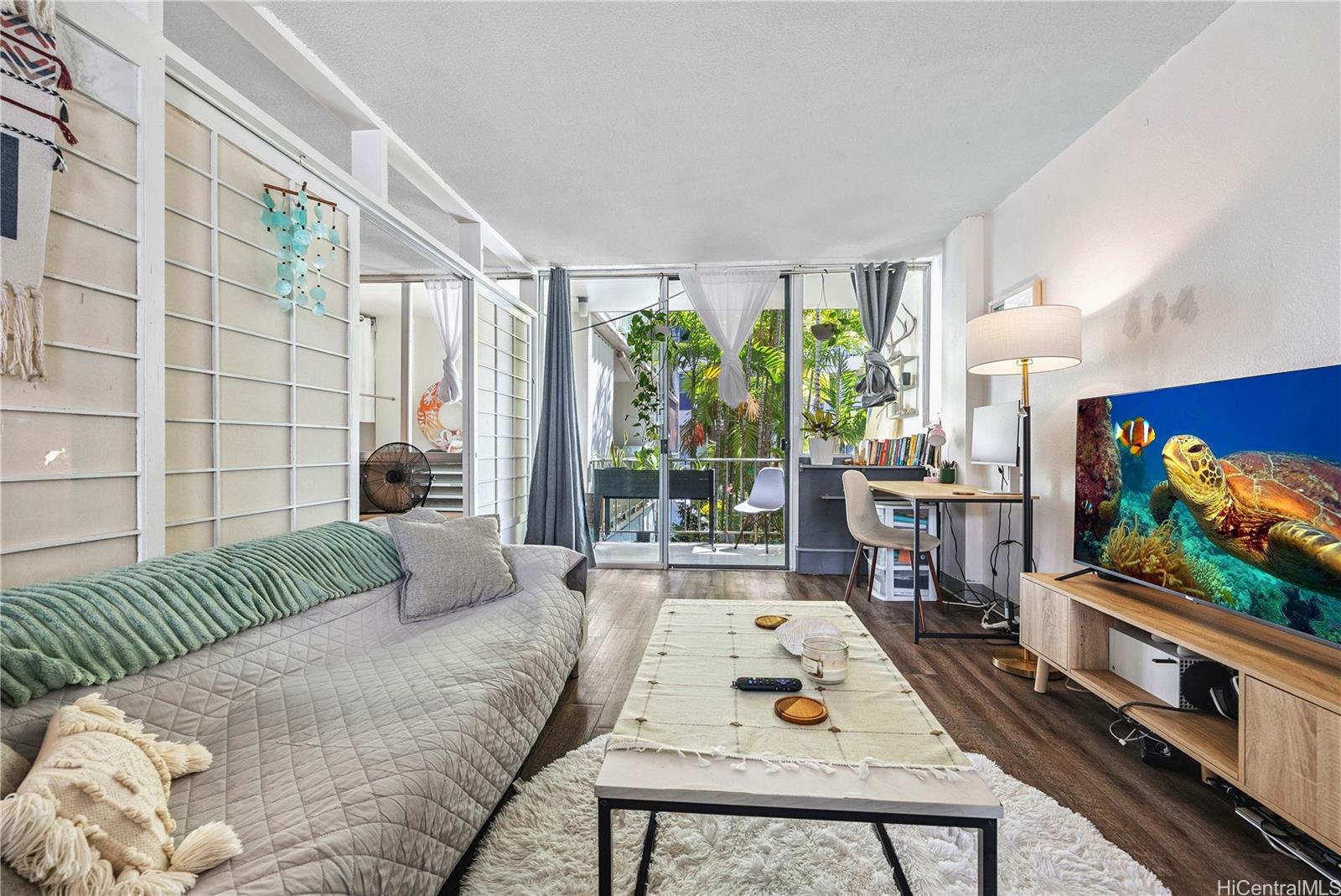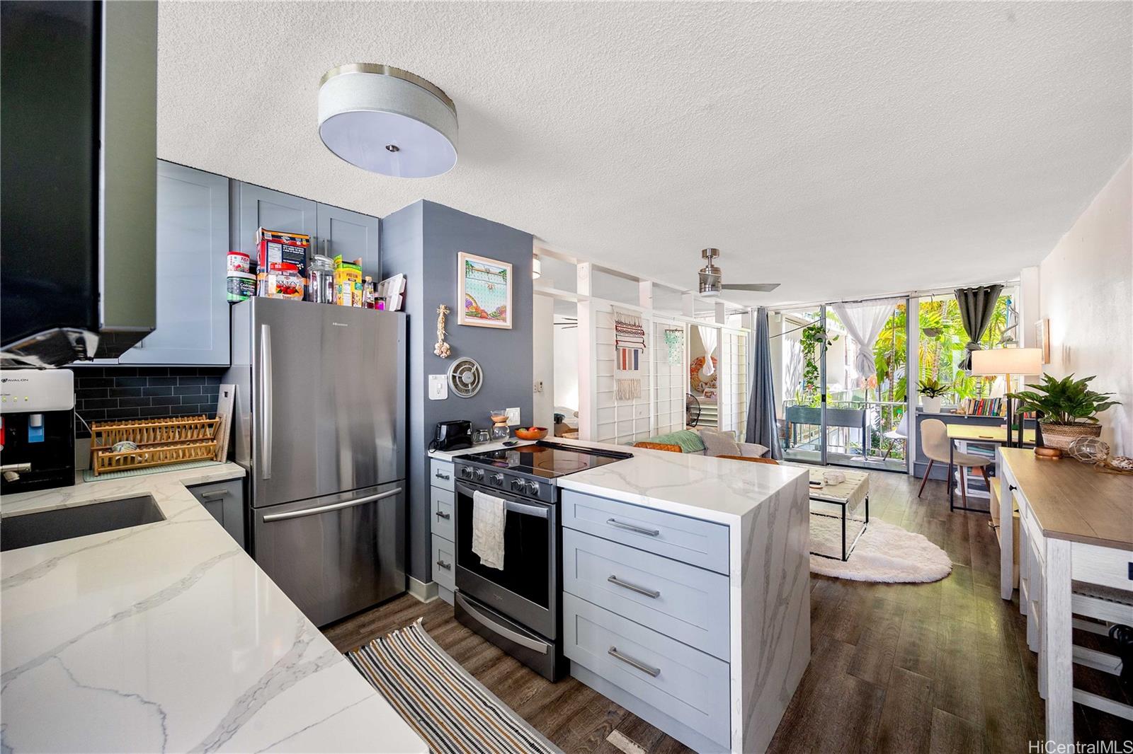 Open-Concept Stylish Makiki Retreat: 1-Bedroom with Lanai Welcome to Makiki Palms, a classic walk-up nestled in the heart of Honolulu, just minutes from Ala Moana, the University of Hawaii, Waikiki’s beaches, and major commuter routes. This 1-bedroom, 1-bath combines smart design with modern finishes. Discover an open, breezy layout enhanced by quality vinyl plank flooring throughout. The living space flows effortlessly into a spacious kitchen featuring stainless steel appliances and sleek quartz countertops.Every inch of the unit has been maximized for both function and style, creating a warm, contemporary space that feels much larger than its footprint. One of the standout features is the generously sized lanai with mature palm trees surrounding, enhancing privacy and ambiance as you do laundry with your own in-unit washer and dryer. Although a parking stall does not convey with the unit, residents often rent from the church across the street for approximately $160/month (subject to confirmation). Low maintenance fees, convenient location, and with its tasteful upgrades and inviting charm, Unit A203 offers a wonderful place to call home in the heart of Honolulu. Listing by: Keller Williams Honolulu (803) 287-9300