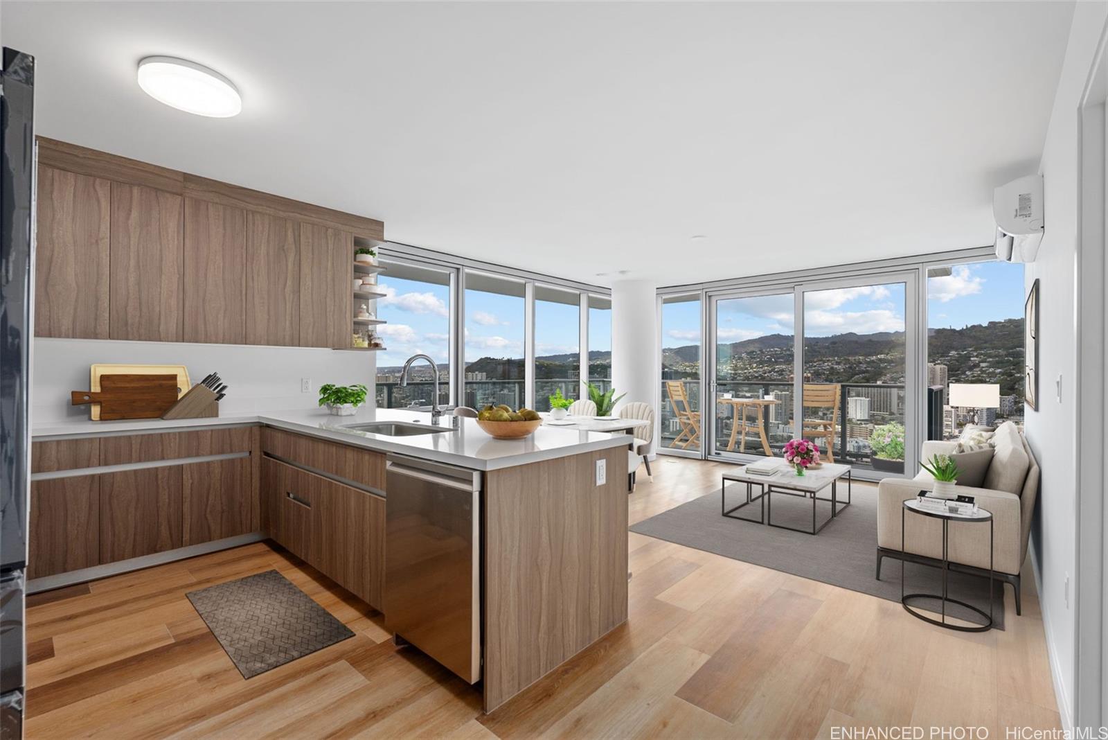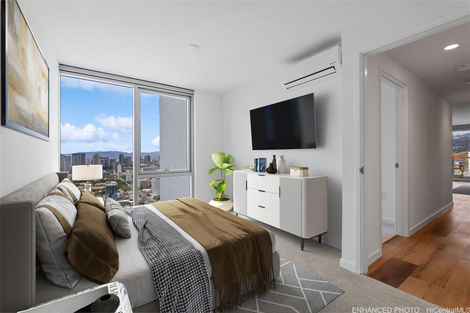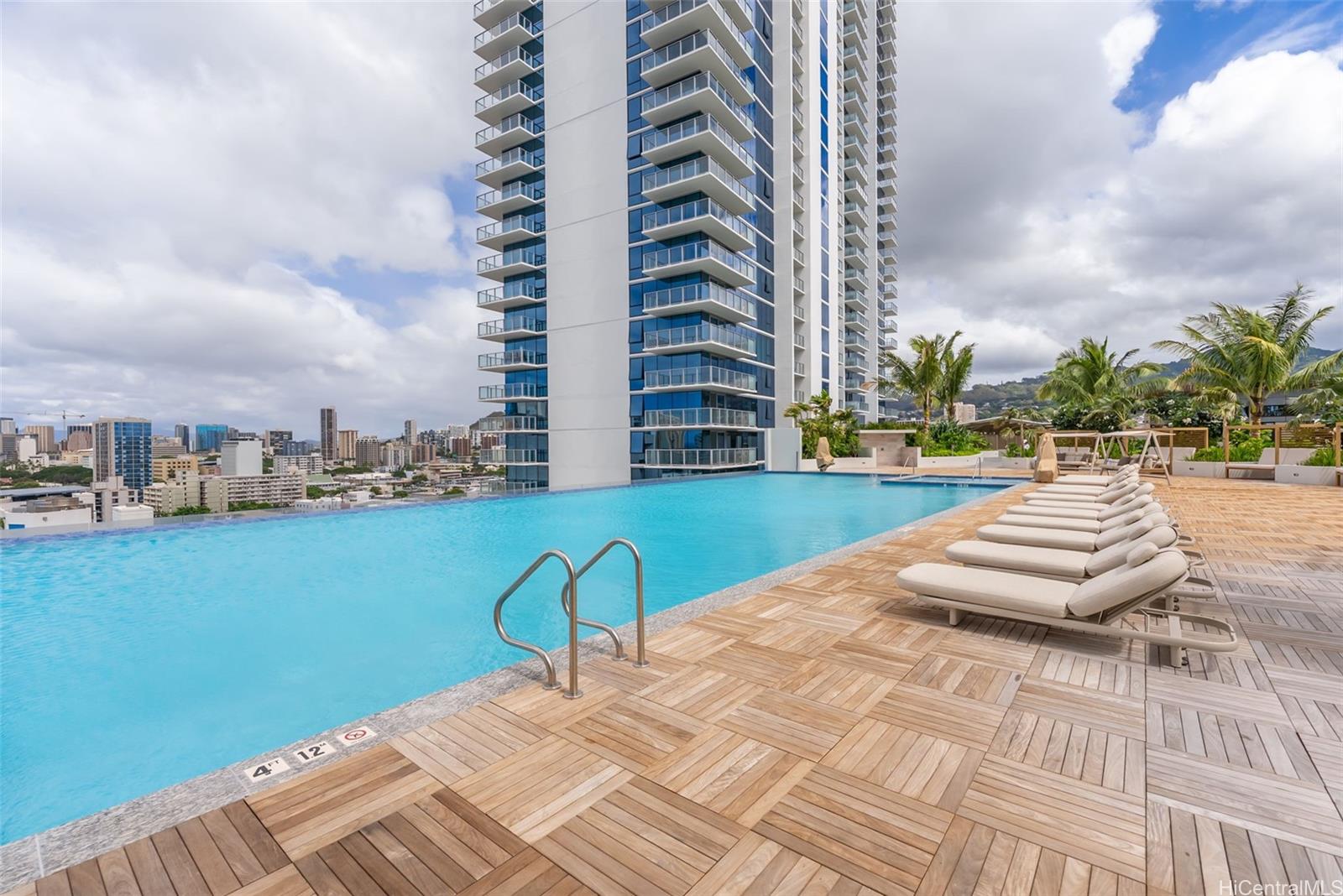 PRICED TO SELL!!! The Park on Keeaumoku’s Liona Tower #3718 is a brand-new 3 bedroom, 2 bath residence with 1,147 sf interior and a rare L-shaped wraparound lanai (186 sf) showcasing 270° views—South Shore Ocean toward Ala Moana, the full Ewa coastline, mountains, sunsets, and even eastward toward UH with a peek of Koko Head. Situated high on the preferred 18 stack, this home is one of only 40 3-bedroom/2-bath units across both Liona and Rycroft Towers, underscoring its rarity and value. The open layout features floor-to-ceiling windows and luxury vinyl plank flooring that maximize light and views. The kitchen offers quartz countertops, stainless steel appliances, and designer fixtures, while bedrooms include plush carpet. Bathrooms are finished with quartz and LED medicine cabinets. A quiet, efficient split AC provides year-round comfort. Pet-friendly and secure, the building offers resort-style amenities: infinity pool, spa, movie theater, fitness center with sauna and yoga room, BBQ pavilions, landscaped decks, 24/7 security, covered parking, bike storage, and EV charging. A few photos have been virtually staged(enhanced). Listing by: REMAX Hawaii (808) 382-7286