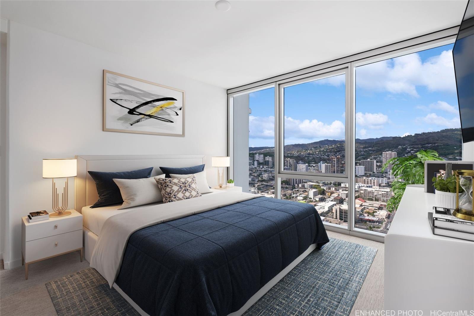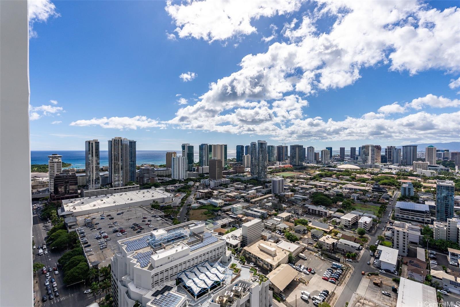 [0] => PRICED TO SELL!!! The Park on Keeaumoku’s Liona Tower #3718 is a brand-new 3 bedroom, 2 bath residence with 1,147 sf interior and a rare L-shaped wraparound lanai (186 sf) showcasing 270° views—South Shore Ocean toward Ala Moana, the full Ewa coastline, mountains, sunsets, and even eastward toward UH with a peek of Koko Head. Situated high on the preferred 18 stack, this home is one of only 40 3-bedroom/2-bath units across both Liona and Rycroft Towers, underscoring its rarity and value. The open layout features floor-to-ceiling windows and luxury vinyl plank flooring that maximize light and views. The kitchen offers quartz countertops, stainless steel appliances, and designer fixtures, while bedrooms include plush carpet. Bathrooms are finished with quartz and LED medicine cabinets. A quiet, efficient split AC provides year-round comfort. Pet-friendly and secure, the building offers resort-style amenities: infinity pool, spa, movie theater, fitness center with sauna and yoga room, BBQ pavilions, landscaped decks, 24/7 security, covered parking, bike storage, and EV charging. A few photos have been virtually staged(enhanced).
