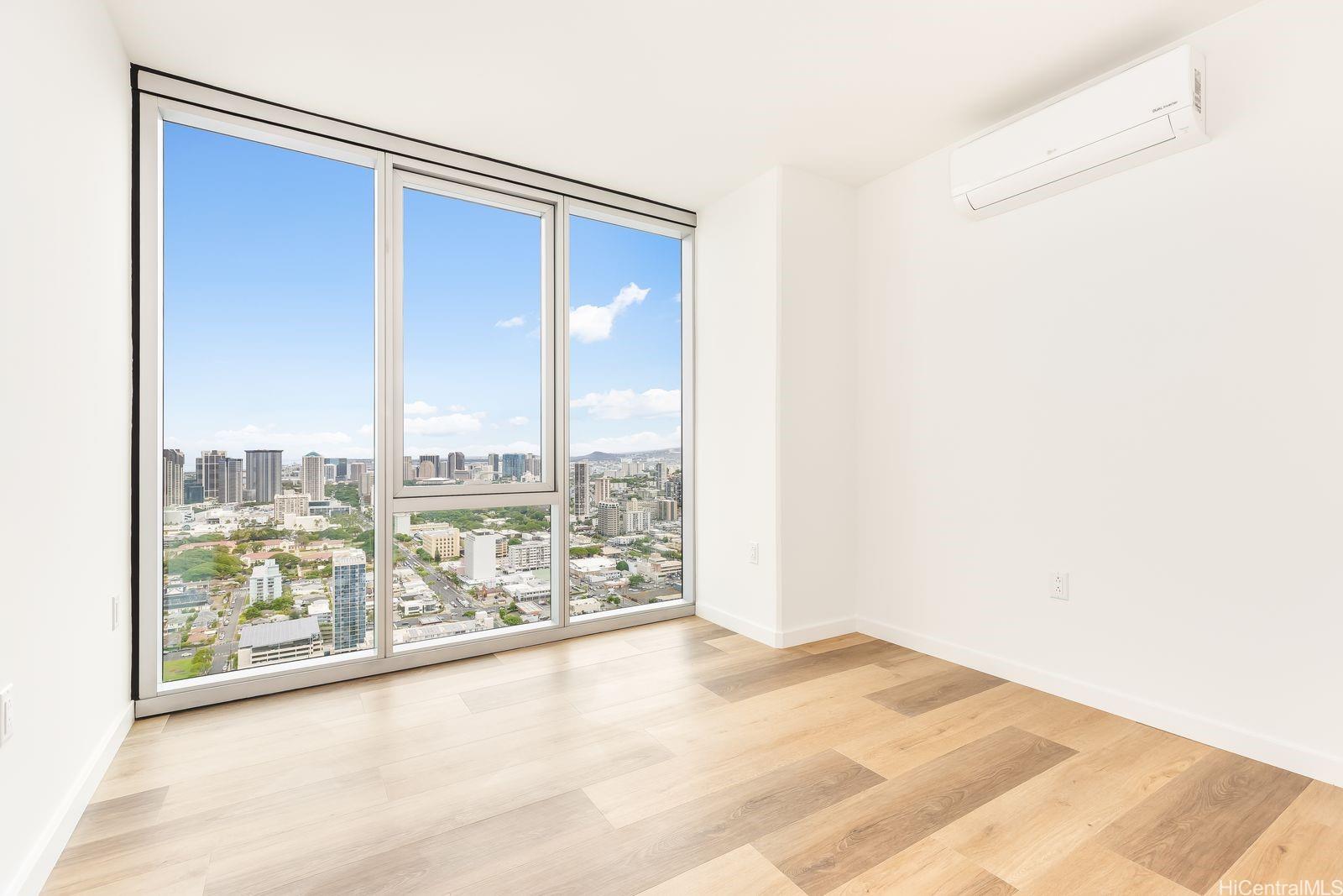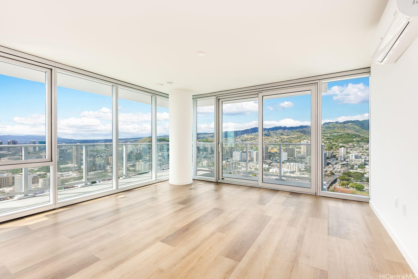 Most desired 3 bedroom 2 bath #4318 in the Liona Tower. Only 20 3 bedroom units available. Luxury living with a L-shaped lanai and floor to ceiling glass view windows offering a spectacular 180 plus degree view from the ocean to the mountains. Enjoy the wonderful sunsets and the beautiful city lights at night. High quality quartz kitchen countertops, designer fixtures, and split A/C system. Upgraded with high quality flooring throughout.