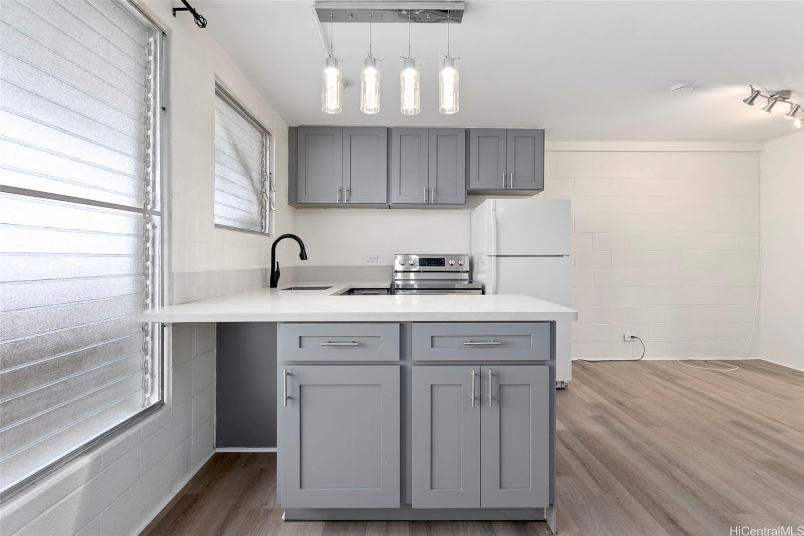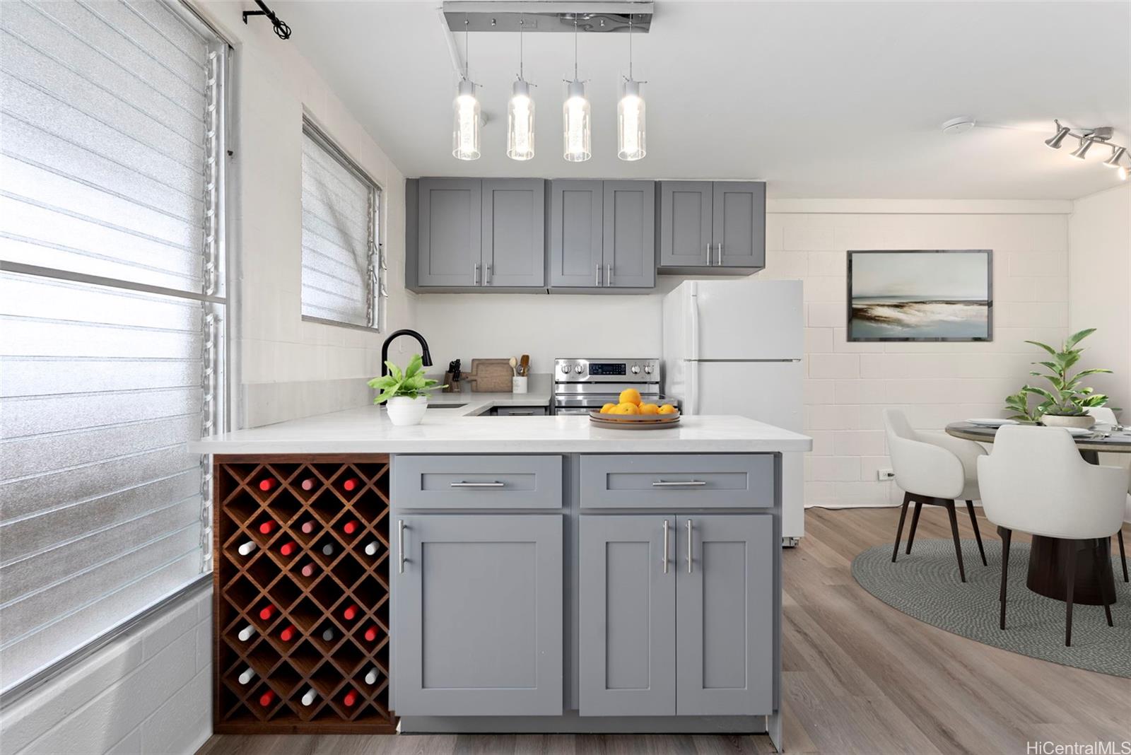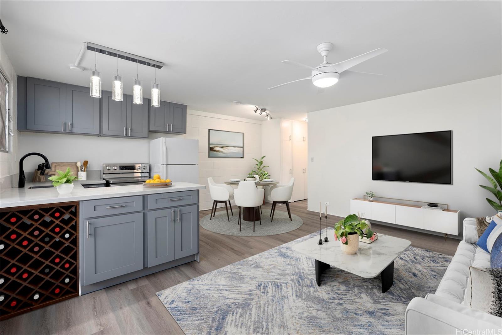 Rarely available - don't miss your chance at Punahou Park Place! This renovated 1-bedroom, 1-bath with 1 partially covered parking stall is move-in ready and packed with upgrades. A sleek, remodeled kitchen thoughtfully opened to overlook the living and dining areas, featuring glass pendant lighting, quartz countertops, and additional cabinetry. The home also offers an updated bathroom, vinyl plank flooring throughout, refreshed lighting and ceiling fans, bedroom AC, and the complete removal of all popcorn ceilings! Bright and breezy with lots of windows, this unit offers extra privacy and a lanai overlooking Makiki Neighborhood Park and community garden. Conveniently located near UH Manoa, Kapiolani Medical Center, Ala Moana, shopping, dining, and freeway access. Perfect for first-time buyers or savvy investors. This one won't last long! *Building has 100% hurricane coverage.* Listing by: Homes of Hawai'i Real Estate (808) 729-4414