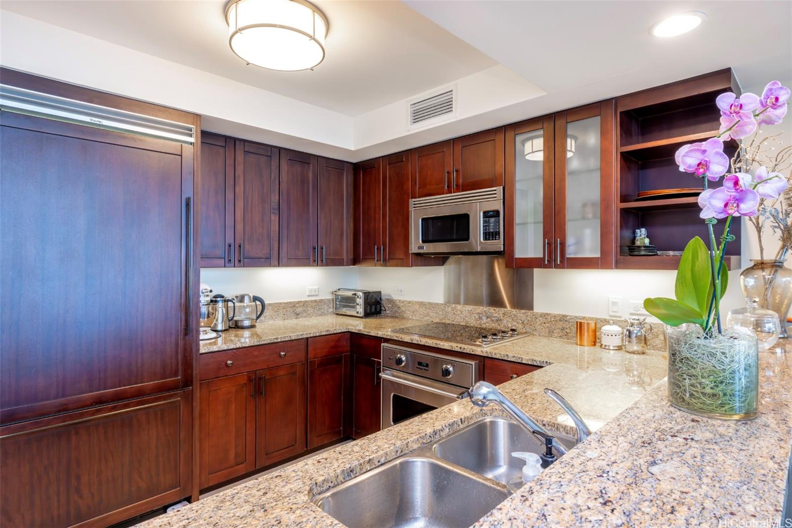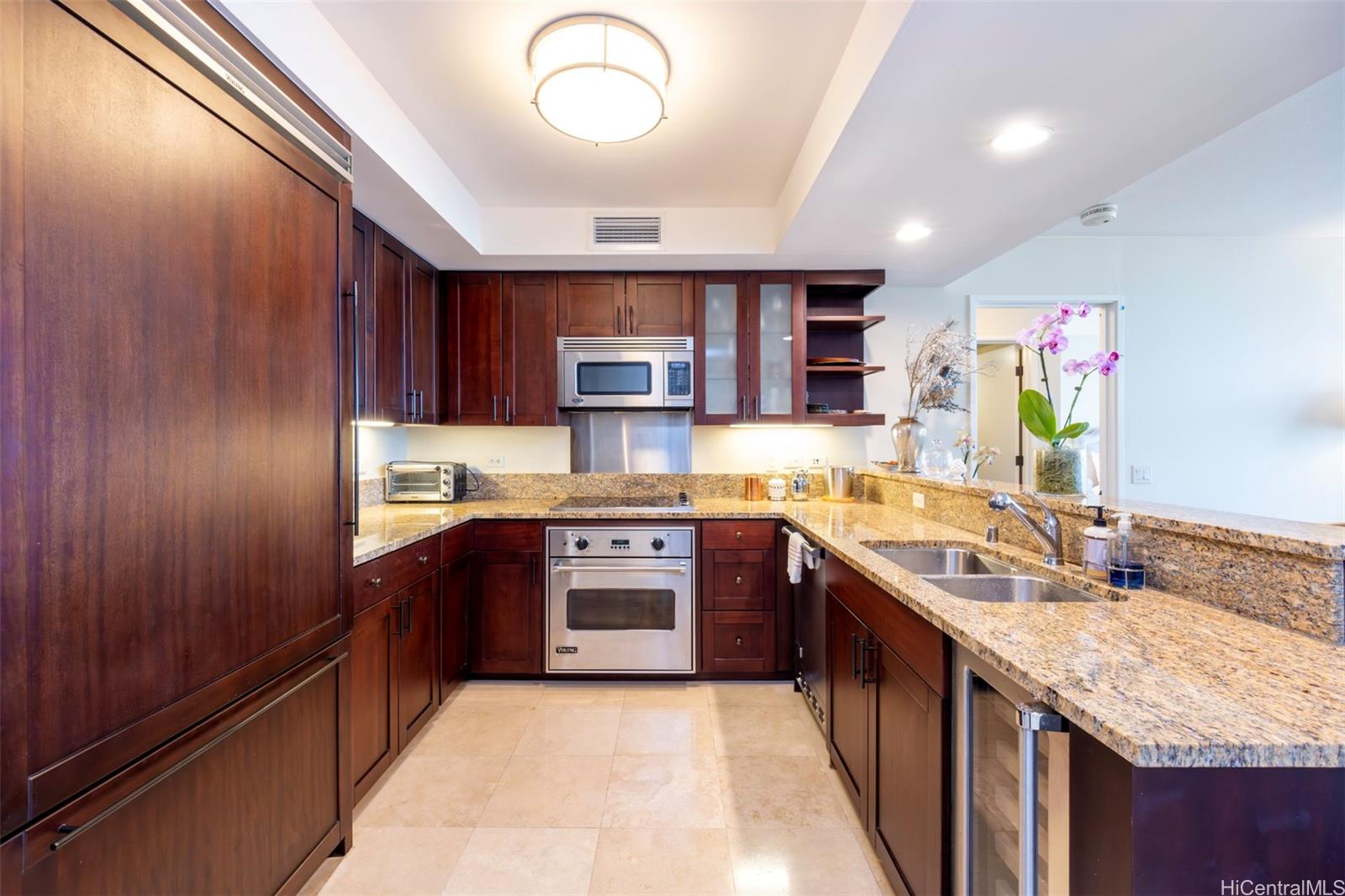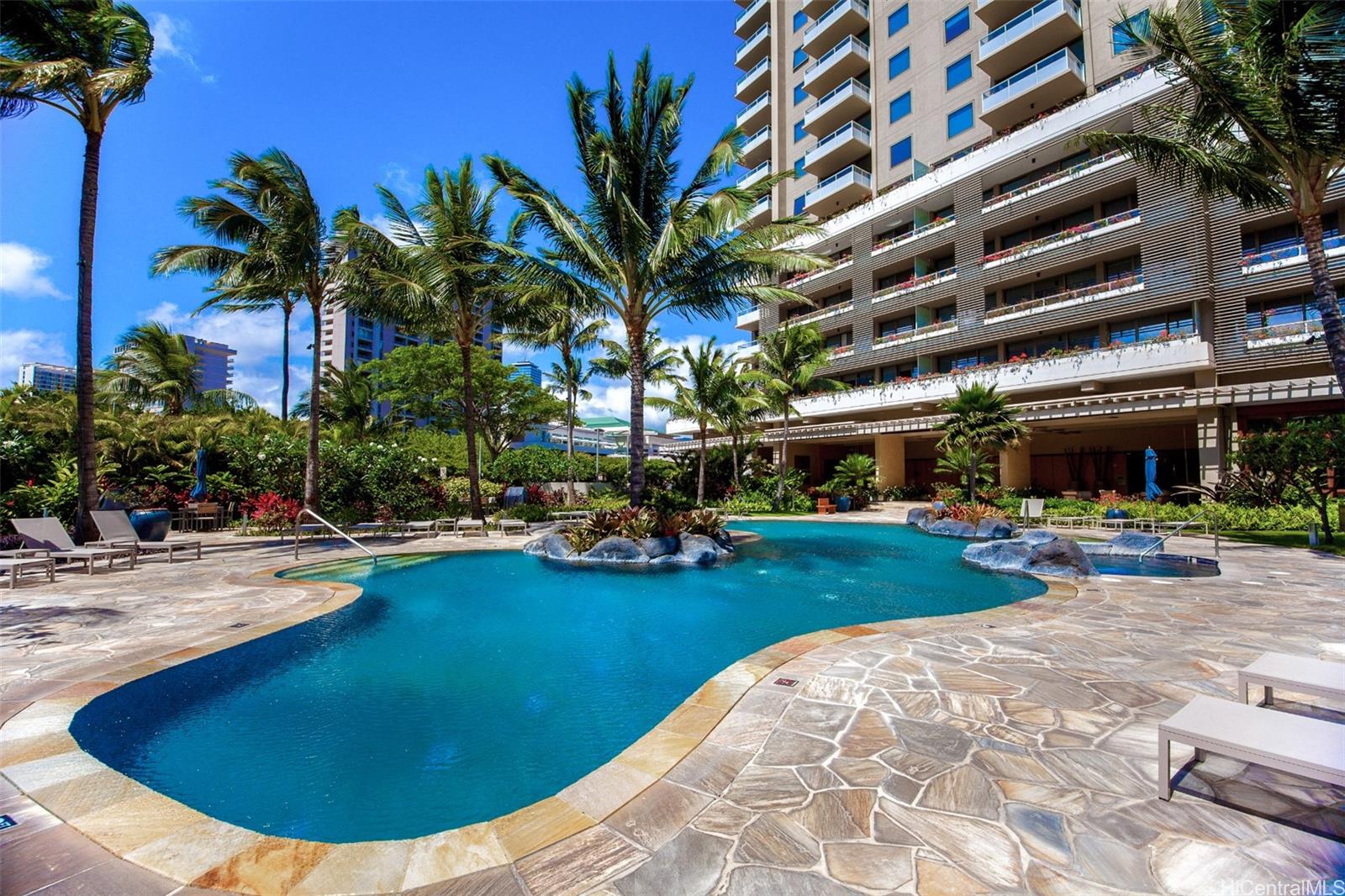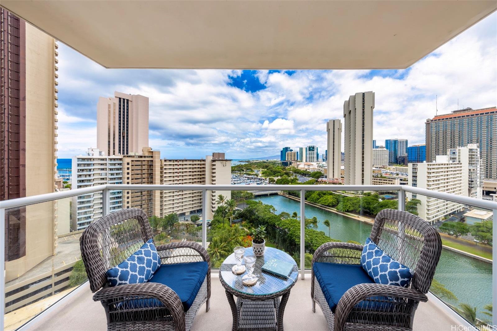 Situated at the entrance of Waikiki, The Watermark is one of Honolulu's most established luxury condominium destinations. This 2-bedroom, 2-bath residence shows incredible pride of ownership throughout. Step inside and be greeted by captivating Pacific Ocean, Marina, and Beach Park views from your primary living area, lanai space, and both bedrooms. This residence features an open-concept living experience with a designer kitchen clad in Viking appliances, spacious main living room area opening up to your private lanai, plus two large bedrooms, including a primary suite with a true resort-style ensuite bath. On-site resort amenities include a saltwater swimming pool, Jacuzzi tub, sauna, multiple barbecue spaces, tropically landscaped paths and yard spaces, exercise room, and more. The Watermark is sits just minutes to all-things Waikiki, Ala Moana, and Kaka'ako, putting near-endless options for dining, shopping, entertainment, beach and water activities at your convenience. Discover Paradise, Found at The Watermark #1605. Listing includes enhanced, zoomed-in photos. Listing by: Sachi HI Pacific Century Prop. (808) 596-8801