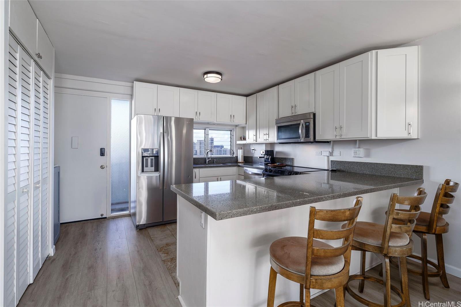 Town living at its finest from this high floor, premium “01” corner unit at Makiki Towers. This renovated 2-bedroom, 1.5 bathroom has all the modern upgrades: fully renovated in 2014 and upgraded with vinyl plank flooring, new paint, and popcorn ceiling removal in 2023. Enjoy cool breezes and beautiful mountain views from the lanai. Ready to move in with combined washer-dryer, covered parking, and additional storage locker. Award Winning Building and Management, Makiki Towers is a hidden gem with a pool, bbq areas, landscaped walking paths, and more. Walking distance to Punahou, Maryknoll, and a few minute drive to everything town has to offer. Listing by: Coldwell Banker Realty (808) 258-8258
