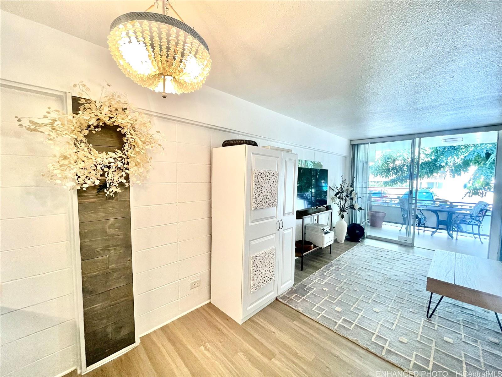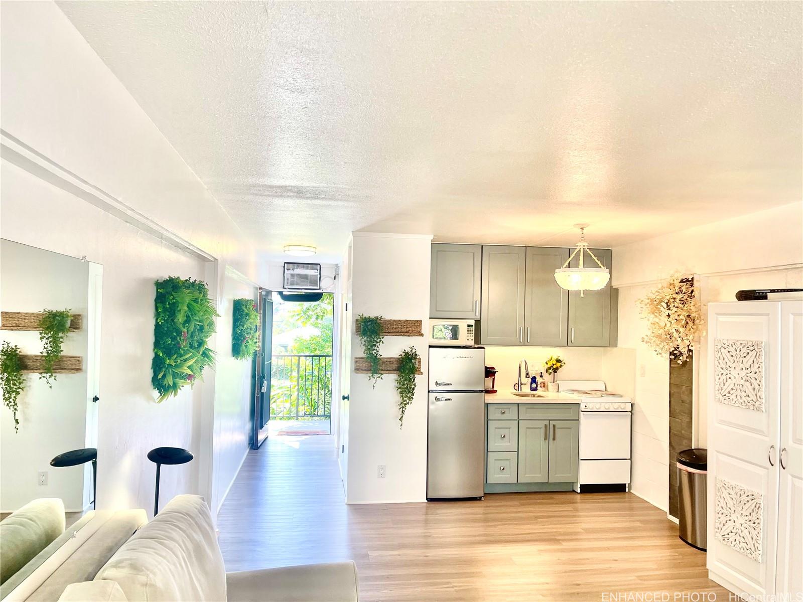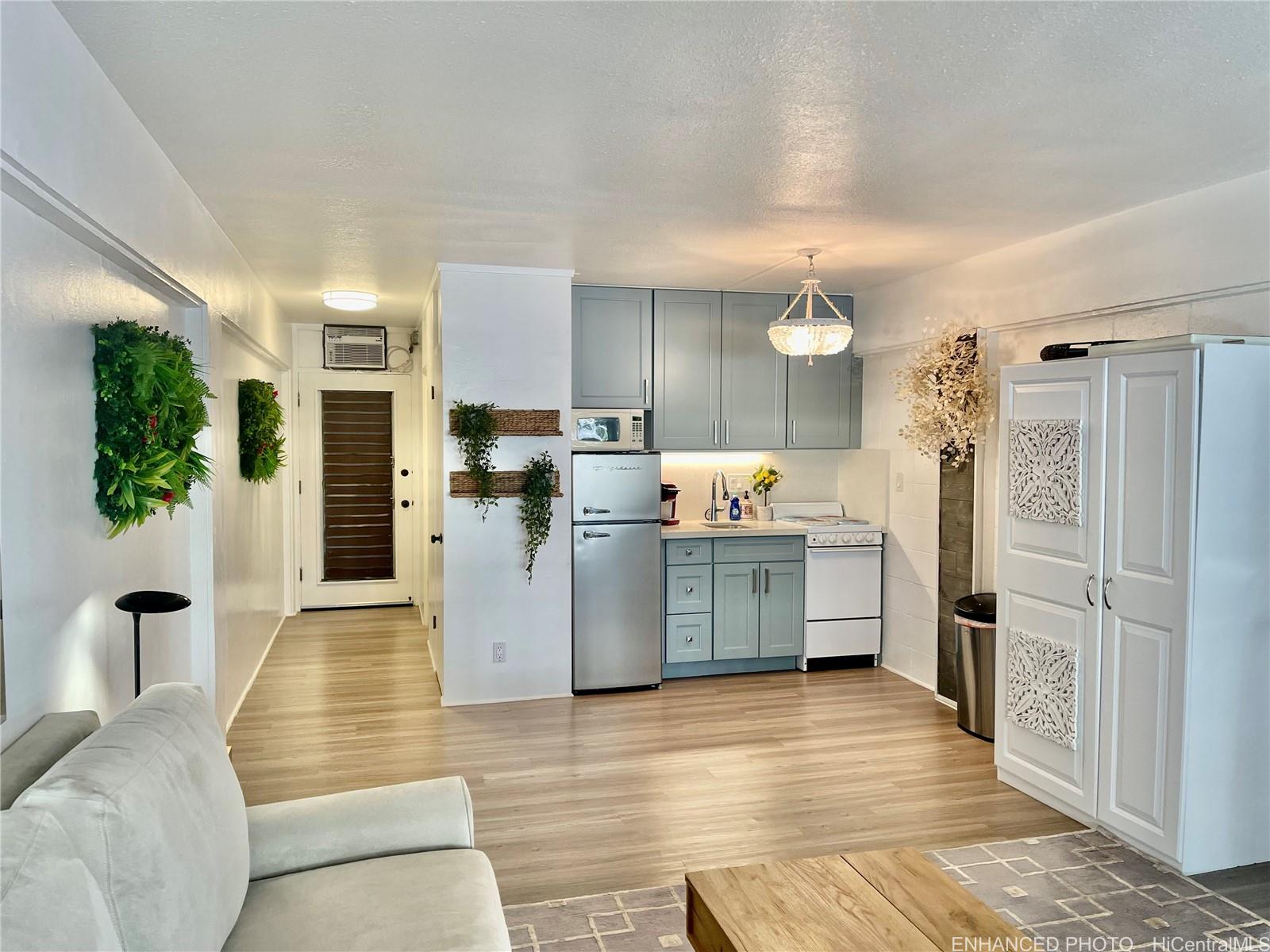 string(1204) "RARE HAWAII STYLE INDOOR/OUTDOOR LIVING ! LARGE OPEN LIVING SPACES AND HUGE COVERED LANAI ! RENOVATED APT. Preferred, corner apt. a in quaint Makiki Boutique building surrounded by single family homes and condos. Apt has a townhouse feel with EASY access directly to your end unit's front door via 2nd floor staircase. X-LG covered lanai runs entire width of apt. with a privacy divider and relaxing treetop, city, mountain views. “Dine in” while dining out on the shaded lanai, meditate, exercise, or relax and surf the web. Roomy floor plan has just under 500 Sq. ft. total combined indoor/outdoor. High ceilings with floor to ceiling windows. Soft blue hued wooden kitchen cabinets, White Quartz countertops & back splash, Vinyl plank flooring, wall mirrors.Painted & re-textured ceiling (No popcorn). X-Lg. bathroom w/storage cabinet, re-glazed bathroom tiles w/a combo shower and Zen soaking tub.Detached wardrobe armoire.Swim at the pool while doing laundry nearby. Air conditioner. Near major bus lines, Punahou school, UH, Ala Moana shopping, downtown.No assigned parking.Street parking only.High owner occupancy.Res.manager.Pets Cat/bird ok verify.Enhanced photos. 1031 Ex. See UPGRADES list"