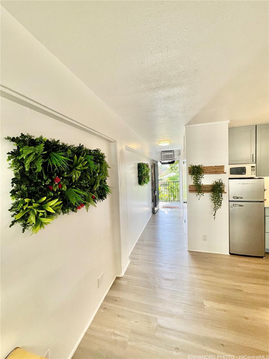 [0] => RARE HAWAII STYLE INDOOR/OUTDOOR LIVING ! LARGE OPEN LIVING SPACES AND HUGE COVERED LANAI ! RENOVATED APT. Preferred, corner apt. a in quaint Makiki Boutique building surrounded by single family homes and condos. Apt has a townhouse feel with EASY access directly to your end unit's front door via 2nd floor staircase. X-LG covered lanai runs entire width of apt. with a privacy divider and relaxing treetop, city, mountain views. “Dine in” while dining out on the shaded lanai, meditate, exercise, or relax and surf the web. Roomy floor plan has just under 500 Sq. ft. total combined indoor/outdoor. High ceilings with floor to ceiling windows. Soft blue hued wooden kitchen cabinets, White Quartz countertops & back splash, Vinyl plank flooring, wall mirrors.Painted & re-textured ceiling (No popcorn). X-Lg. bathroom w/storage cabinet, re-glazed bathroom tiles w/a combo shower and Zen soaking tub.Detached wardrobe armoire.Swim at the pool while doing laundry nearby. Air conditioner. Near major bus lines, Punahou school, UH, Ala Moana shopping, downtown.No assigned parking.Street parking only.High owner occupancy.Res.manager.Pets Cat/bird ok verify.Enhanced photos. 1031 Ex. See UPGRADES list