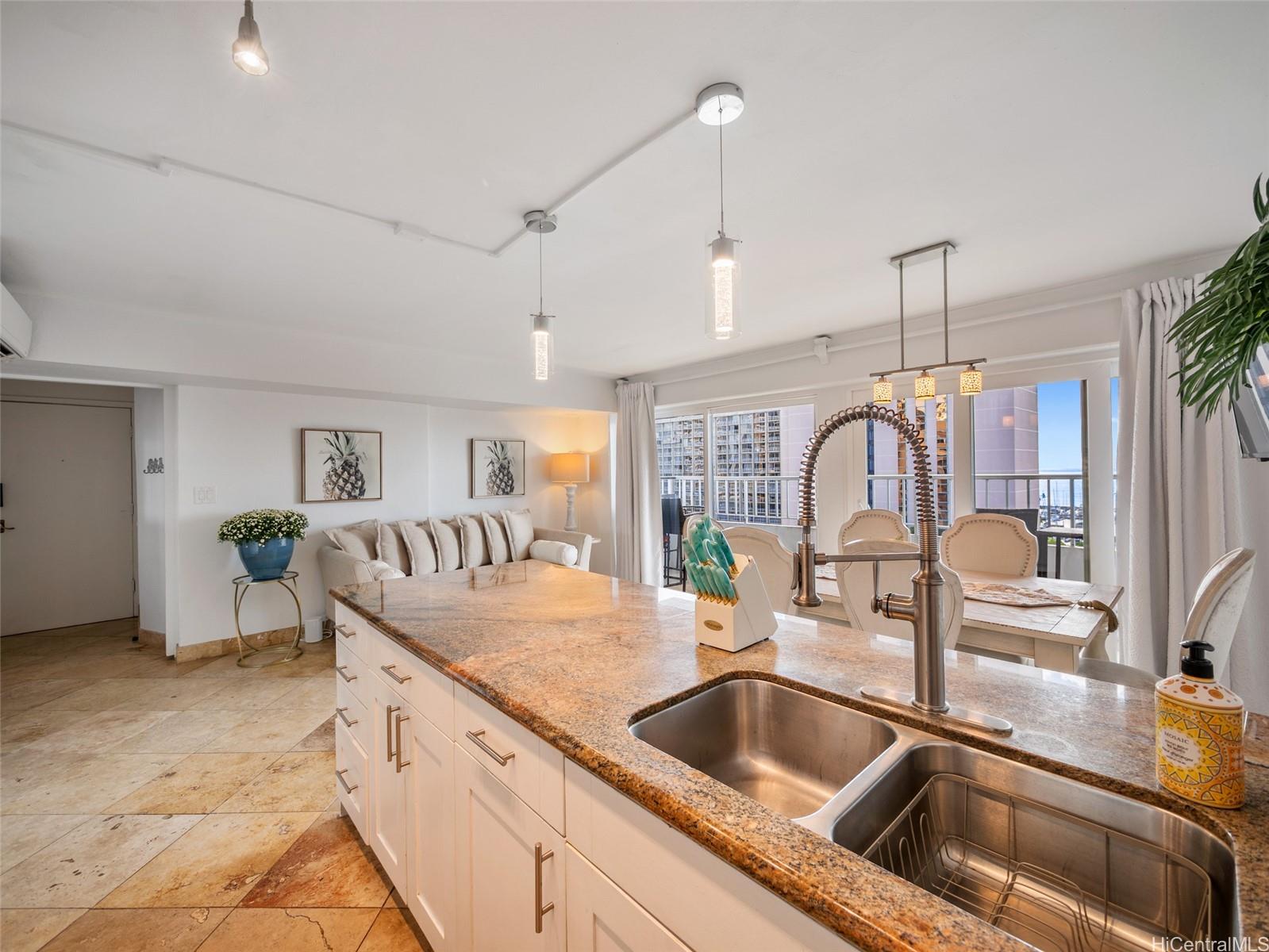 [0] => Welcome to a rare opportunity in Waikiki! This upgraded, versatile corner unit offers unmatched flexibility, modern upgrades, and outstanding rental income potential. With two separate exterior entrances, this property can be configured as a spacious 3-bedroom/3-bath or split into a 2-bedroom/2 bathroom, plus studio/1 bathroom. Live in one and rent the other, or rent both separately or rent the entire unit as one! The designer kitchen features granite countertops, stylish backsplashes, and top of the line appliances. The open floor plan and 3 separate lanais, allowing for good cross breeze, showcasing stunning views of the ocean, mountains, city and Ala Wai Canal. Located at the gateway to Waikiki and Ala Moana, you're just a short stroll from world class beaches, surf spots, yacht club, Ala Moana Shopping Center, restaurants, nightlife, convention center and so much more. This pet-friendly, VA-approved boutique building also includes split AC and a covered, lobby-level parking stall. Whether you're an investor or an owner-occupant seeking flexibility, this is truly a must-see property in one of Oahu’s most sought-after locations!