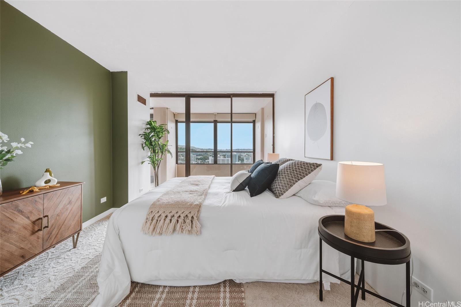 The spacious lanai extends the living area and provides a front-row perspective of Diamond Head, mountain, and city skyline views, highlighted by sunsets and frequent rainbows. Motorized shades allow the space to be comfortably enclosed while still enjoying natural light and fresh air.