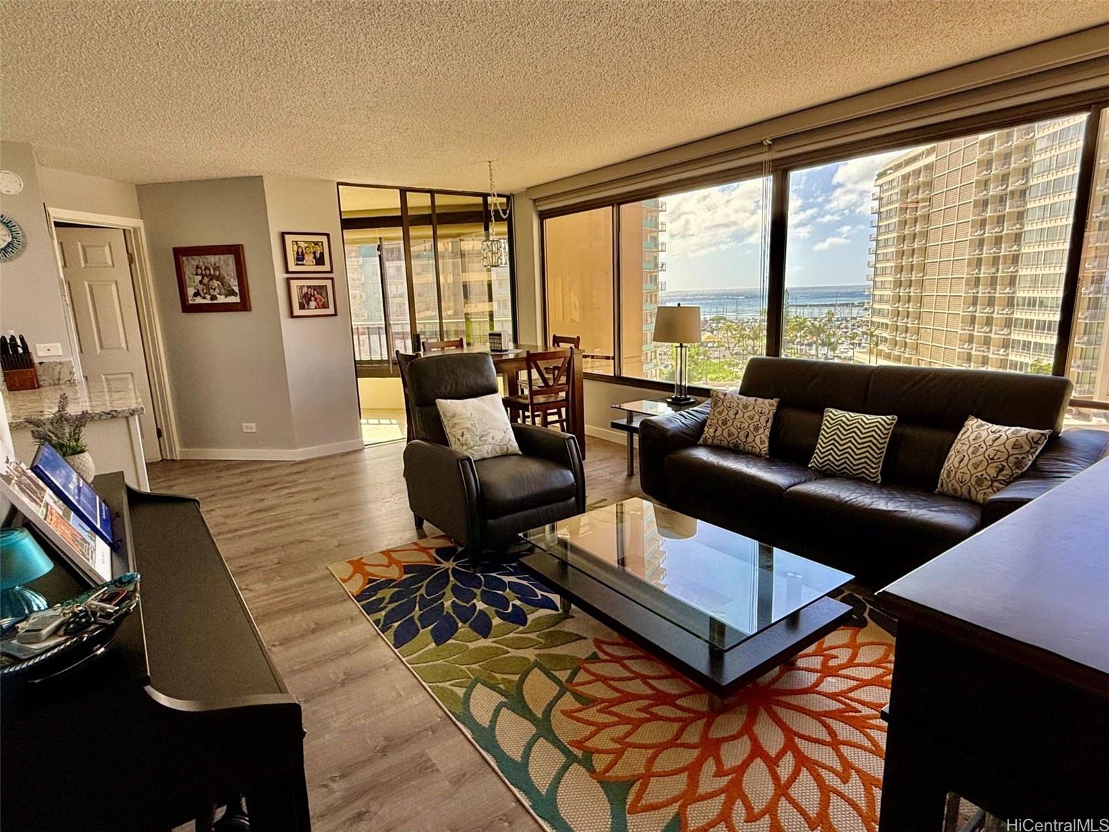 Welcome to Discovery Bay, where resort-style living meets the convenience of Waikiki and Ala Moana. This beautifully maintained 2-bedroom, 2-bath corner unit offers a bright, open floor plan with large windows that capture city and partial ocean views, filling the space with natural light and gentle trade winds. The unit features modern tile flooring throughout, a reconfigured kitchen layout with upgraded cabinets and countertops, and refreshed bathroom finishes for a clean, contemporary feel. Decorative new room and closet doors add a stylish touch, while the space is rarely used and exceptionally well cared for—occupied only a few weeks each year.