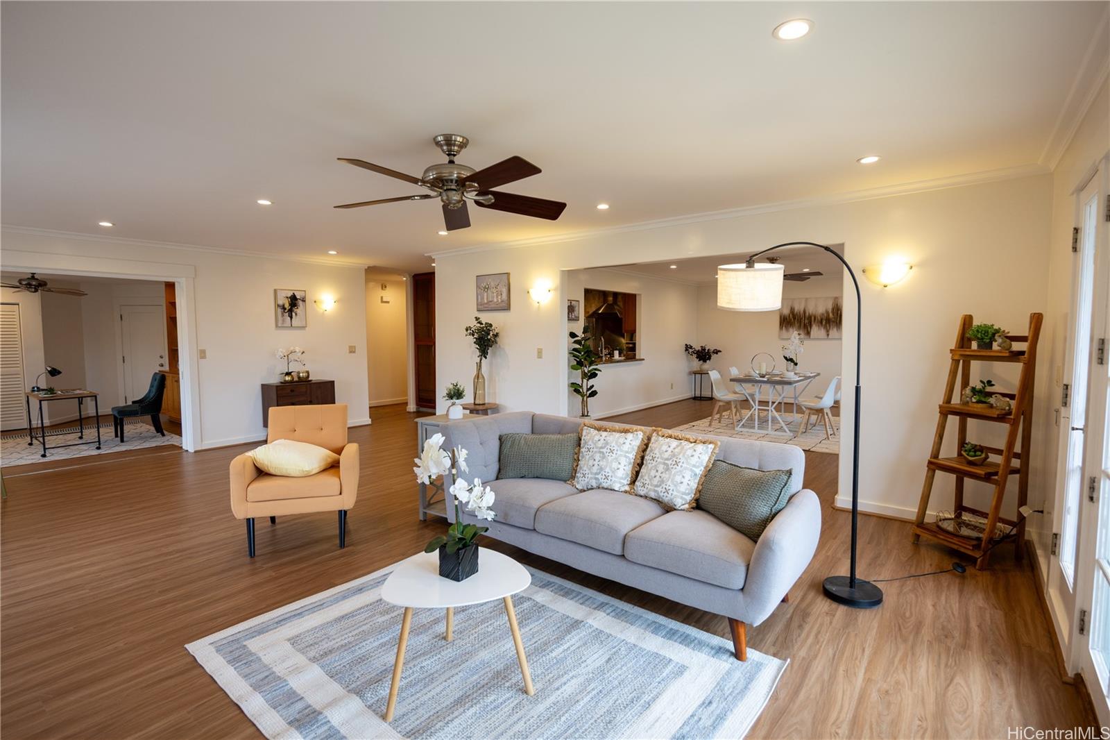 [0] => Spacious family home in Hawaii Kai’s highly coveted Triangle neighborhood. This 4-bedroom, 3-bathroom residence offers a functional and versatile floor plan ideal for multi-generational living or a home office, featuring two primary suites and an additional den. The home is move-in ready with brand-new flooring in the expansive living room and a fresh coat of paint throughout the interior.