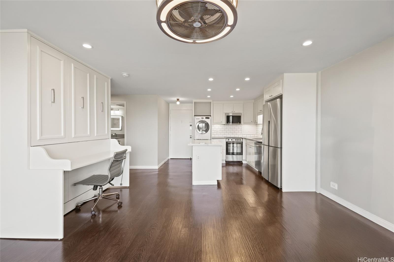 string(1128) "Step into the luxurious Kemoo By the Lake #810—a fully remodeled modern studio with a 98 sq ft lanai showcasing serene mountain views and postcard sunsets. This designer space features a chef-inspired kitchen with quartz countertops, subway tile walls, a River White island, & a full suite of premium stainless appliances including full-sized Haier quad-door refrigerator, Blomberg convection range, Midea dishwasher, convection oven microwave, & touchless faucet. Enjoy in-unit laundry, beautifully integrated with cabinetry and high-efficiency LG washer/dryer. The spa-quality bathroom impresses with floor-to-ceiling quartz, KOHLER cast-iron soaking tub with glass doors, double-sink vanity, LED anti-fog mirror, & premium Delta fixtures. A sleek Murphy wall bed with desk, recessed LED lighting, luxury vinyl plank flooring, air conditioning, smooth-finished walls/ceiling & smart Schlage keypad lock elevate everyday comfort.Perfectly located across from Schofield Barracks with easy freeway access—modern living, maximum convenience, and exceptional upgrades throughout. (see supplements for complete Renovation List)."