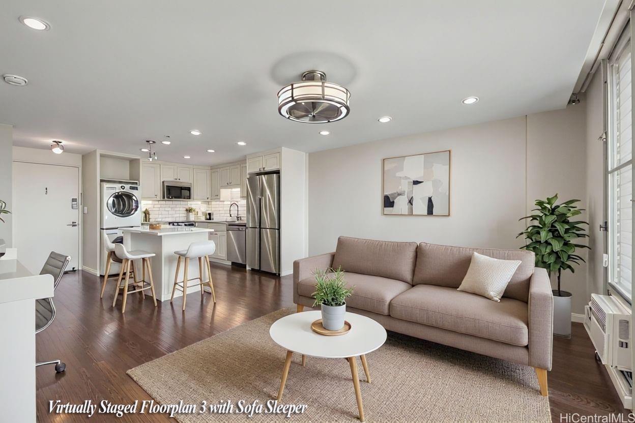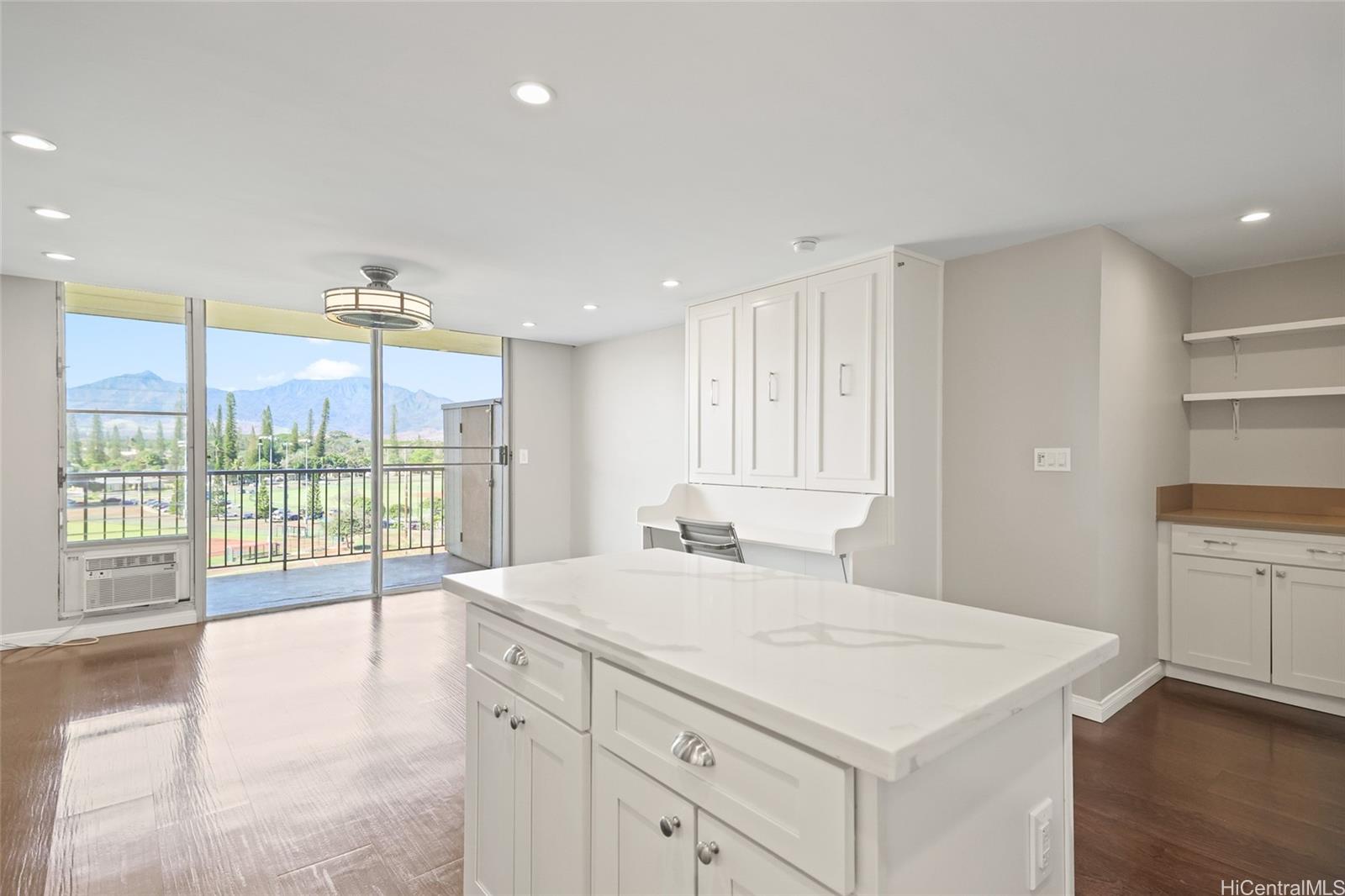 Step into the luxurious Kemoo By the Lake #810—a fully remodeled modern studio with a 98 sq ft lanai showcasing serene mountain views and postcard sunsets. This designer space features a chef-inspired kitchen with quartz countertops, subway tile walls, a River White island, & a full suite of premium stainless appliances including full-sized Haier quad-door refrigerator, Blomberg convection range, Midea dishwasher, convection oven microwave, & touchless faucet. Enjoy in-unit laundry, beautifully integrated with cabinetry and high-efficiency LG washer/dryer. The spa-quality bathroom impresses with floor-to-ceiling quartz, KOHLER cast-iron soaking tub with glass doors, double-sink vanity, LED anti-fog mirror, & premium Delta fixtures. A sleek Murphy wall bed with desk, recessed LED lighting, luxury vinyl plank flooring, air conditioning, smooth-finished walls/ceiling & smart Schlage keypad lock elevate everyday comfort.Perfectly located across from Schofield Barracks with easy freeway access—modern living, maximum convenience, and exceptional upgrades throughout. (see supplements for complete Renovation List). Listing by: Coldwell Banker Island Prop (808) 263-7422