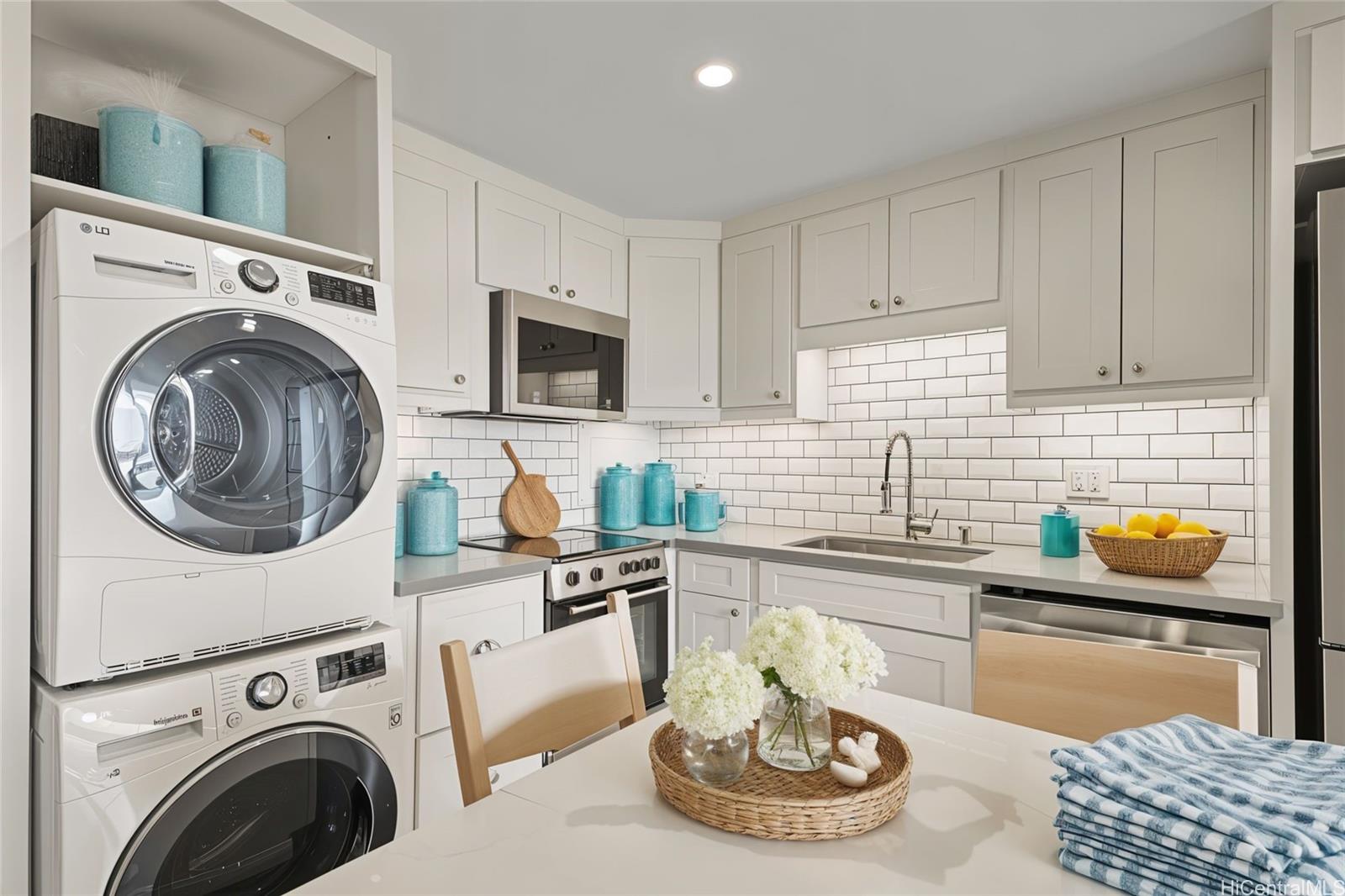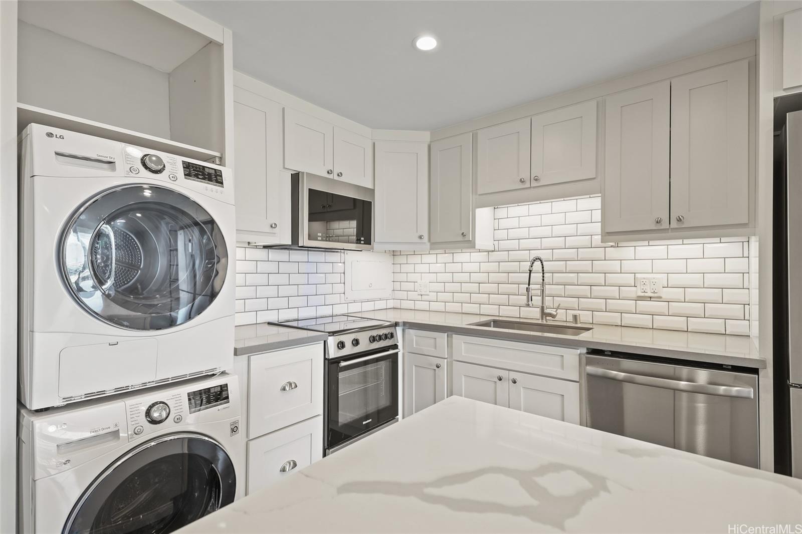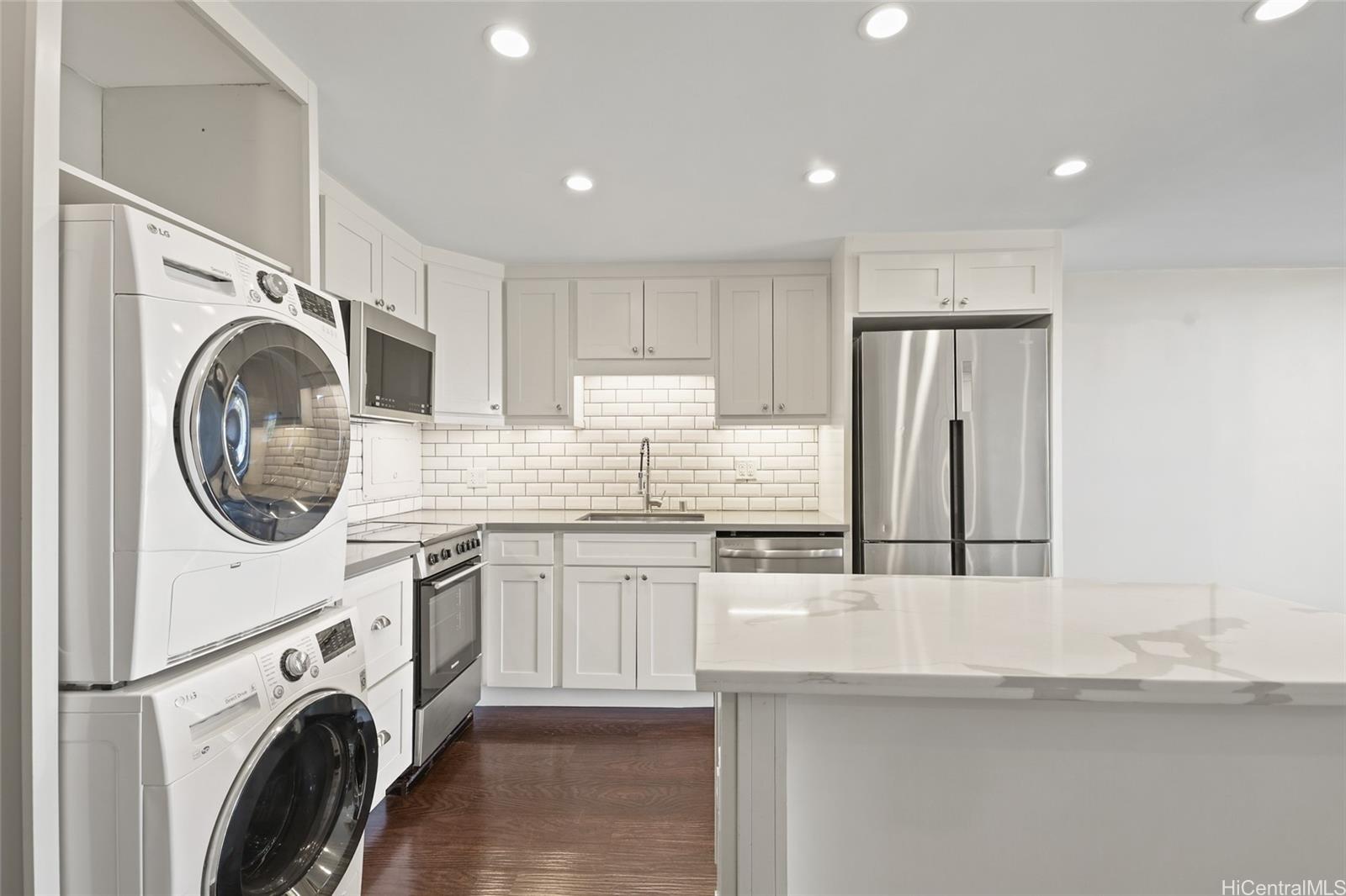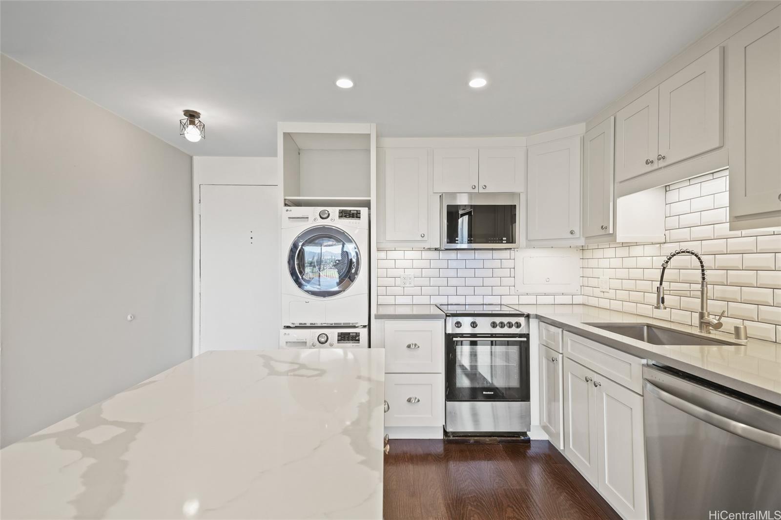 [0] => Step into the luxurious Kemoo By the Lake #810—a fully remodeled modern studio with a 98 sq ft lanai showcasing serene mountain views and postcard sunsets. This designer space features a chef-inspired kitchen with quartz countertops, subway tile walls, a River White island, & a full suite of premium stainless appliances including full-sized Haier quad-door refrigerator, Blomberg convection range, Midea dishwasher, convection oven microwave, & touchless faucet. Enjoy in-unit laundry, beautifully integrated with cabinetry and high-efficiency LG washer/dryer. The spa-quality bathroom impresses with floor-to-ceiling quartz, KOHLER cast-iron soaking tub with glass doors, double-sink vanity, LED anti-fog mirror, & premium Delta fixtures. A sleek Murphy wall bed with desk, recessed LED lighting, luxury vinyl plank flooring, air conditioning, smooth-finished walls/ceiling & smart Schlage keypad lock elevate everyday comfort.Perfectly located across from Schofield Barracks with easy freeway access—modern living, maximum convenience, and exceptional upgrades throughout. (see supplements for complete Renovation List).