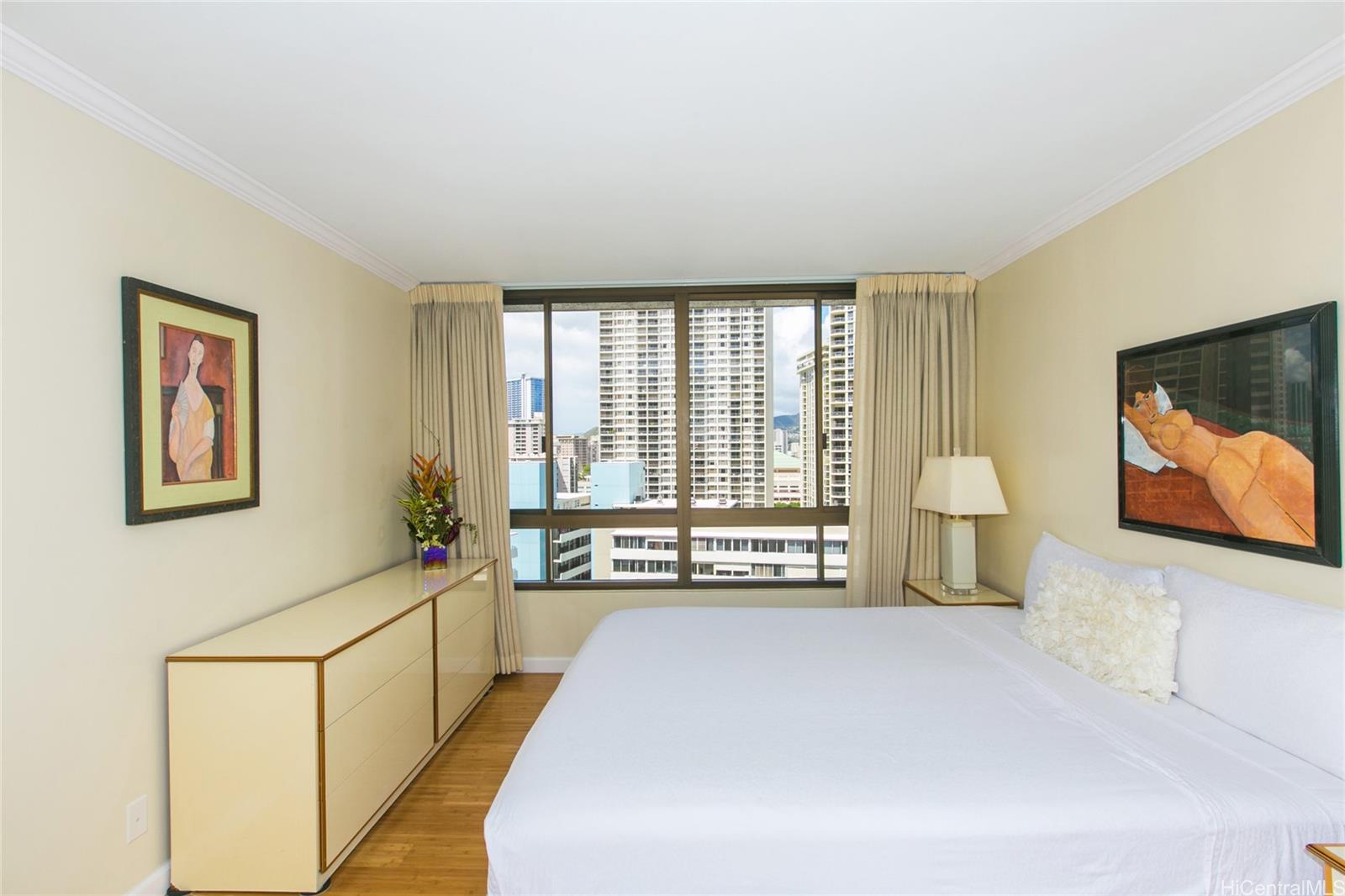 Discover the best value in the prestigious Canterbury Pl. Stunning 2BR/2BA, 2 (TWO) parking stalls gem. Step into an opened-up living space featuring a white and bright kitchen illuminated by energy-efficient LED lighting. Recent renovation includes new bamboo hardwood flooring, elegant tile floors, and crown molding throughout, adding a touch of sophistication to every corner. Enjoy breathtaking views of Fort DeRussy Park, glimpses of Diamond Head and the sparkling ocean. Retreat to the private spacious covered lanai, a perfect spot to indulge in the Friday night fireworks. Only four units per floor ensures privacy and tranquility. Building has 24-hour security and is pet-friendly. Maintenance fee covers central A/C, electricity, cable TV, internet, Wi-Fi, hot water, water, and sewer, adding incredible value and simplifying your life. Conveniently located near premier shopping, renowned restaurants, pristine beaches and vibrant entertainment. The minimum rental is 30 days. Building renovations completed incl painting & spalling. Pet policy: No more than total of 2 dogs, cats, birds. One fish tank not to exceed 75 gal. Multi tanks not to exceed 150 gal. Listing by: Help-U-Sell Honolulu Prop. (808) 255-3220