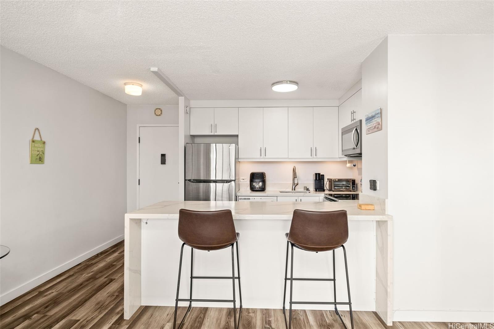 Priced competitively to sell, and seller is very motivated. Great time to make an offer! Lovely condo unit perfectly situated in an excellent location right at the entry point to Waikiki. Completely remodeled in 2022 with quartz countertops, vinyl plank flooring, new paint, new cabinets, and an updated bathroom. Conveniently equipped with a new washer and dryer in the unit. Central AC to keep you cool on hot summer days. Newly renovated rooftop amenities includes pool, men's and women's saunas, showers, restrooms, and a barbeque area. Secured entry, pet friendly, and VA approved building. Sold fully furnished and move in ready. Close proximity to restaurants, shops, parks, beaches, grocery stores, and Ala Moana Mall. Watch the Hilton Hawaiian firework show from the rooftop pool and grill area on Friday nights! 30+ day rentals allowed. Designated oversized, covered, and secure parking stall, with added bonus of guest parking. Includes additional personal storage space, and bike/surf rack available. Current tenant lease ends in August with possibility of renewal. This unit receives multiple rental applications when available. Wonderful investment property! Listing by: Corcoran Pacific Properties (808) 589-2040