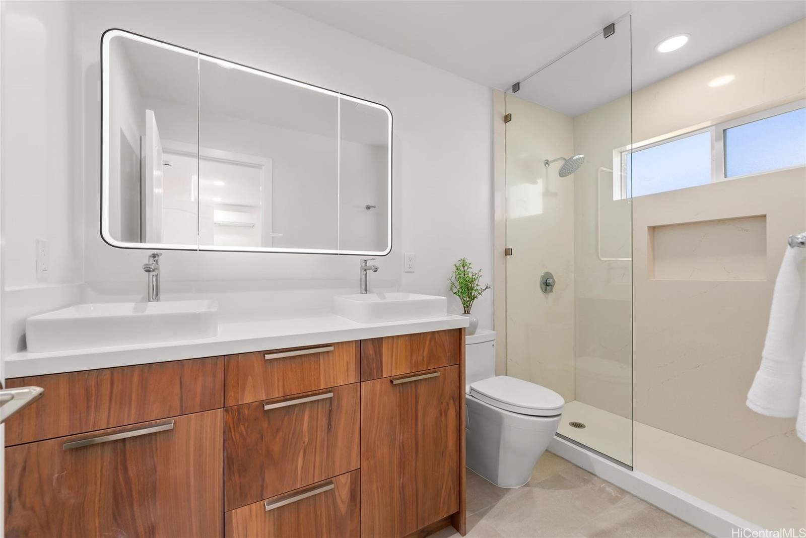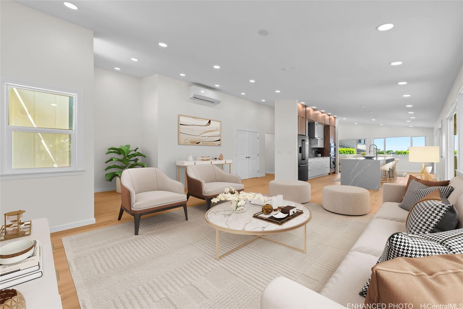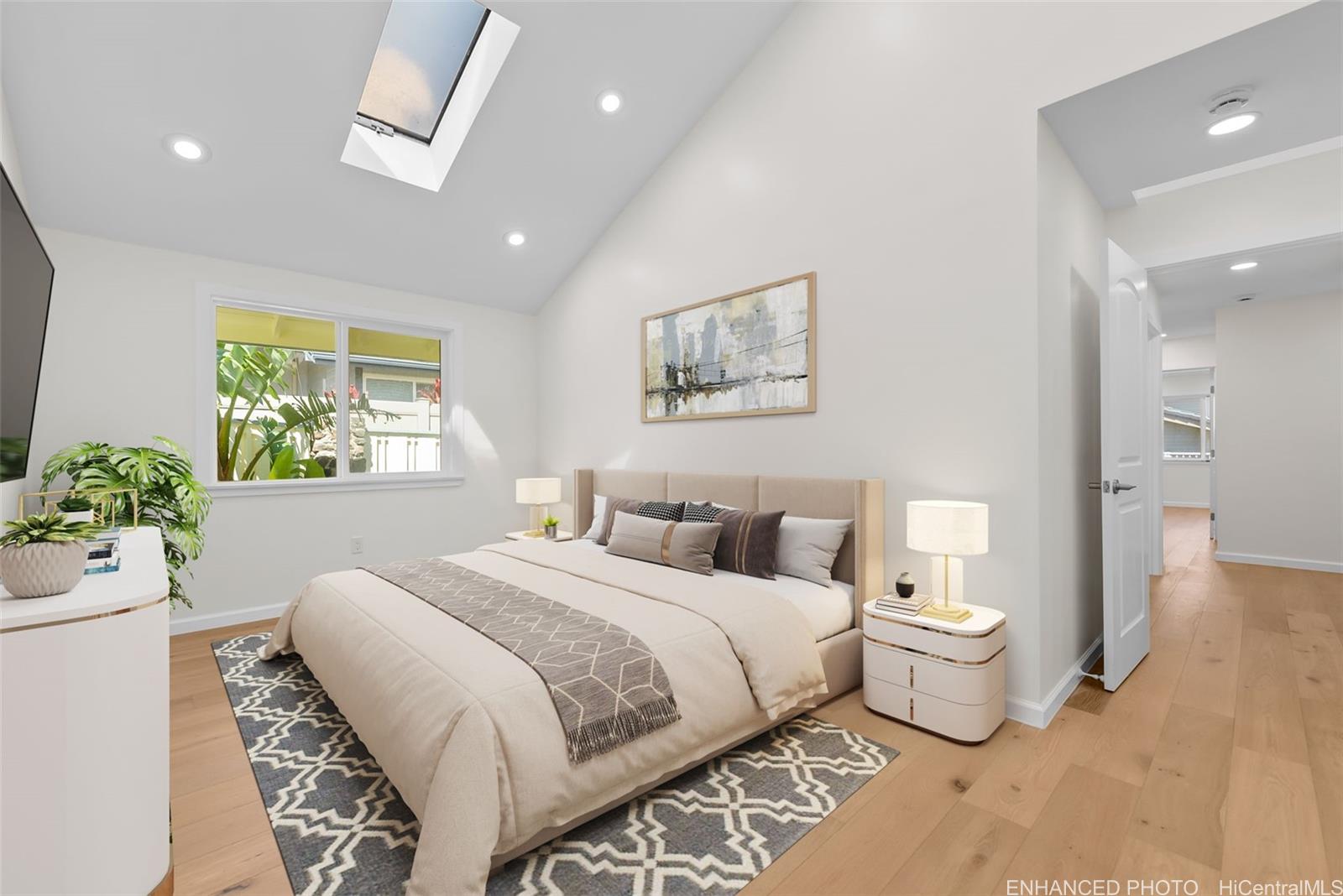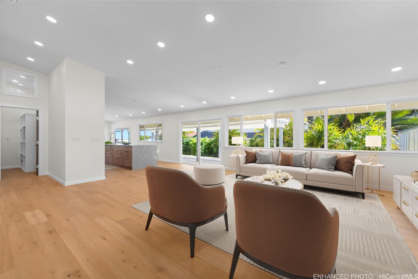 Nestled within the private/gated community of Waialae Iki V, this beautifully fully renovated single-level residence blends contemporary elegance with island living. Featuring three spacious bedrooms and three full bathrooms, this home offers a seamless blend of luxury, functionality, and comfort. Step inside to discover soaring ceilings and rich wood flooring that flows effortlessly throughout the open-concept living spaces. All bathrooms are finished with sleek porcelain tiles, Toto toilets, and frameless glass-enclosed showers, creating a spa-like experience in every suite. At the heart of the home is the designer kitchen outfitted with high-end, natural wood-faced cabinetry, a striking waterfall-style island, and brand-new luxury appliances. Enjoy an abundance of natural light thanks to strategically placed skylights and quality aluminum roof shingles that add both style and durability. The home is surrounded by tropical landscaping with an open lawn, covered lanai, and an expansive open deck—perfect for indoor-outdoor living and entertaining. Listing by: Penthouse Realty Corporation (808) 387-8000